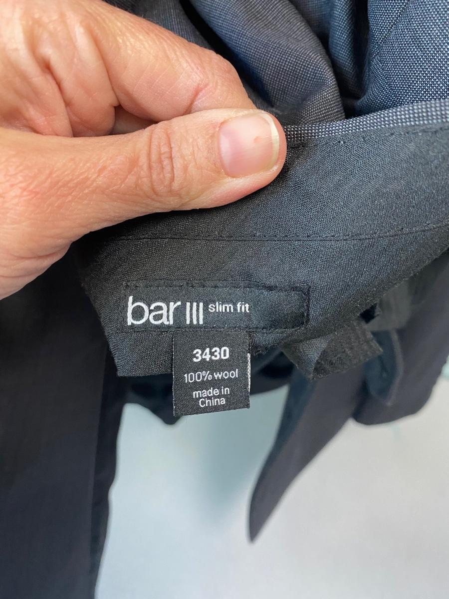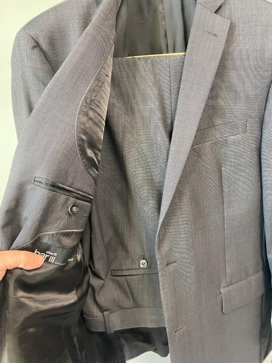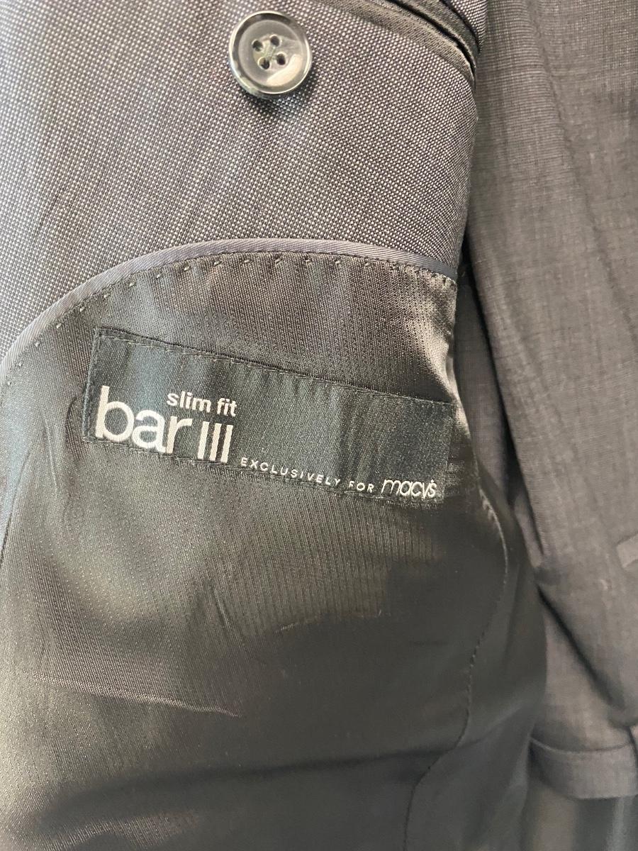 Slim Fit Bar III Grey Men's Suit from Macy's. Includes jacket, pants, and tie. Jacket does not have a size tag but hanger says 42r, pants are a size 34. Good condition.
