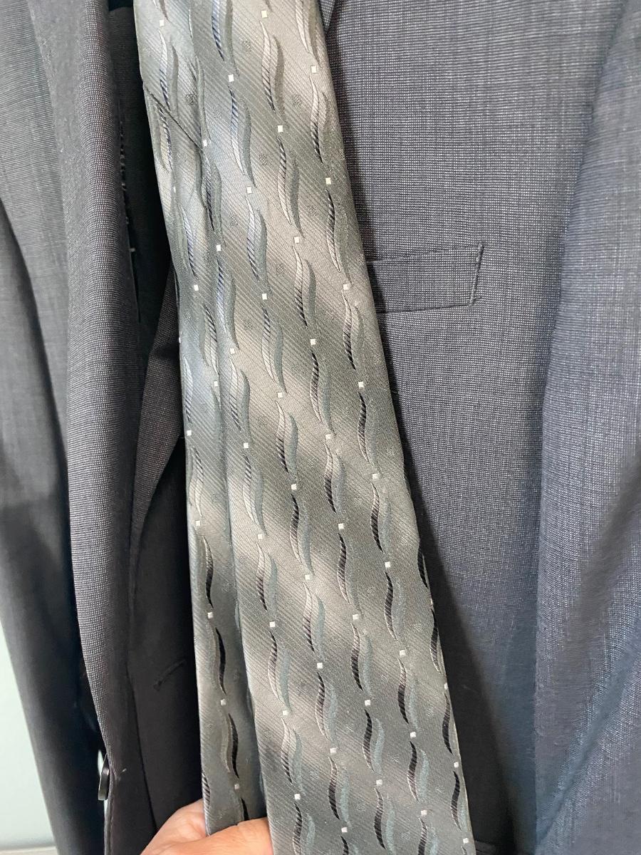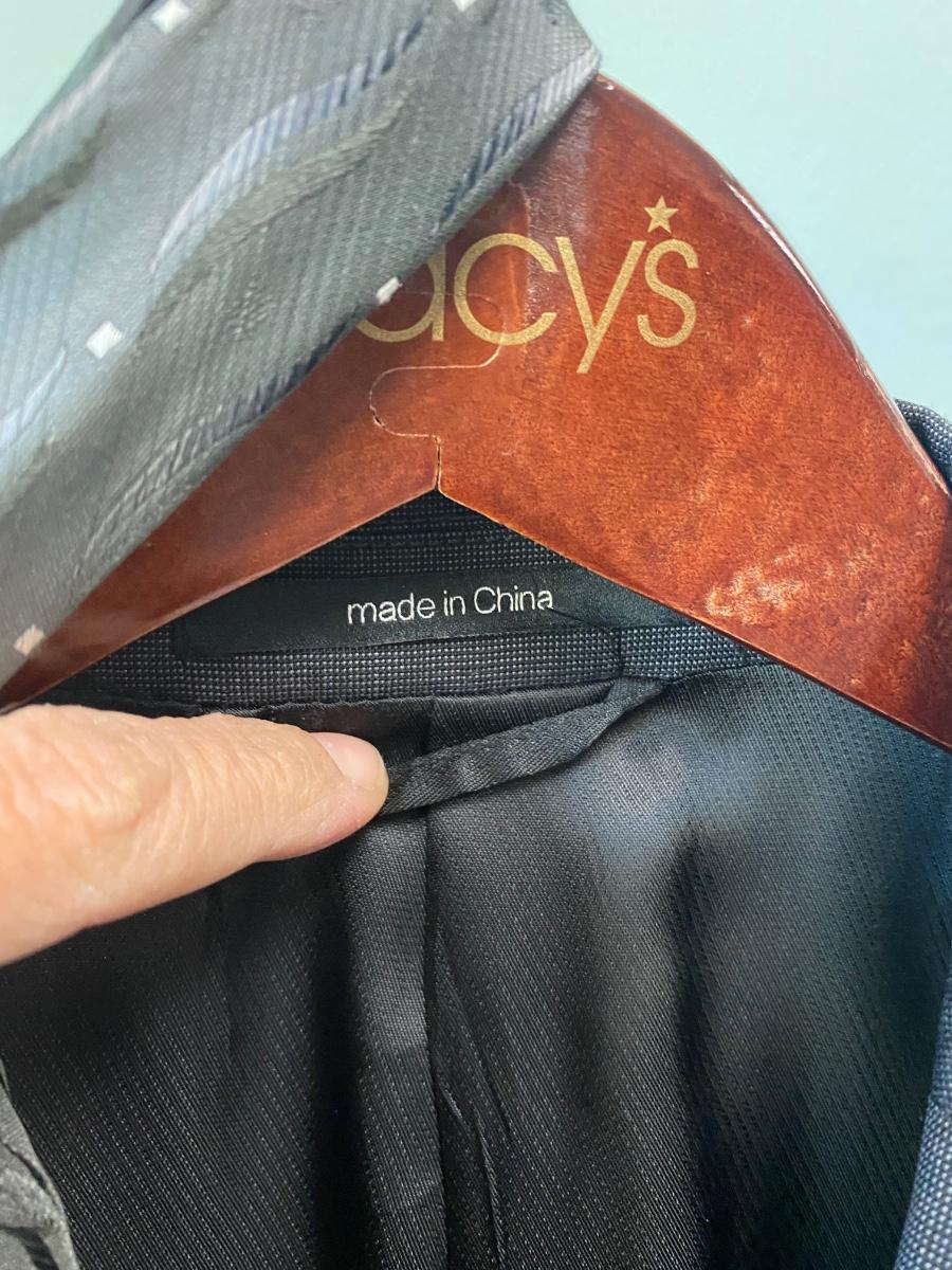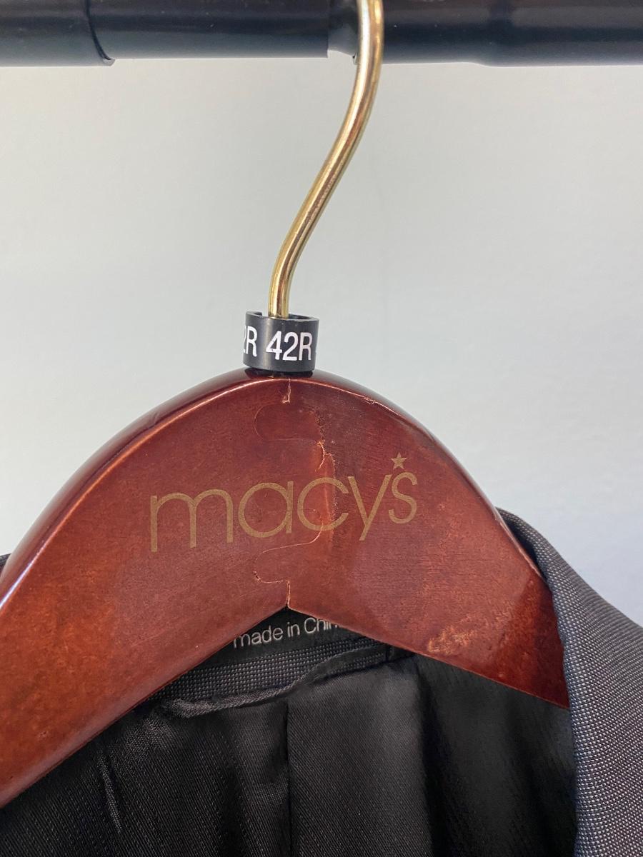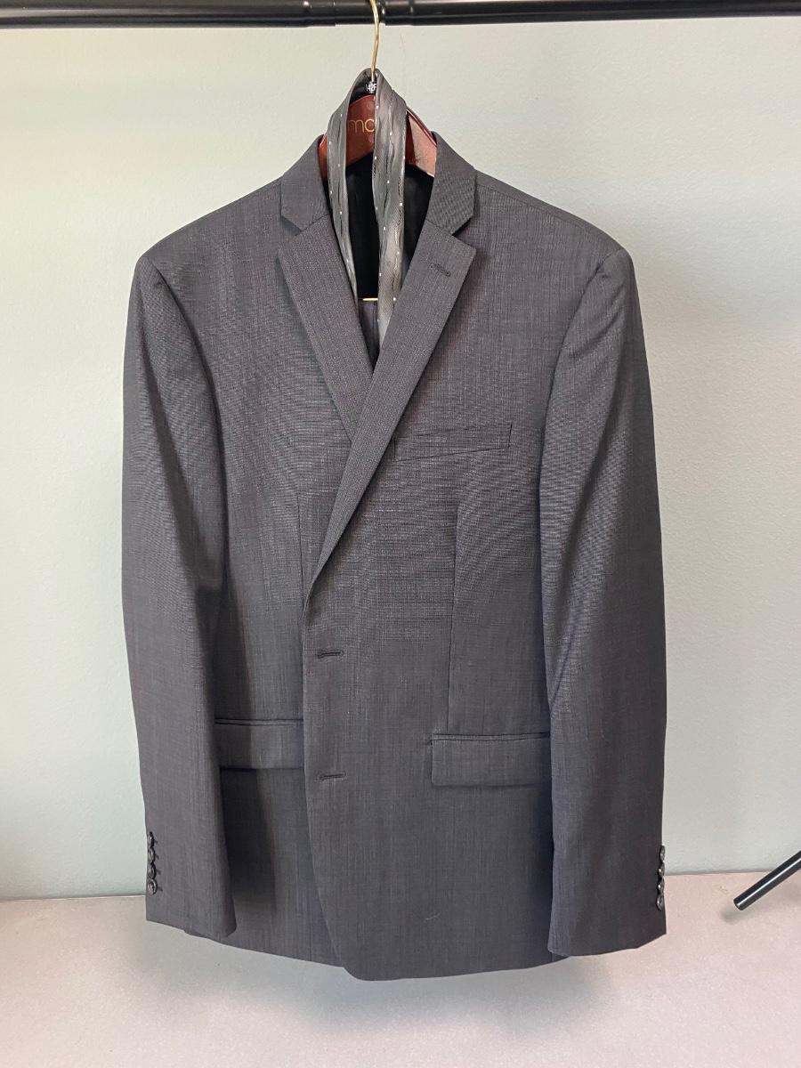 Slim Fit Bar III Grey Men's Suit from Macy's. Includes jacket, pants, and tie. Jacket does not have a size tag but hanger says 42r, pants are a size 34. Good condition.