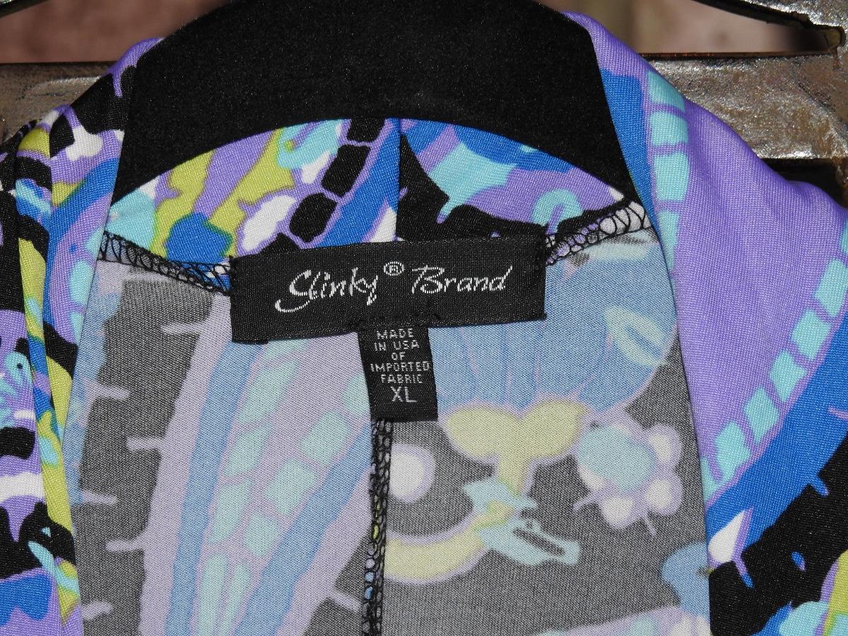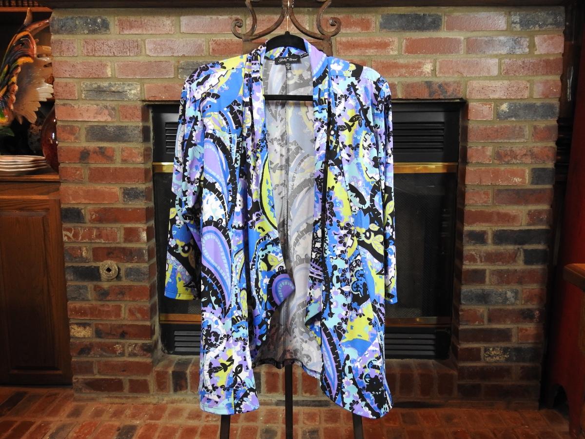 Slinky brand, three-quarter links, multi print open front, light shawl jacket. Excellent used condition. Size XL