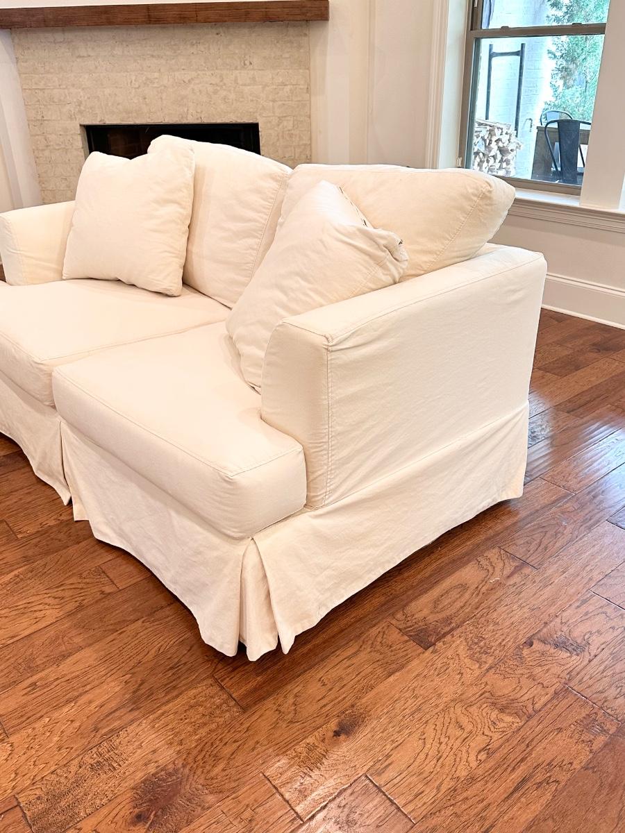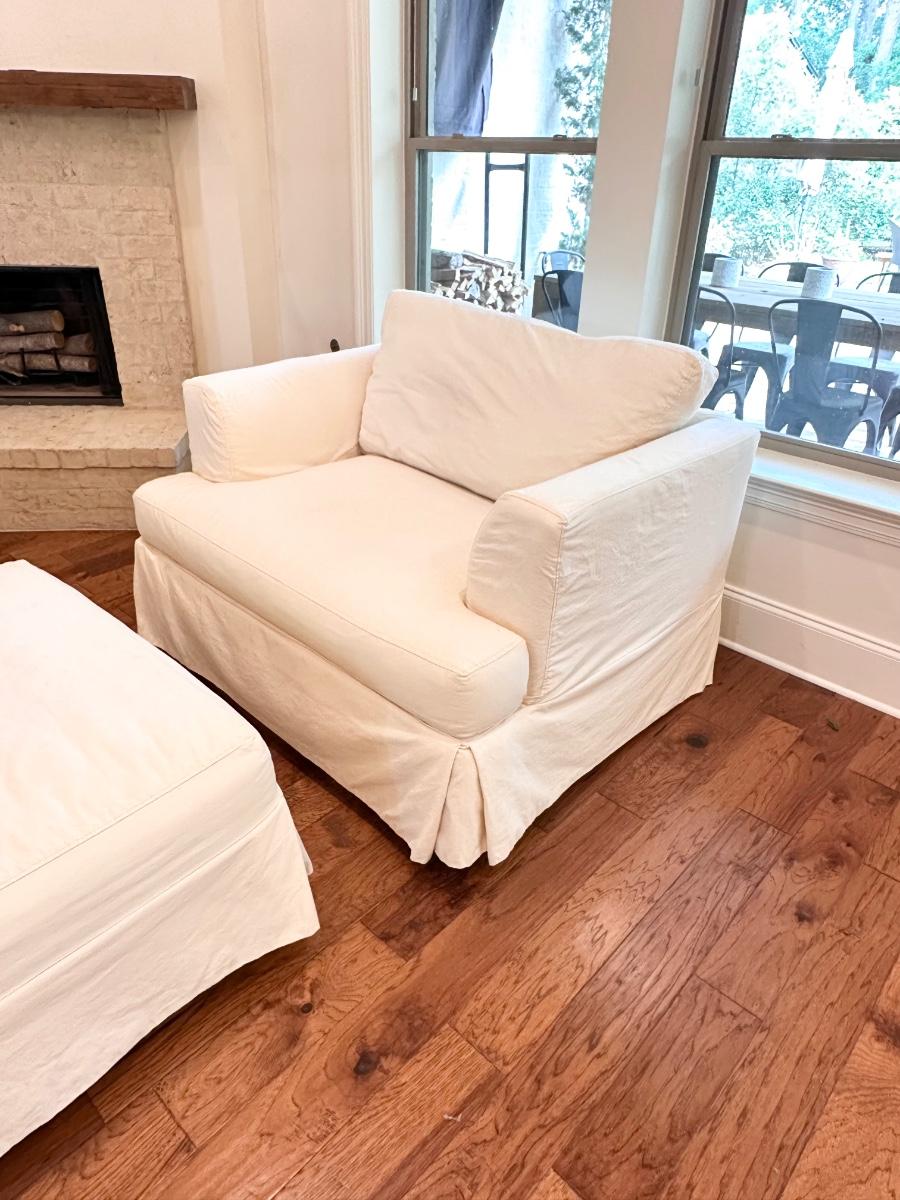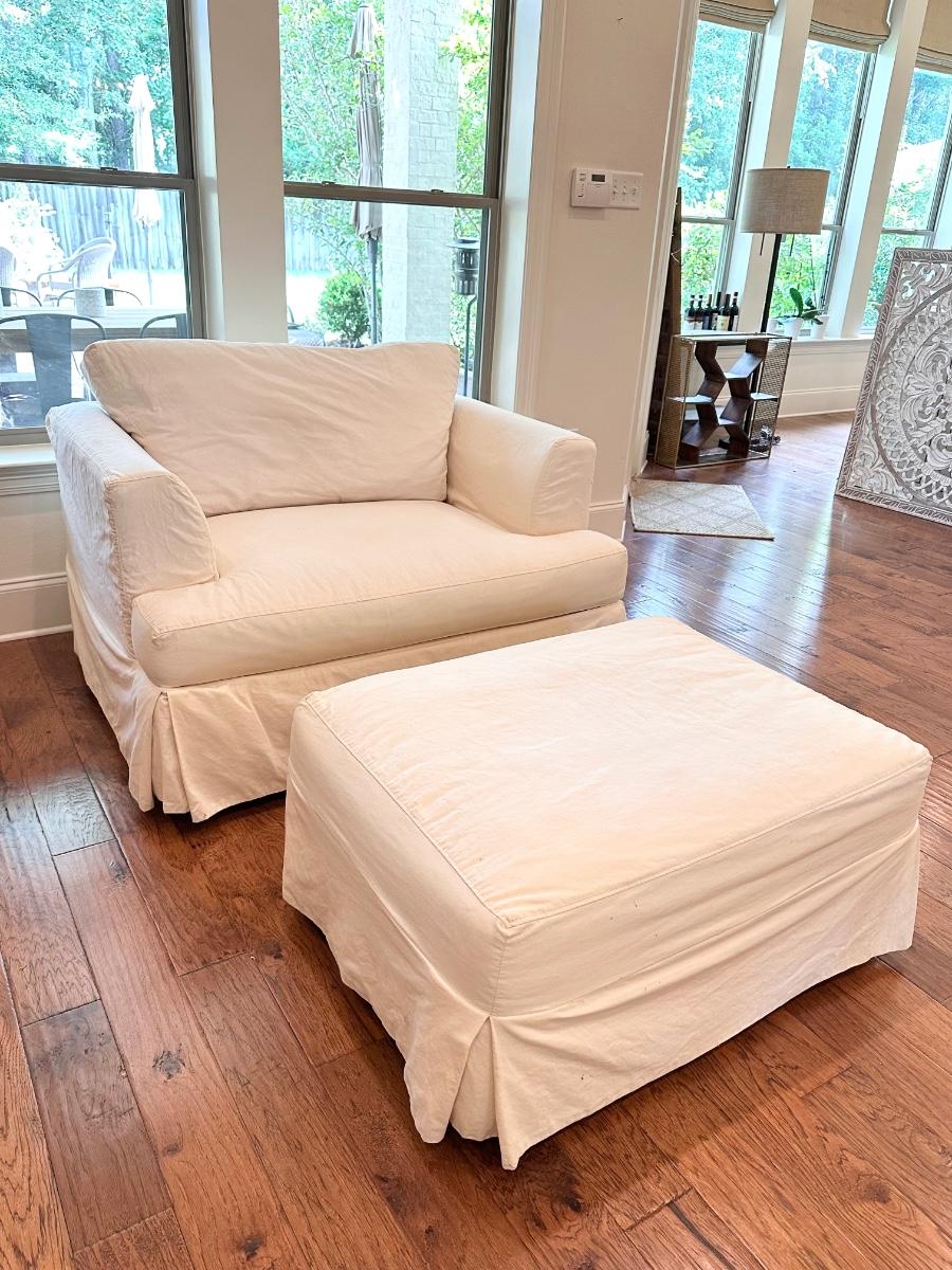 Four (4) Piece ~ Natural Denim Slip Covered Couch, Loveseat & Oversized Chair & Ottoman