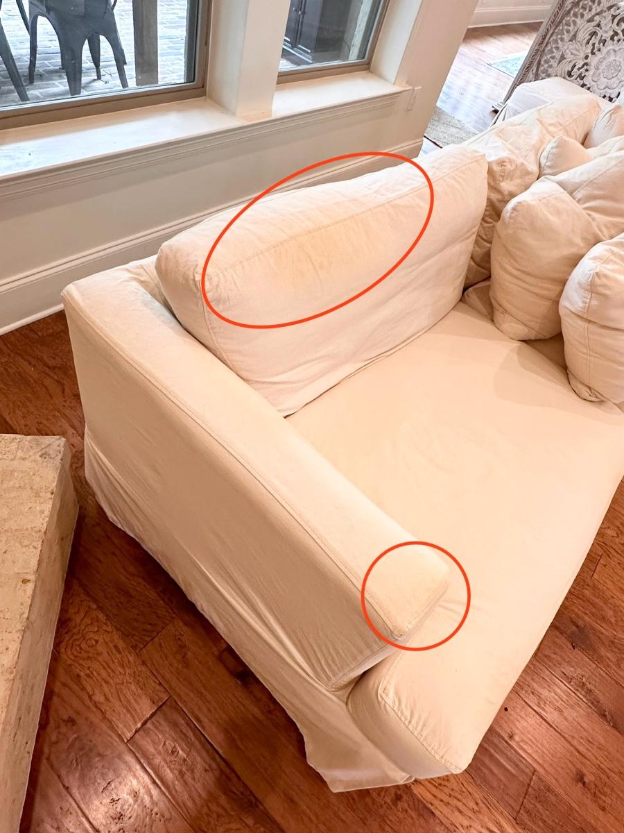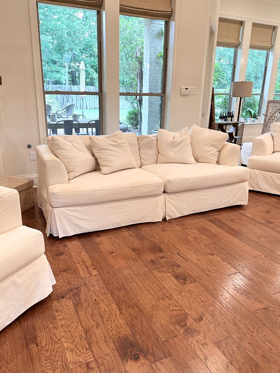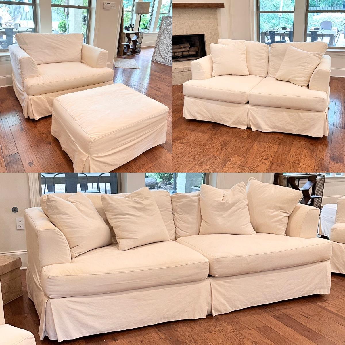 Label describes this as Natural Denim ~ Oversized Chair = 36” H x 48” W x 40” D ~ ottoman = 18” H x 38” x 28” ~ loveseat = 36” H x 68” W x 40” D ~ Couch = 36” H x 92” W x 40” D ~ **Note that one section of the couch (see photos) was out clients favorite spot to sit, therefore it is a little soiled and will need to be cleaned ~ All covers are removable ~ Pillow shown are included ~ No brand