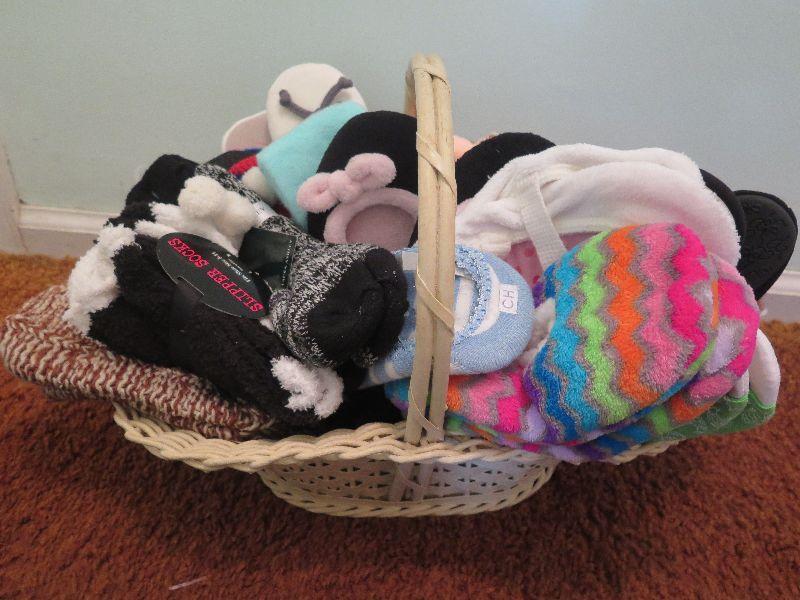 A basket of all new slippers, some handcrafted slippers. Also, a hand crafted infinity scarf. Please review all photos and read Terms and Conditions before placing a bid. Pick up is Wednesday, November 20 from 4-7pm and Saturday, November 23 from 9am-2pm in Mantua, New Jersey. All sales are final. All sales are as is, where is. Please bring all boxes, tools, and muscle needed to remove your items. Any photo props are not included. All measurements are approximate. Items come from dog-friendly home.
