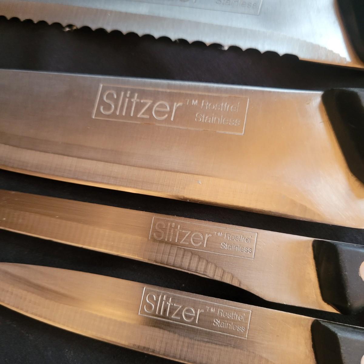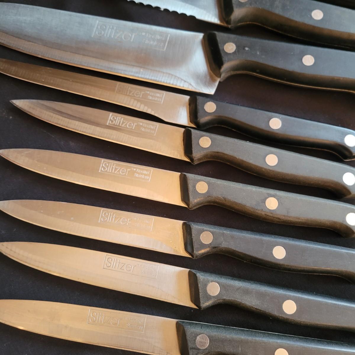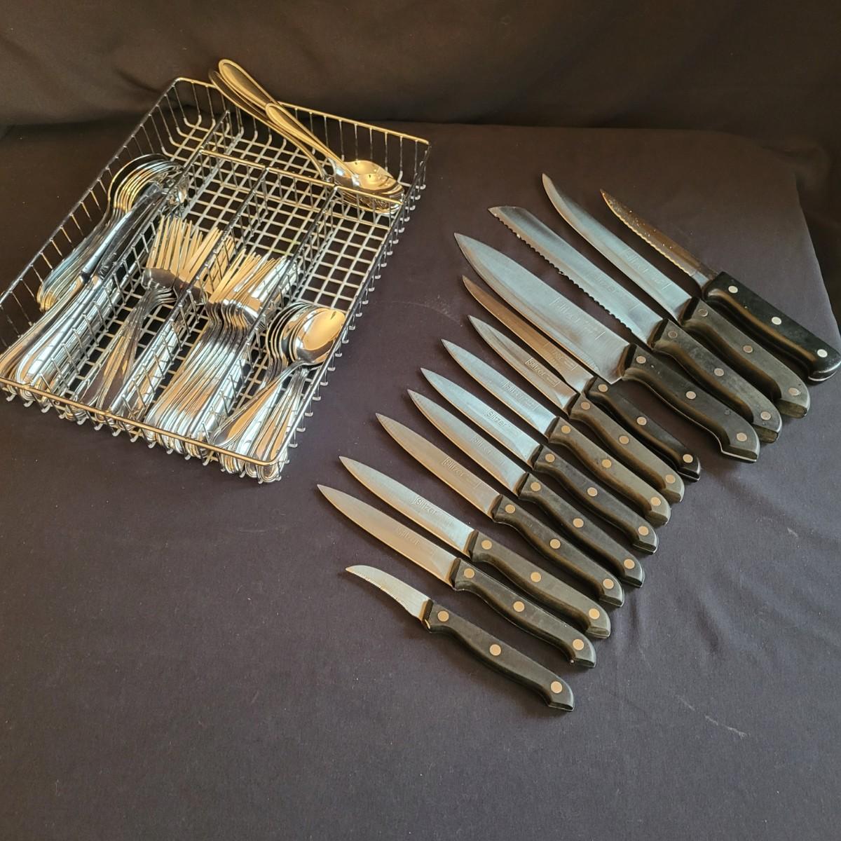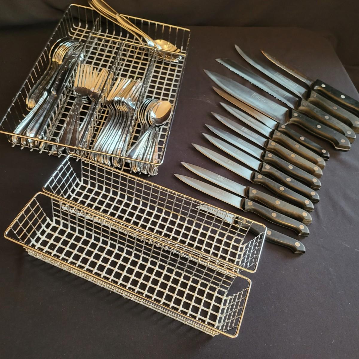 An assortment of Slitzer knives and Wallace stainless flatware. Included is 13 knives manufactured by Slitzer and an assortment of Wallace stainless flatware that has at least seven place settings. The metal bins are also included. Shipping available