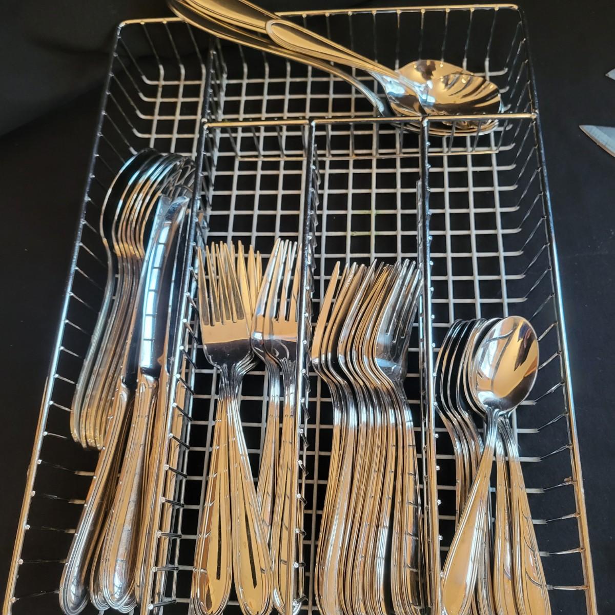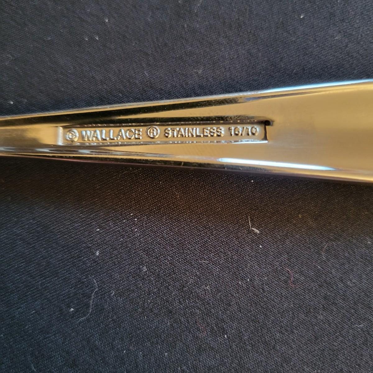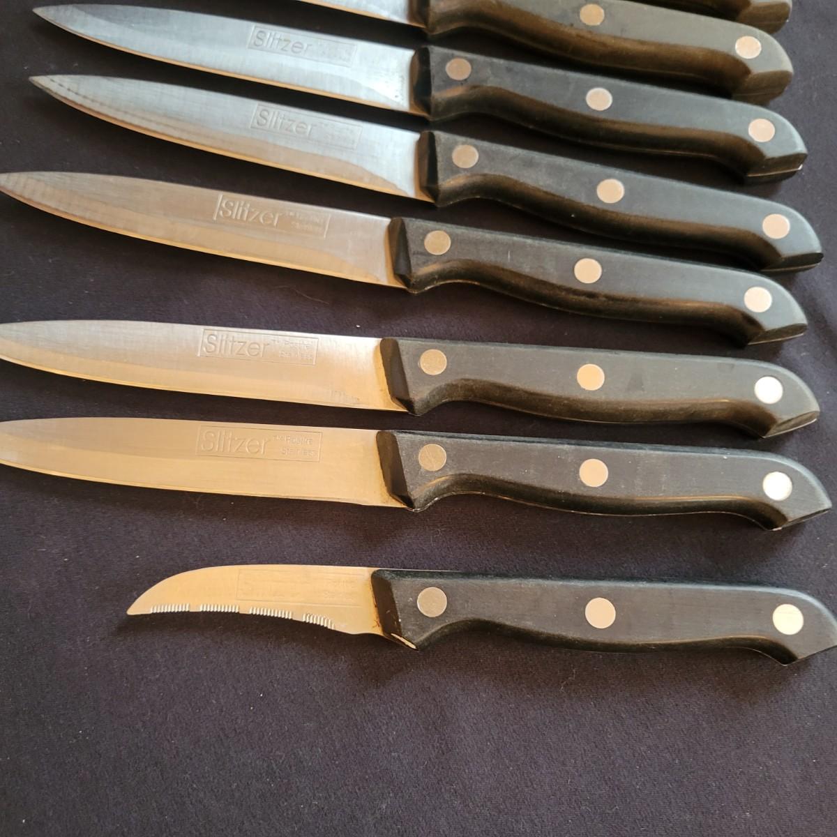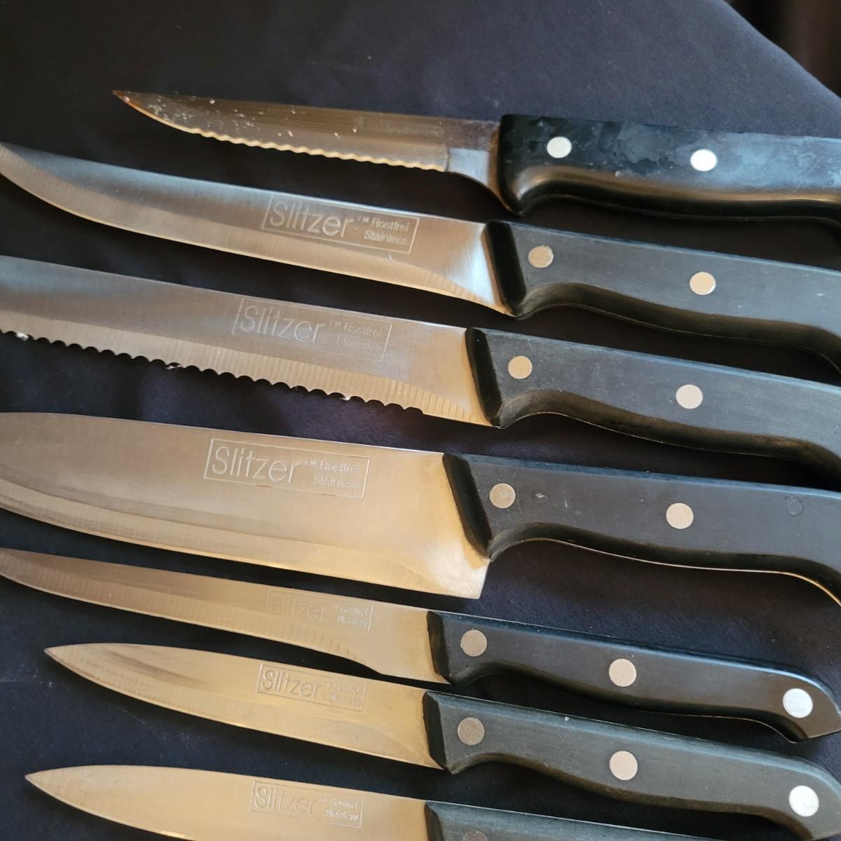 An assortment of Slitzer knives and Wallace stainless flatware. Included is 13 knives manufactured by Slitzer and an assortment of Wallace stainless flatware that has at least seven place settings. The metal bins are also included. Shipping available