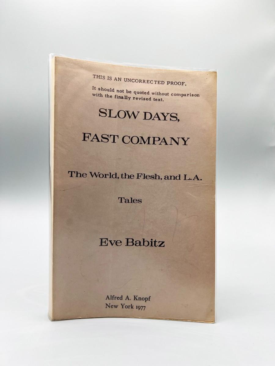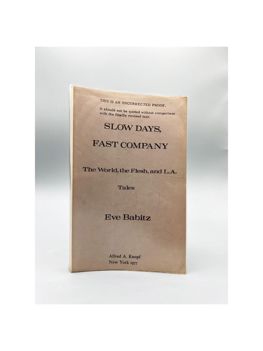 1977 uncorrected proof copy of Slow Days, Fast Company by Eve Babitz. The book is a look at Los Angeles in the 1960s. in good vintage condition.