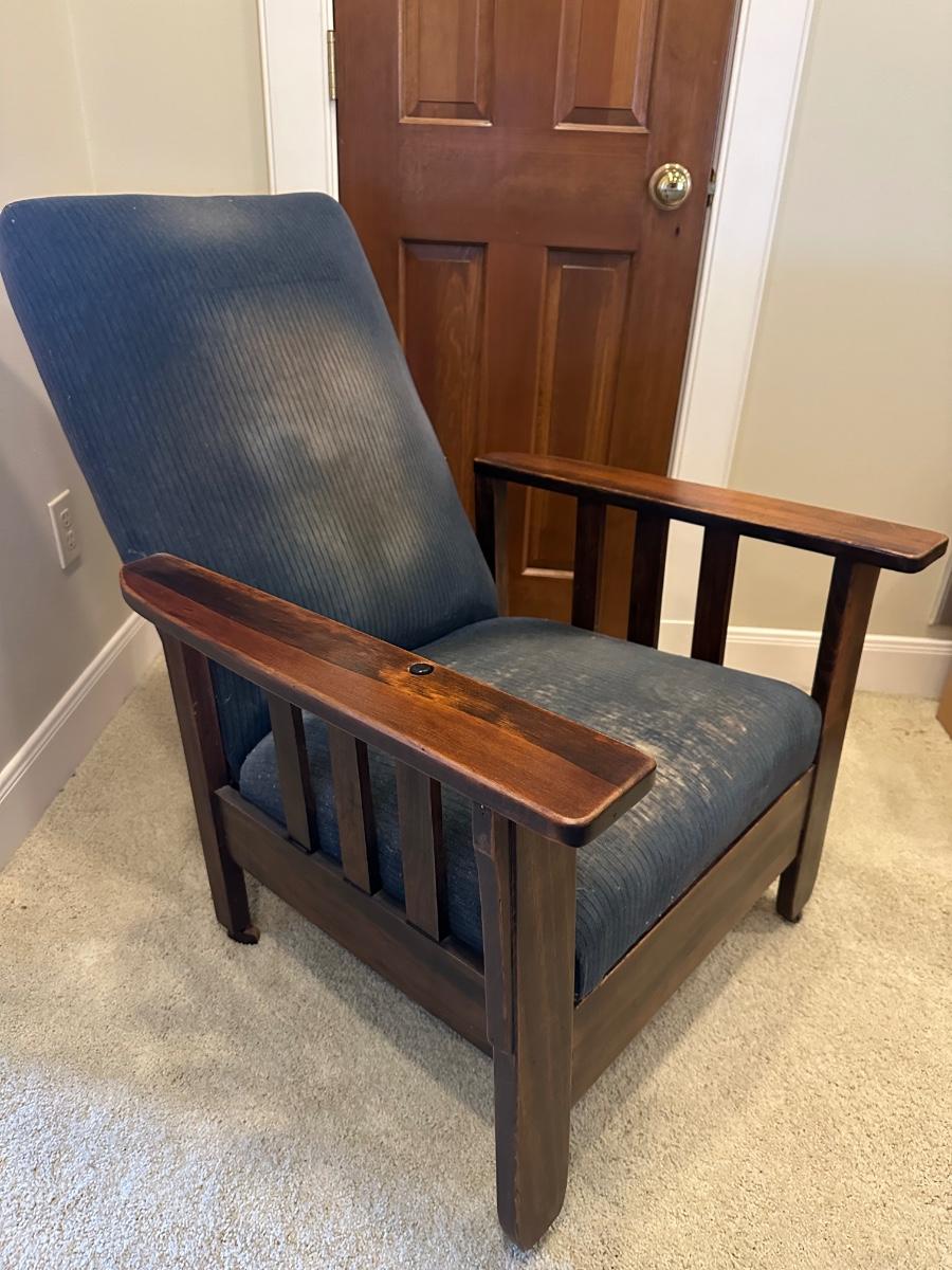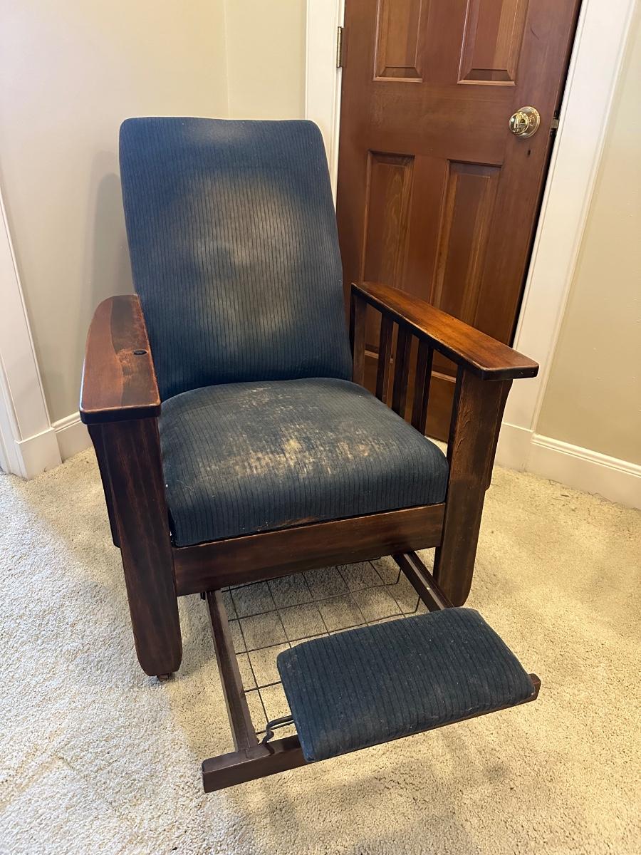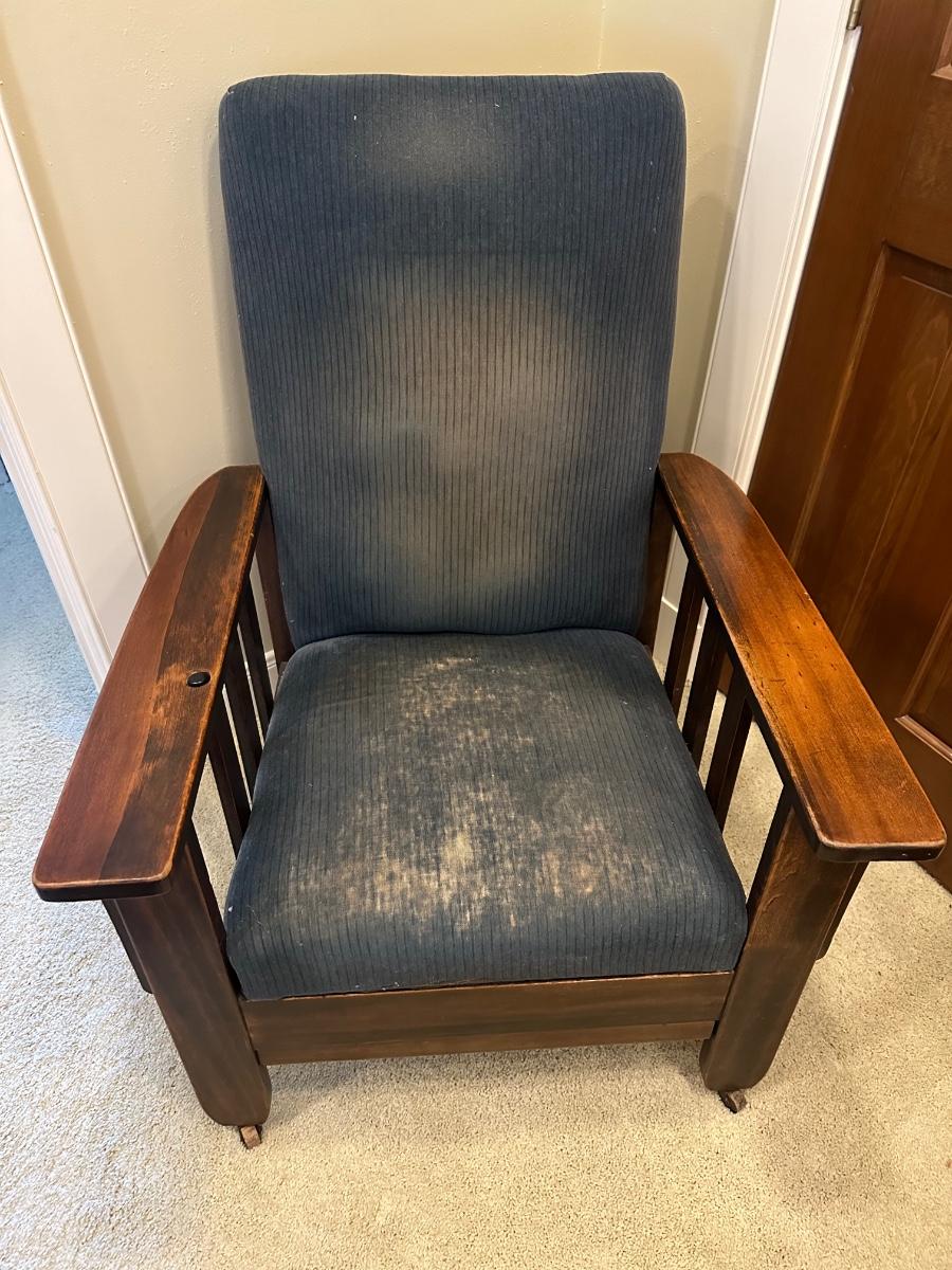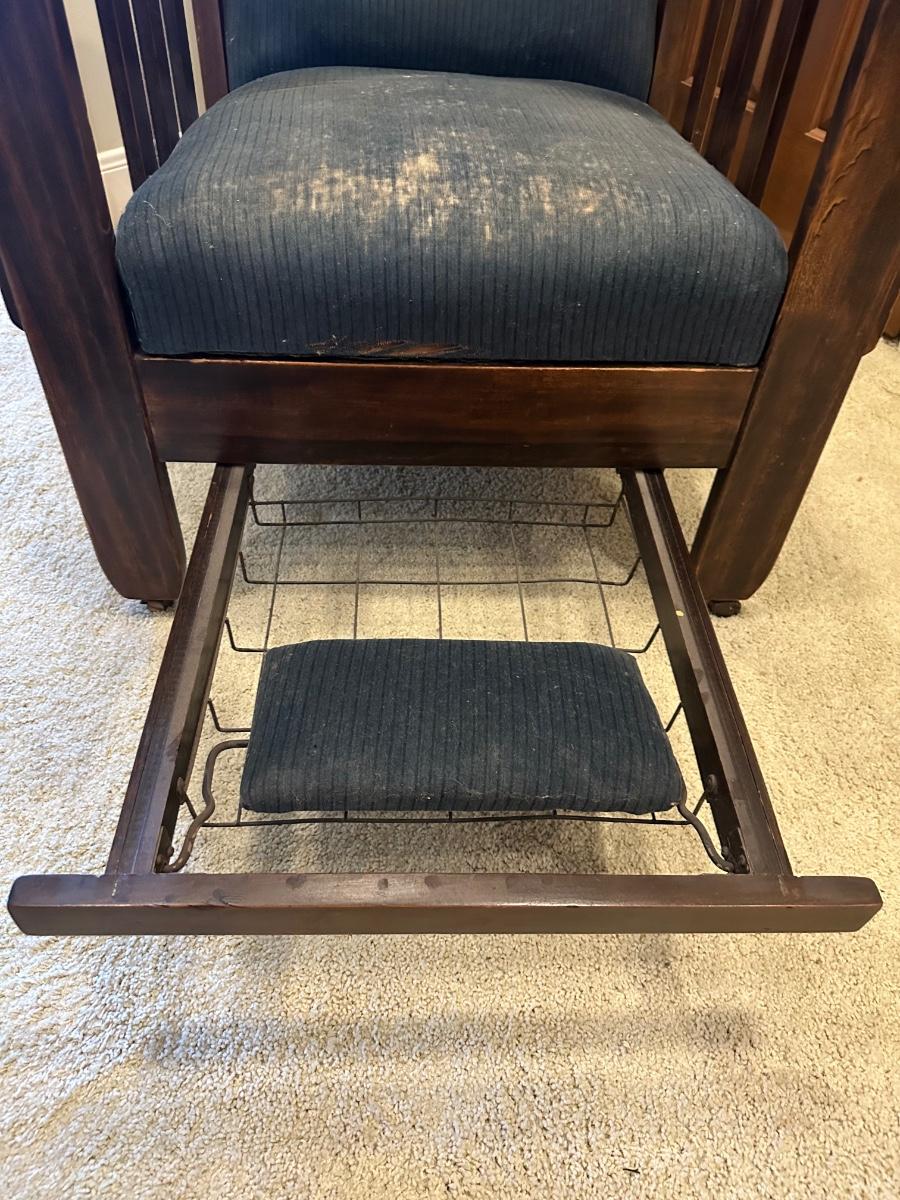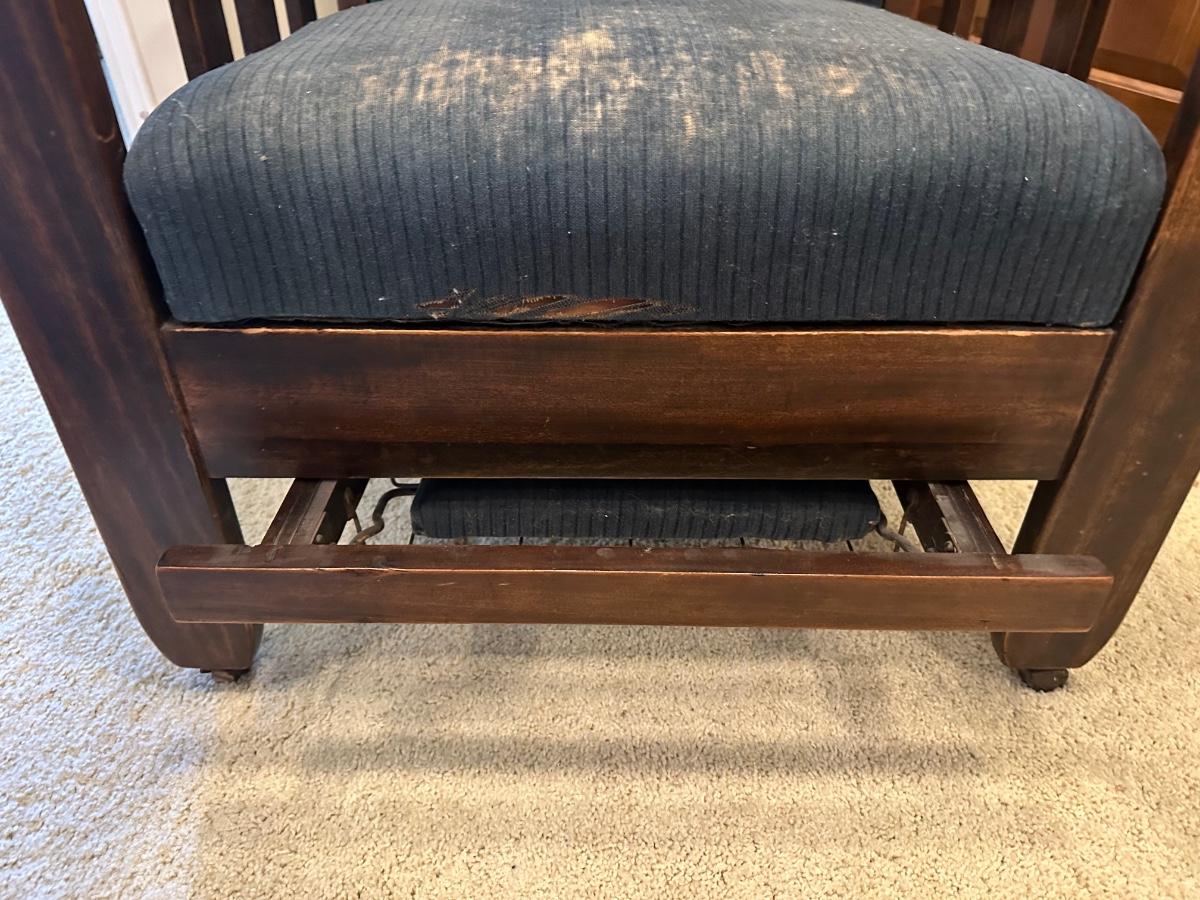 One of the first recliners, dating around 1907. A beautiful antique furniture find! The wood is in great condition. The original upholstery is worn from age but the chair would look great recovered! The rest spins and needs to be tightened. Very comfortable chair.