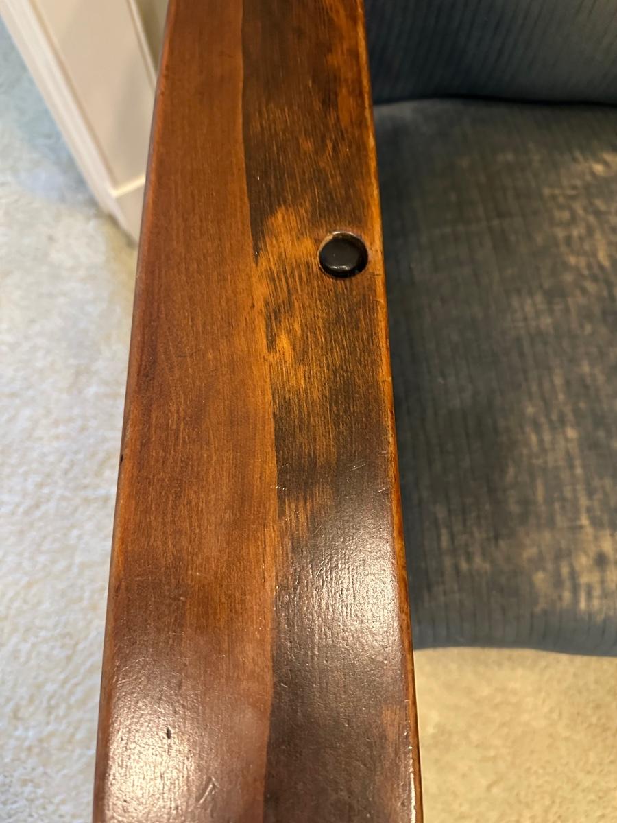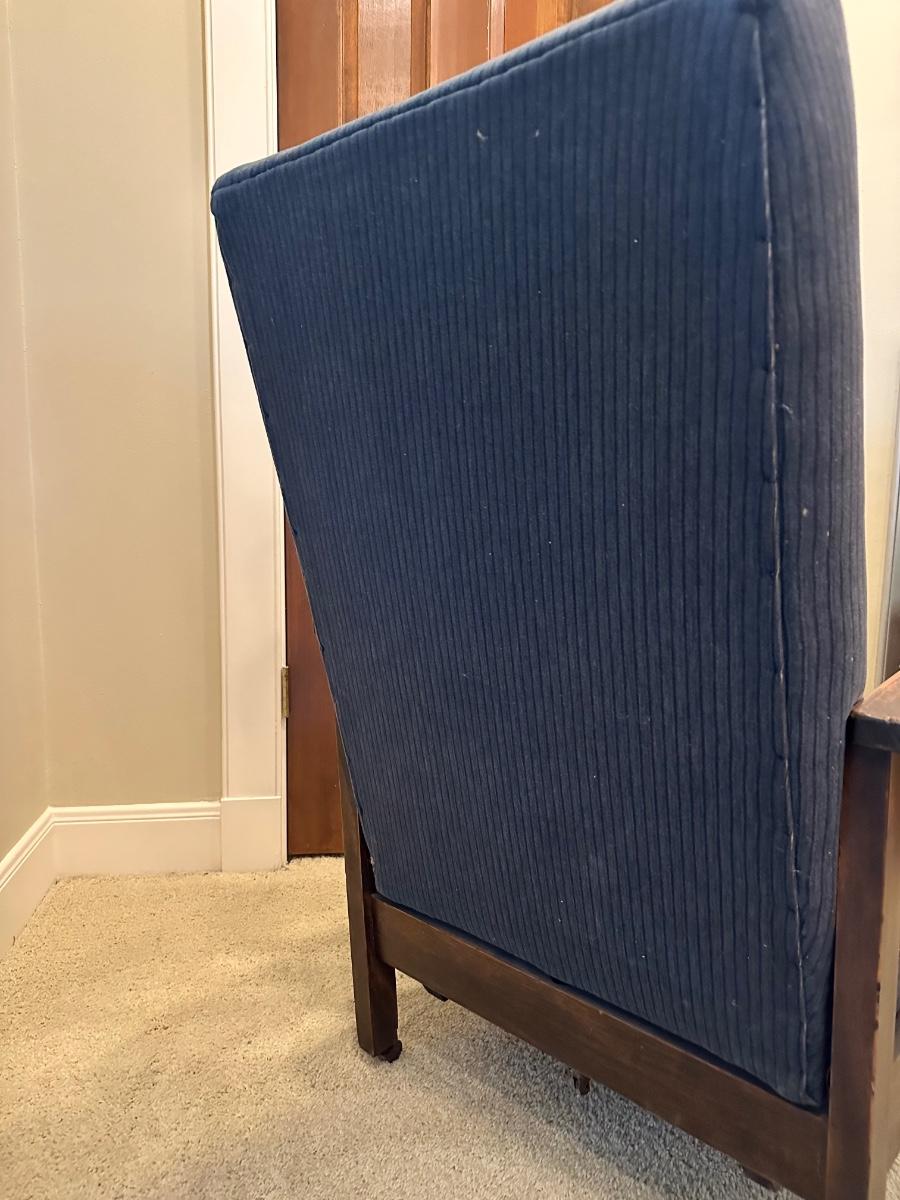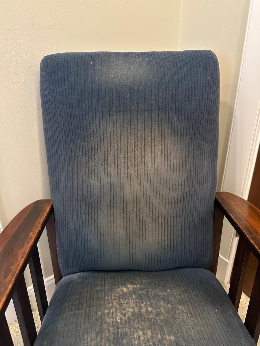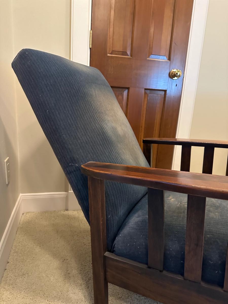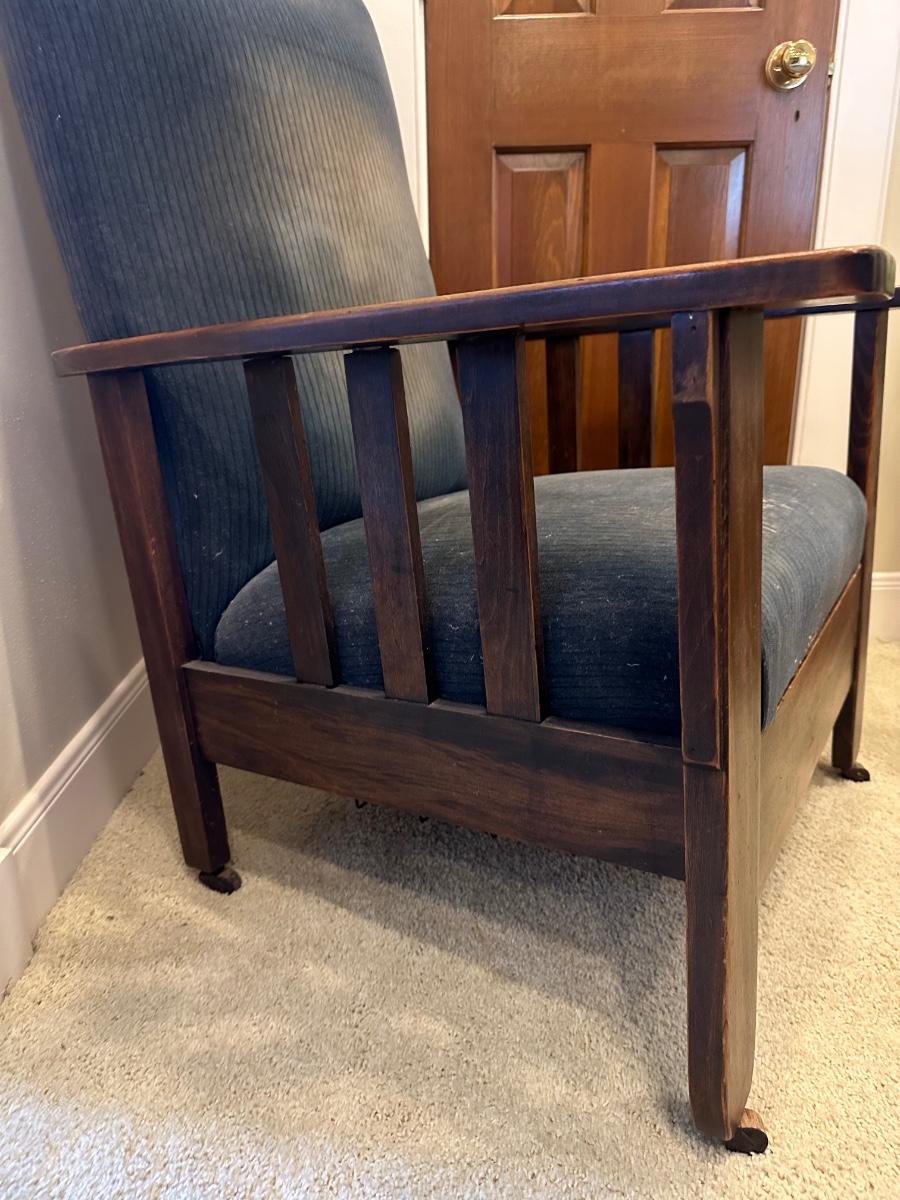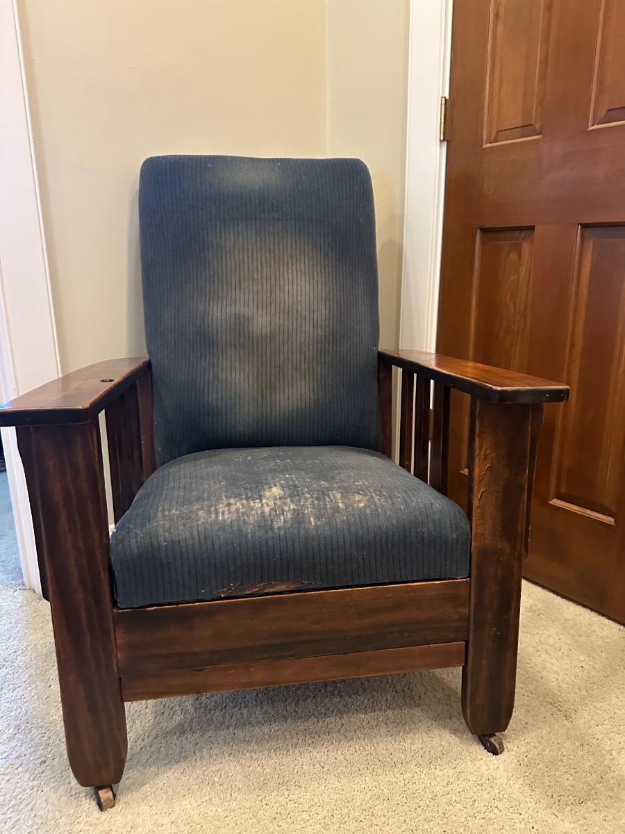 One of the first recliners, dating around 1907. A beautiful antique furniture find! The wood is in great condition. The original upholstery is worn from age but the chair would look great recovered! The rest spins and needs to be tightened. Very comfortable chair.