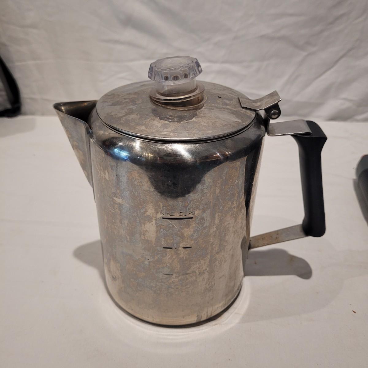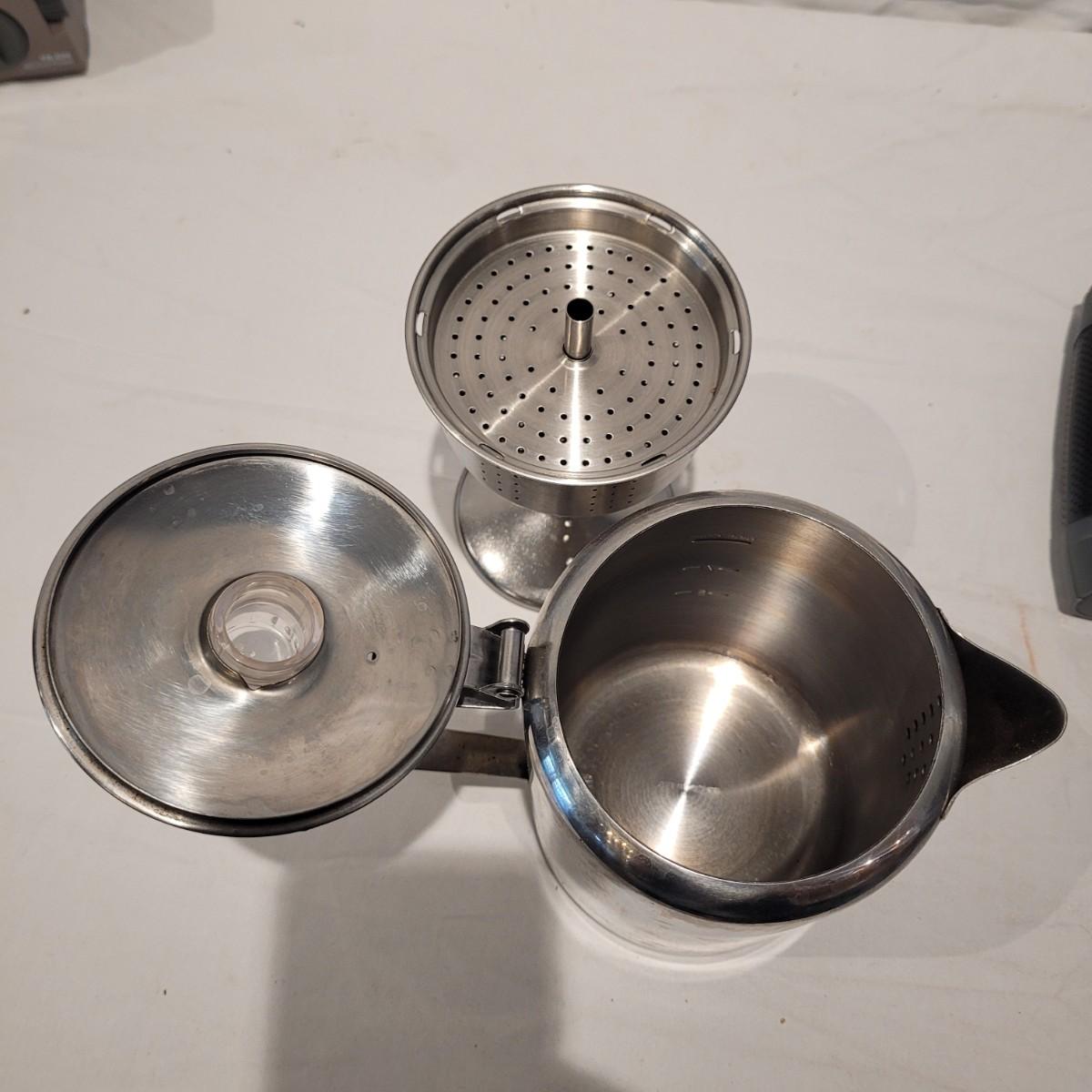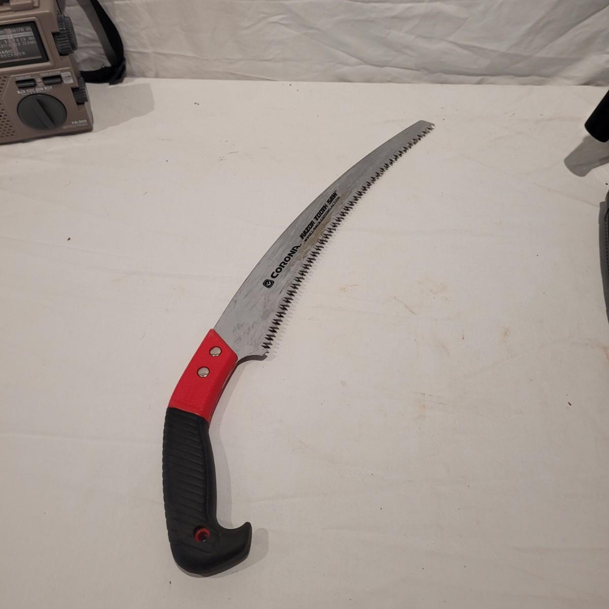 Be well prepared in the wilderness with this camping gear, including a Slumberjack 15 degree cocoon style sleeping bag, two Thermarest sleeping pads, a CyberPower 400W inverter, stainless steel percolator, can of bear spray, Grundig emergency shortwave radio which powers on when cranked, and razor tooth saw. Thermarest pads measure approximately 25" x 76". Local pickup only.