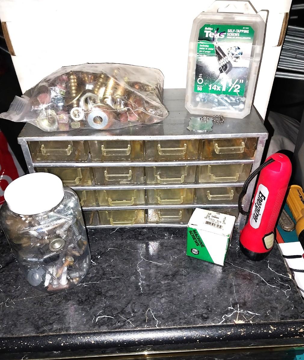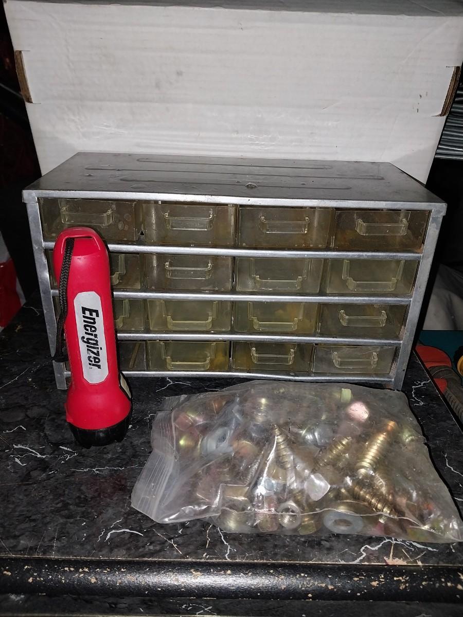 SMALL 16 DRAWER HARDWARE HOLDER, HARDWAREAND FLASHLIGHT