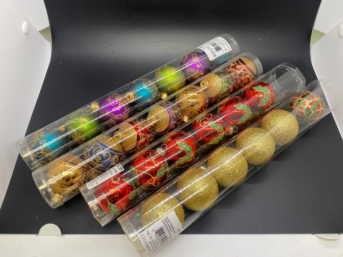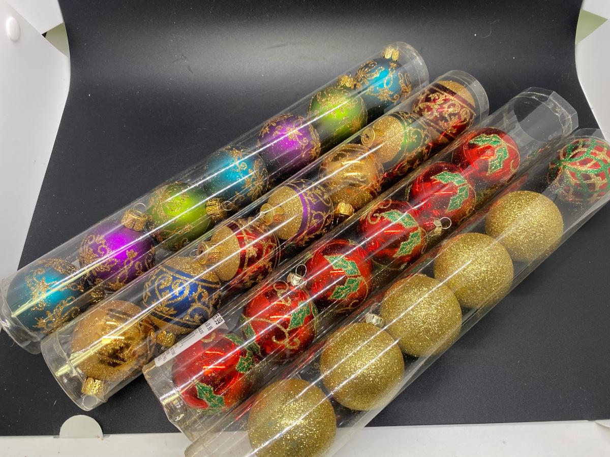 Lot of small round Christmas tree ornaments. 4 tubes of colorful, plastic ornaments. About 2" size.