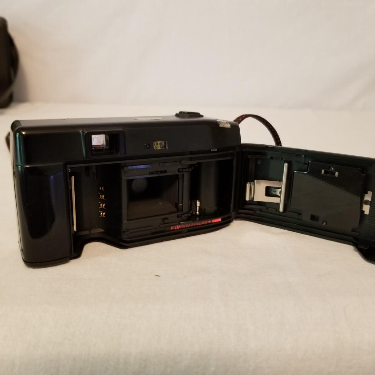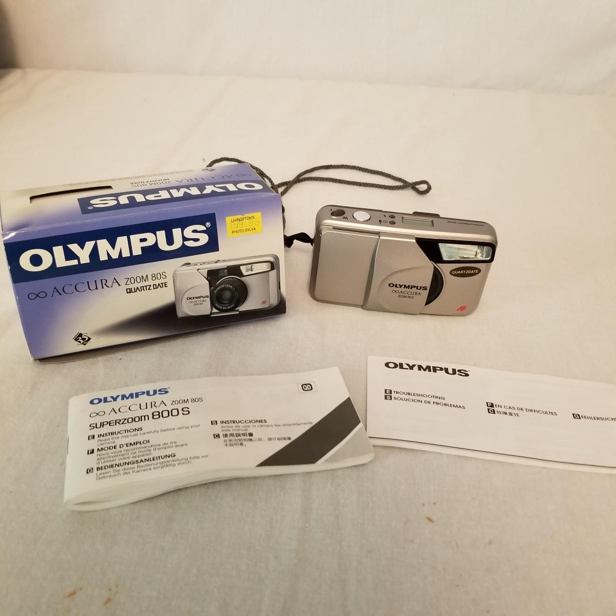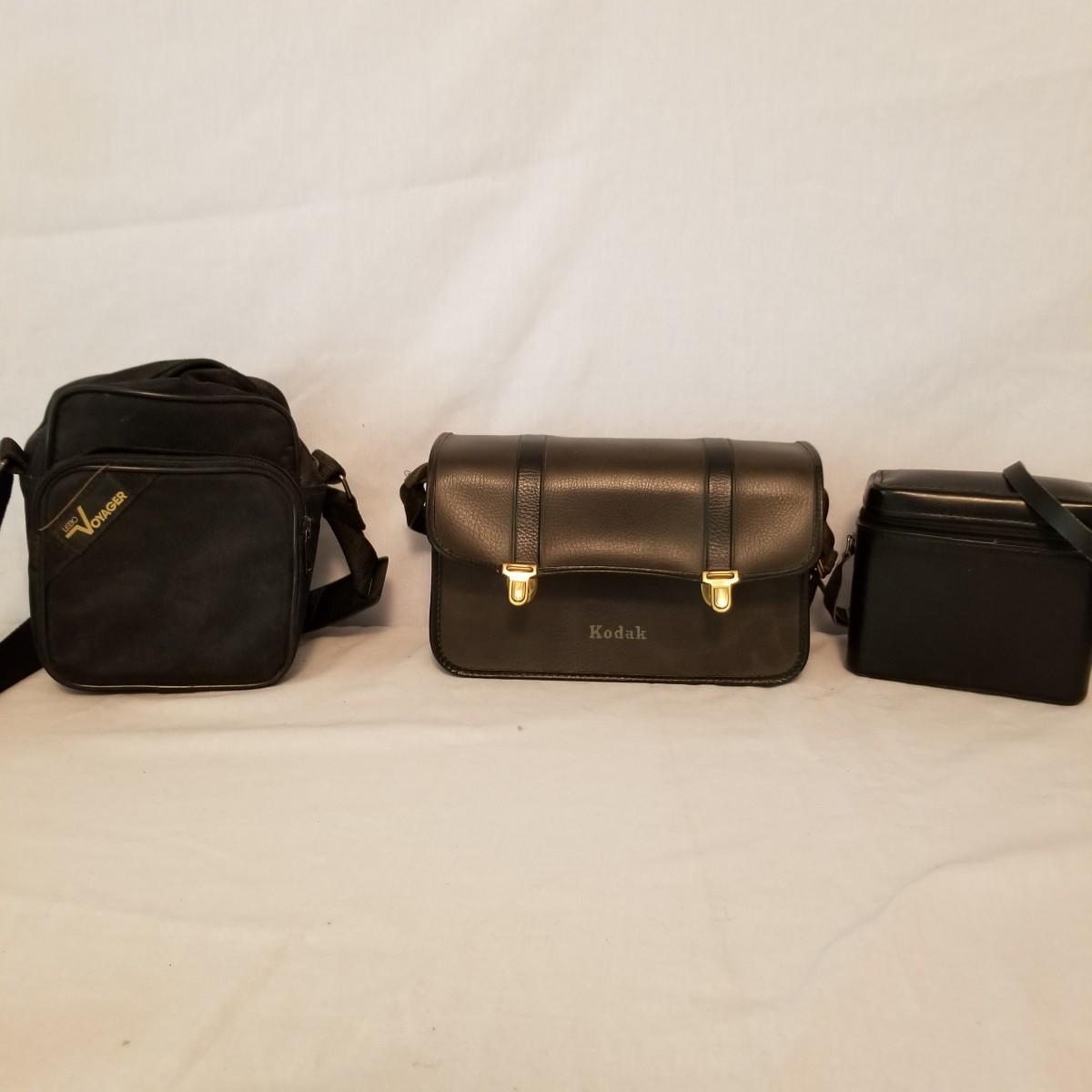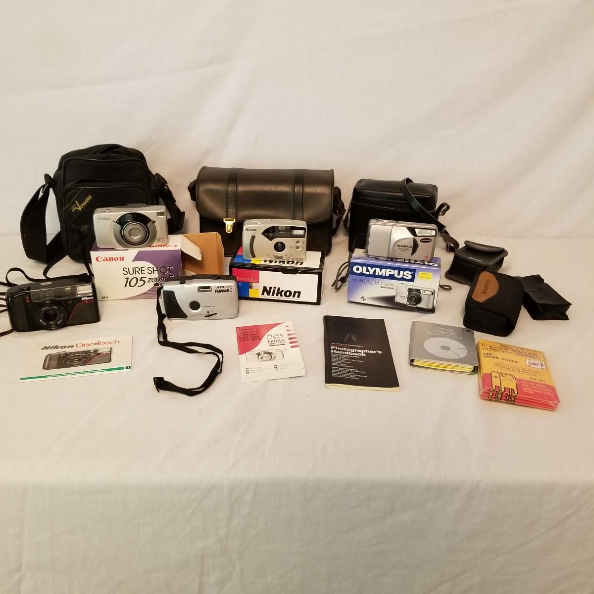 Five early point and shoot 35mm cameras by Nikon, Canon, Olympus. Most have original boxes and manuals. Also includes three miscellaneous bags for storage and transport. All items untested, but in good condition. See photos for details. Shipping available.
