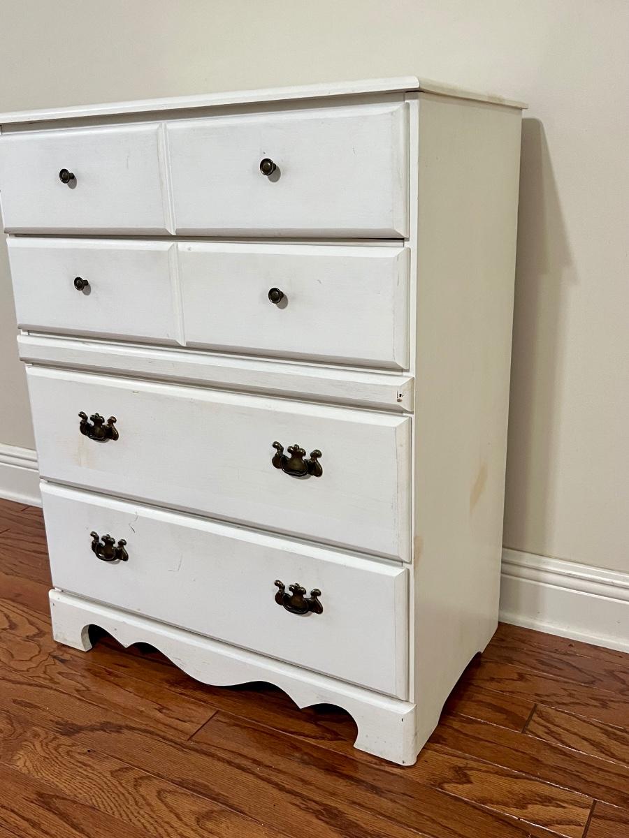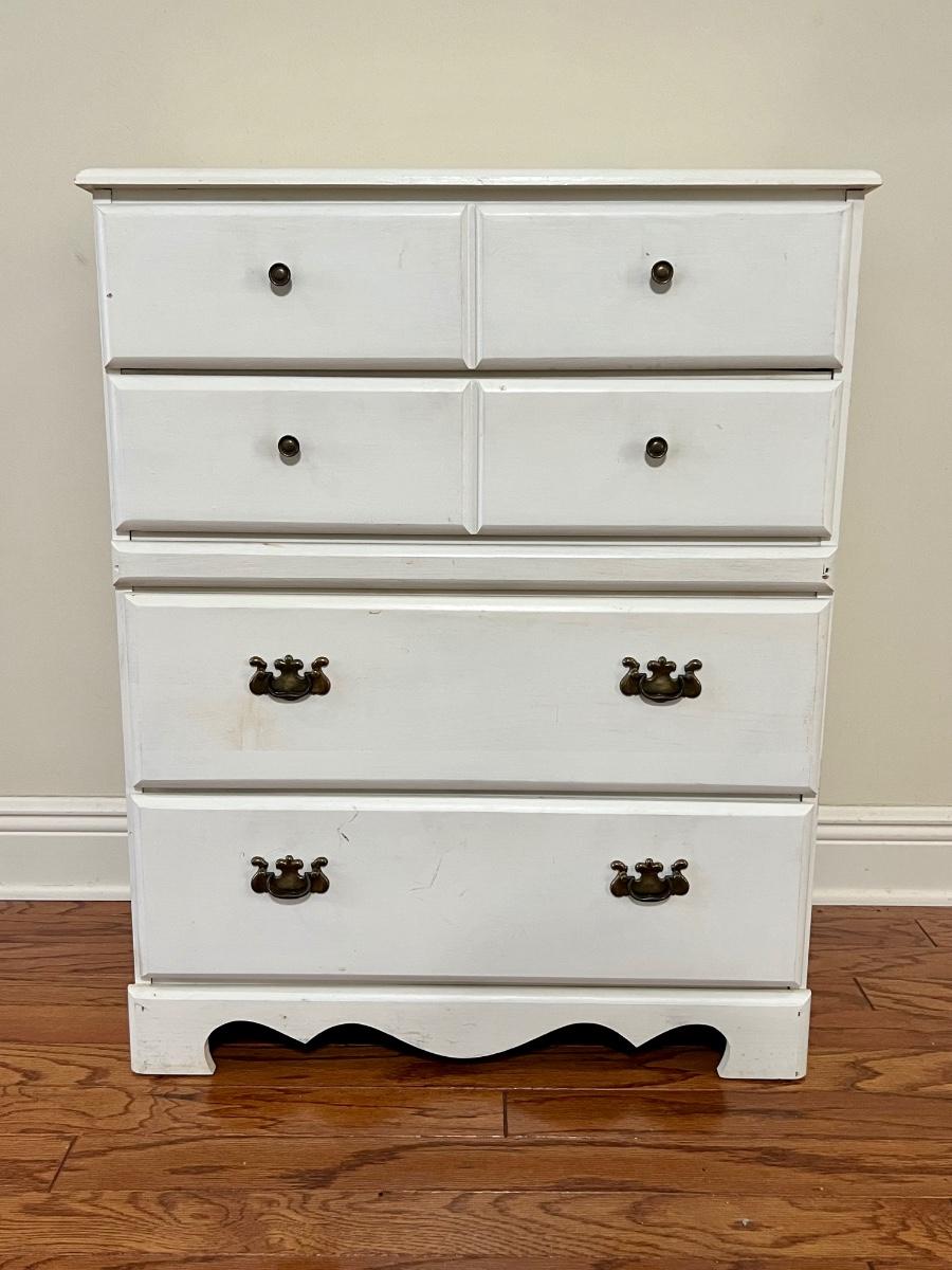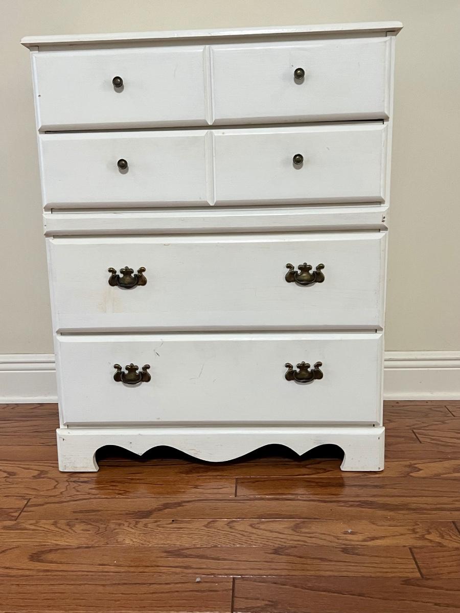 Small 4 Drawer Chest Of Drawers wood painted white with some distressed spots. See pictures. Measures 33 inches tall, 27 inches wide and 15 inches deep.