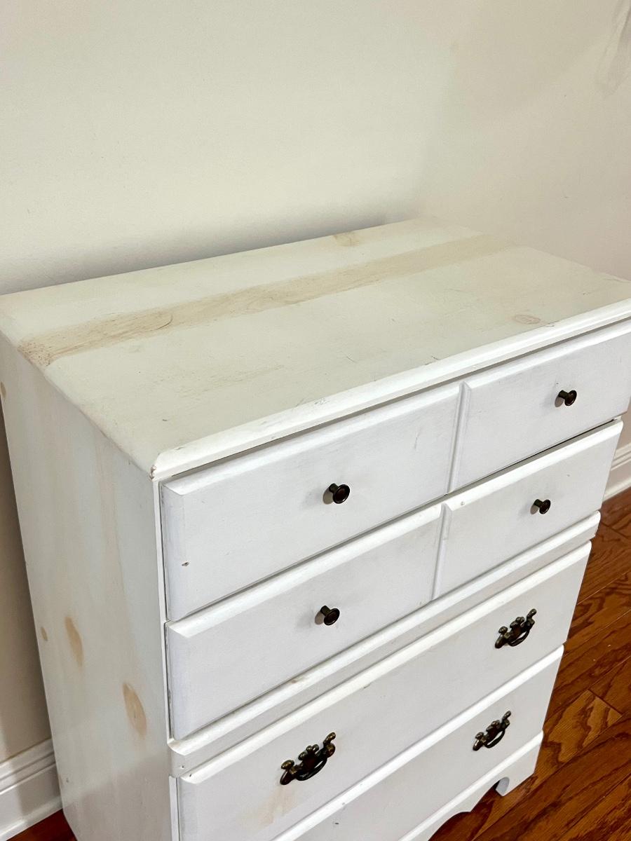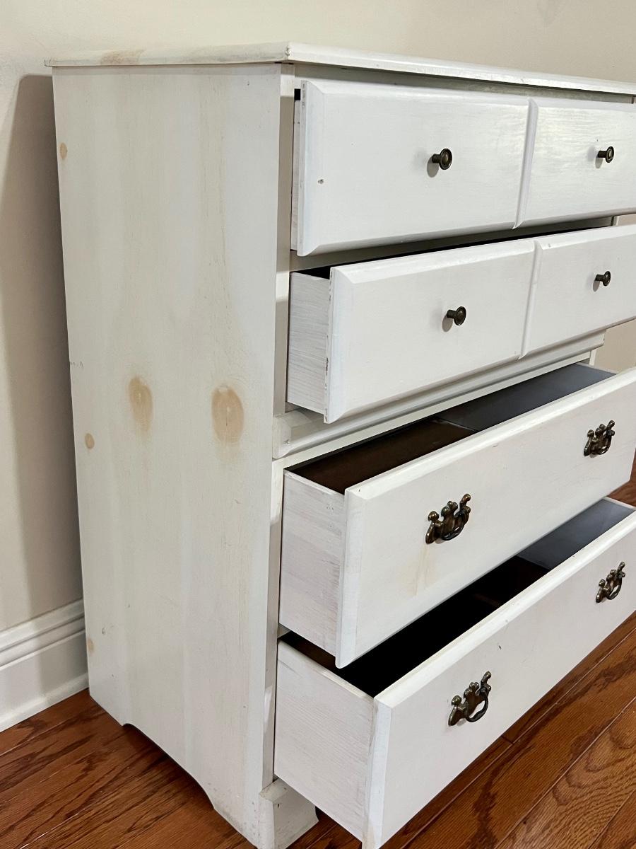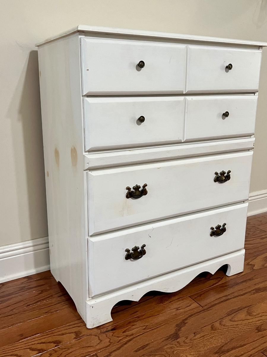 Small 4 Drawer Chest Of Drawers wood painted white with some distressed spots. See pictures. Measures 33 inches tall, 27 inches wide and 15 inches deep.