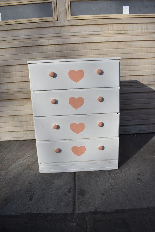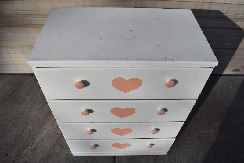 Small 4 Drawer Dresser, Painted White with Peach Hearts