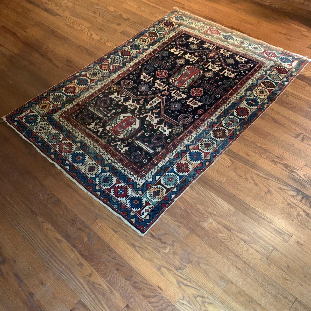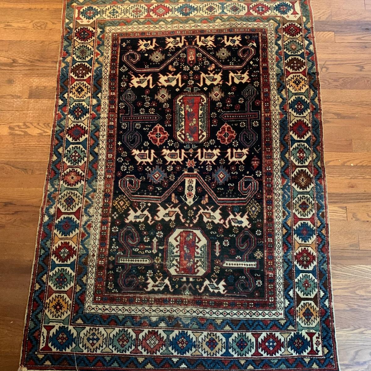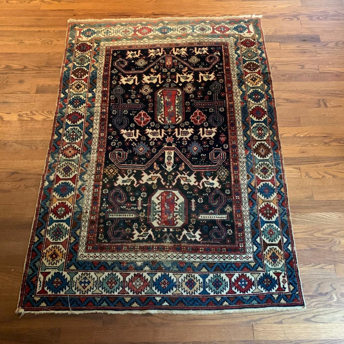 Small 5’5” x 3’9” wool area rug with flat pile. This rug is a bit worn on two sides, please see photos for more details. This rug features bright blues and delightful alpaca designs. Local pick-up only.