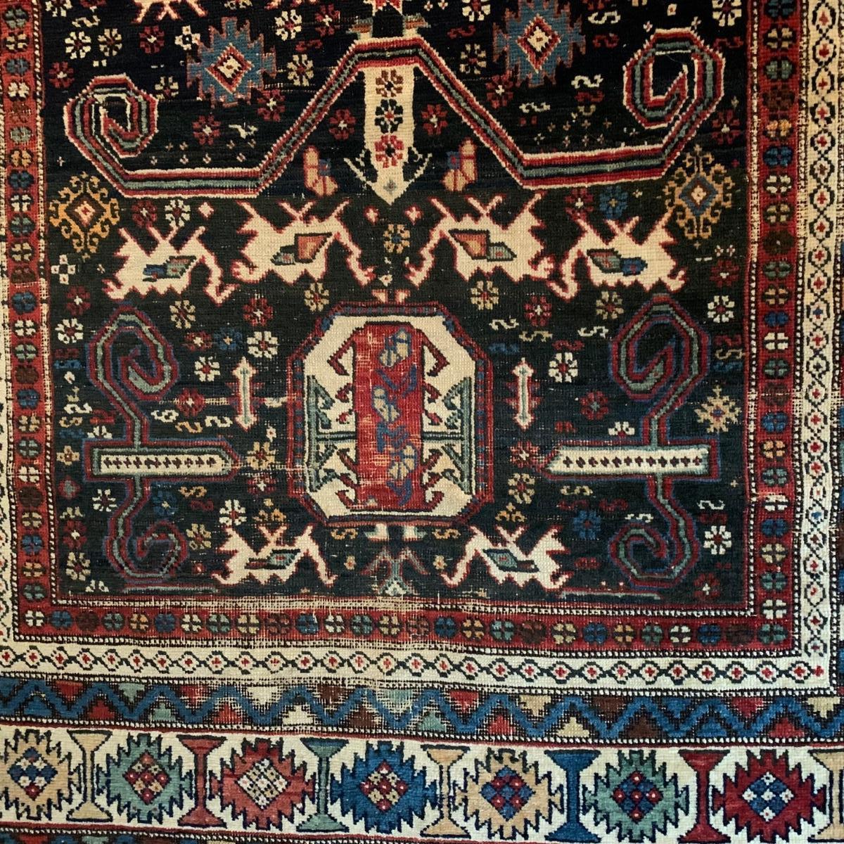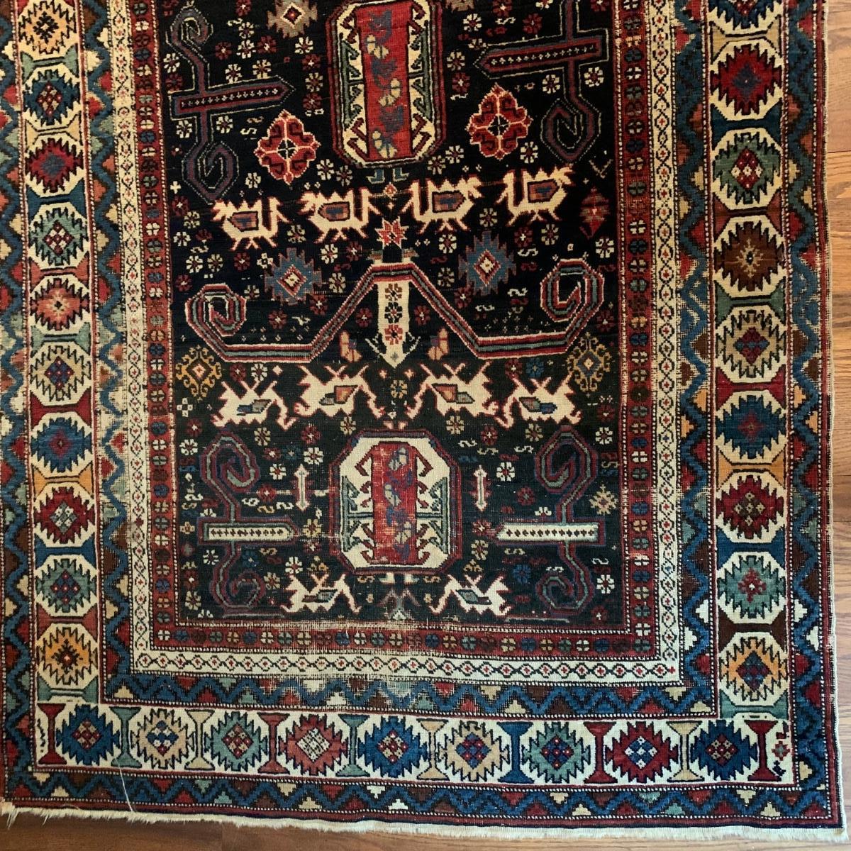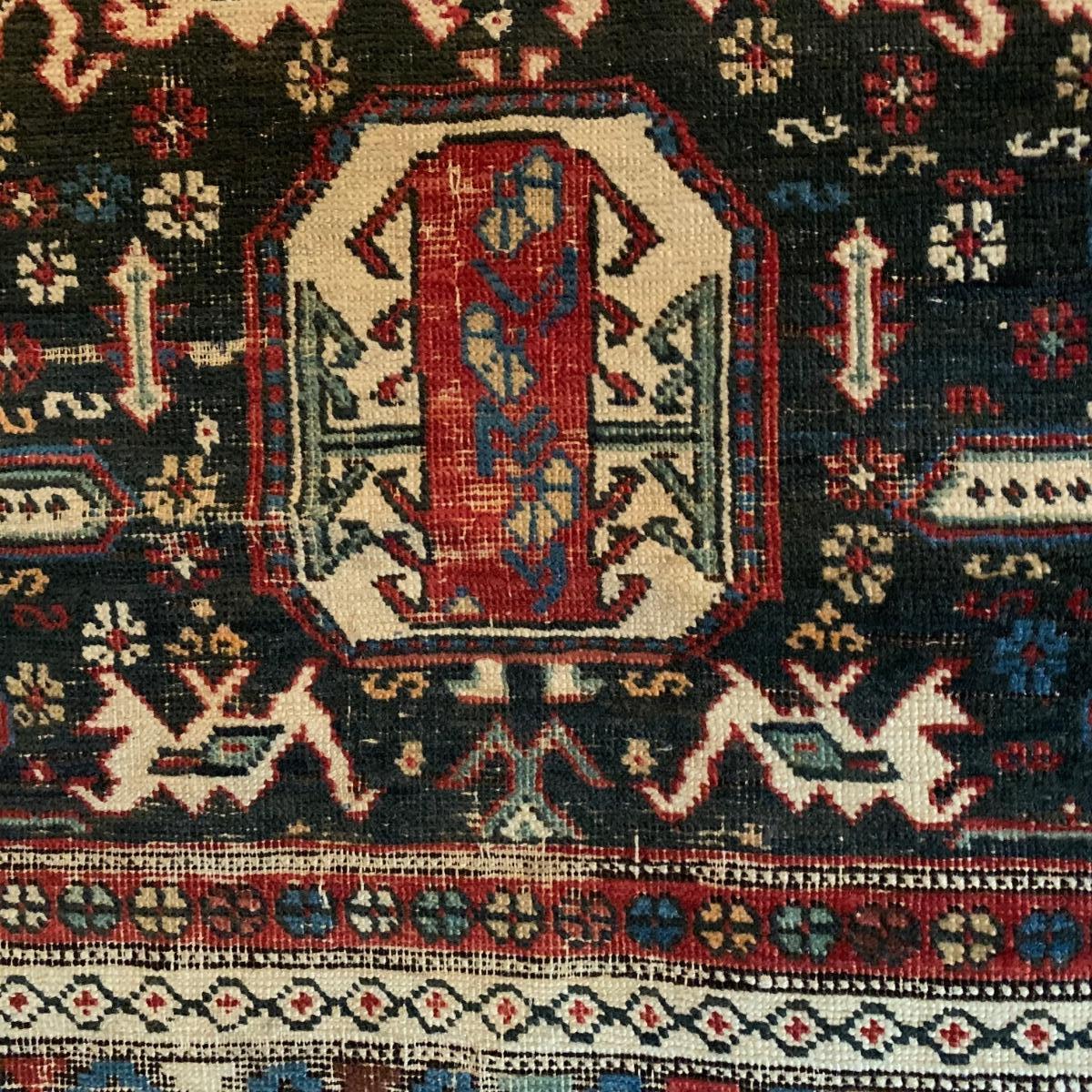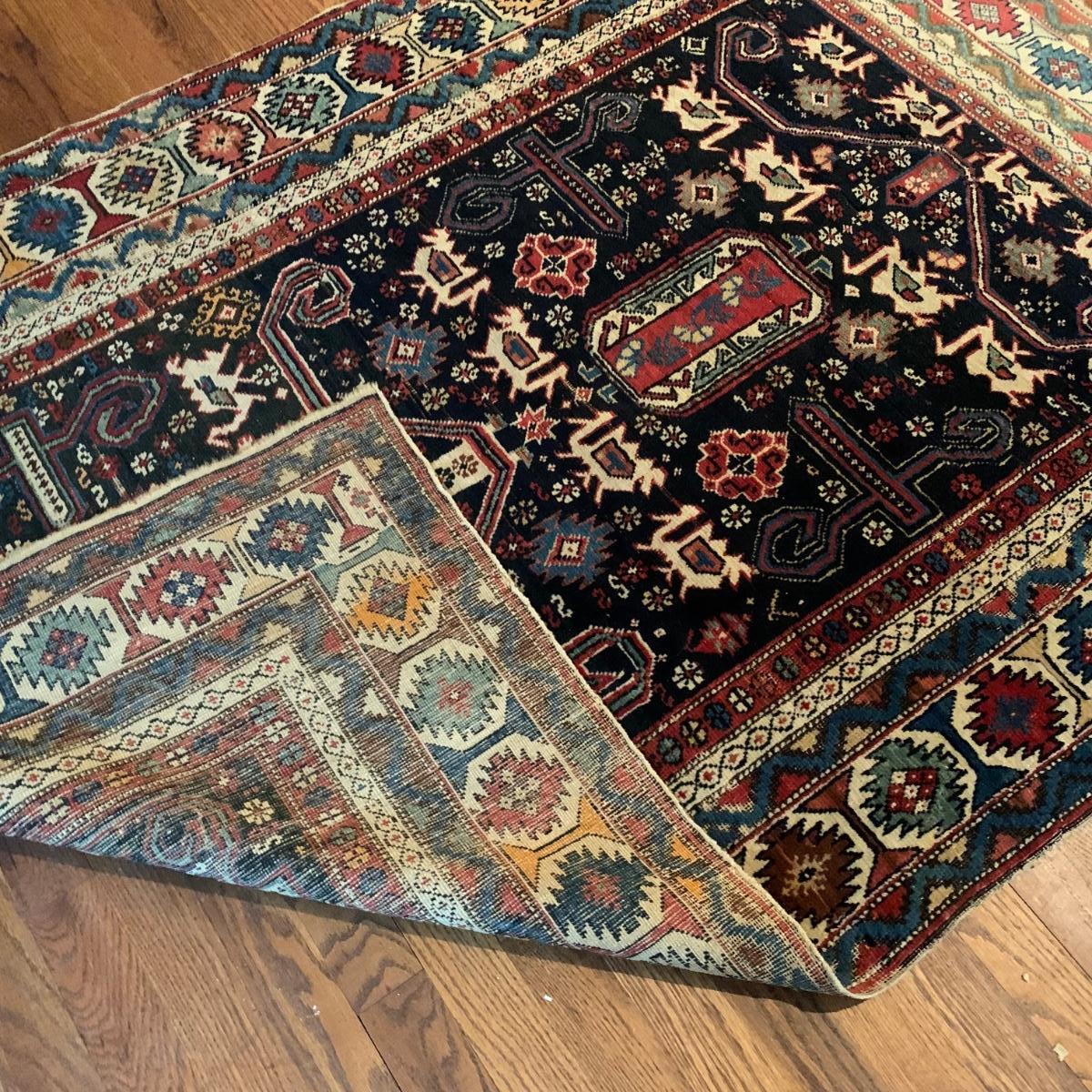 Small 5’5” x 3’9” wool area rug with flat pile. This rug is a bit worn on two sides, please see photos for more details. This rug features bright blues and delightful alpaca designs. Local pick-up only.