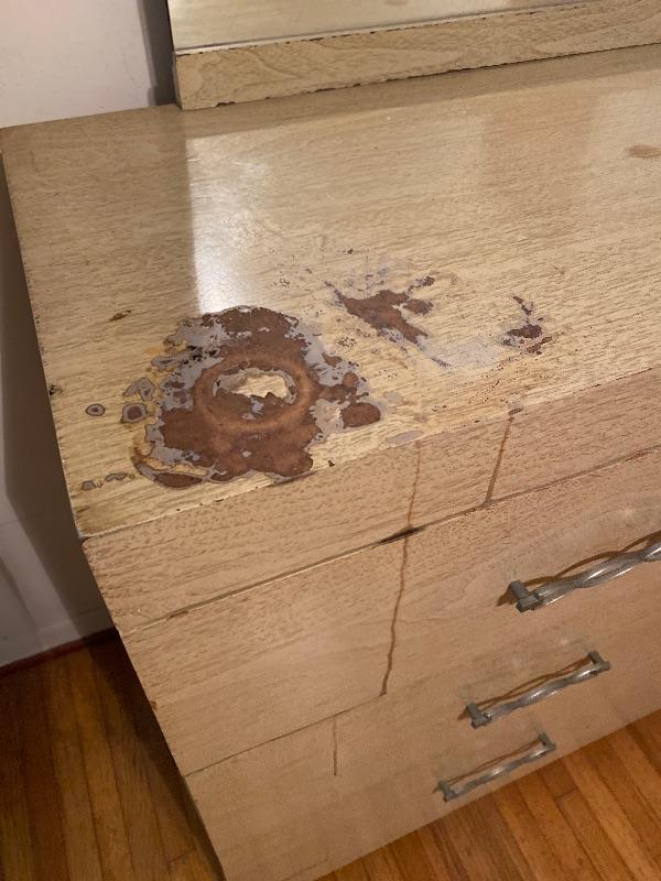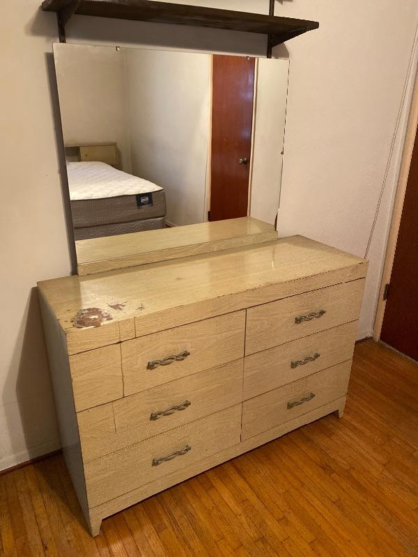 Small 6 drawer dresser with mirror. Has some damage to the finish and a chipped mirror. Great drawer pulls. Measures 47”x16.5” and is 31” high. Mirror is 36”x29”.