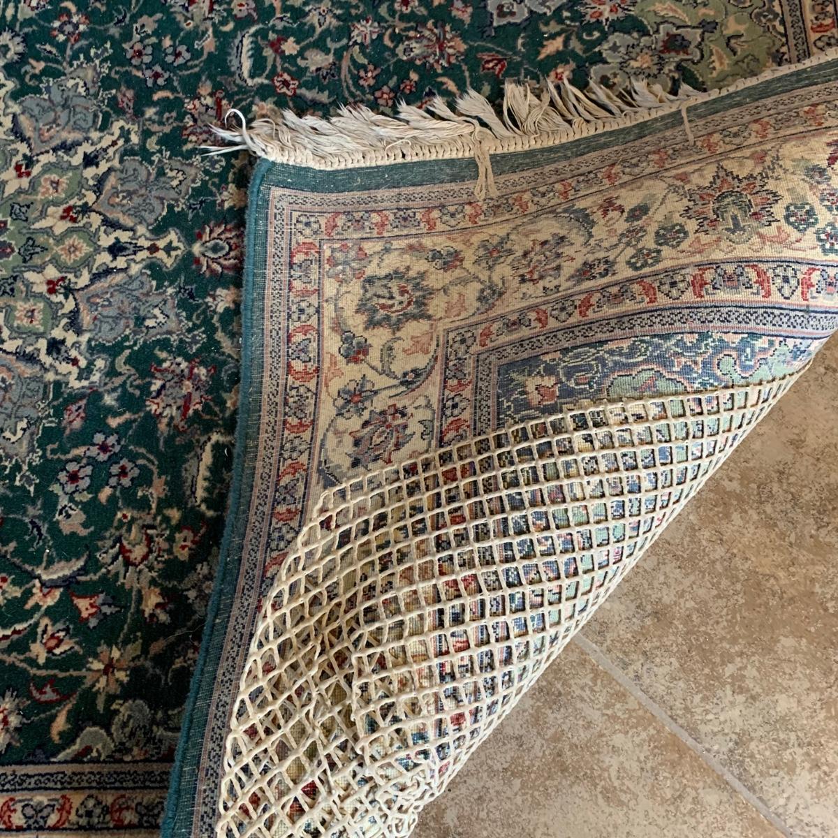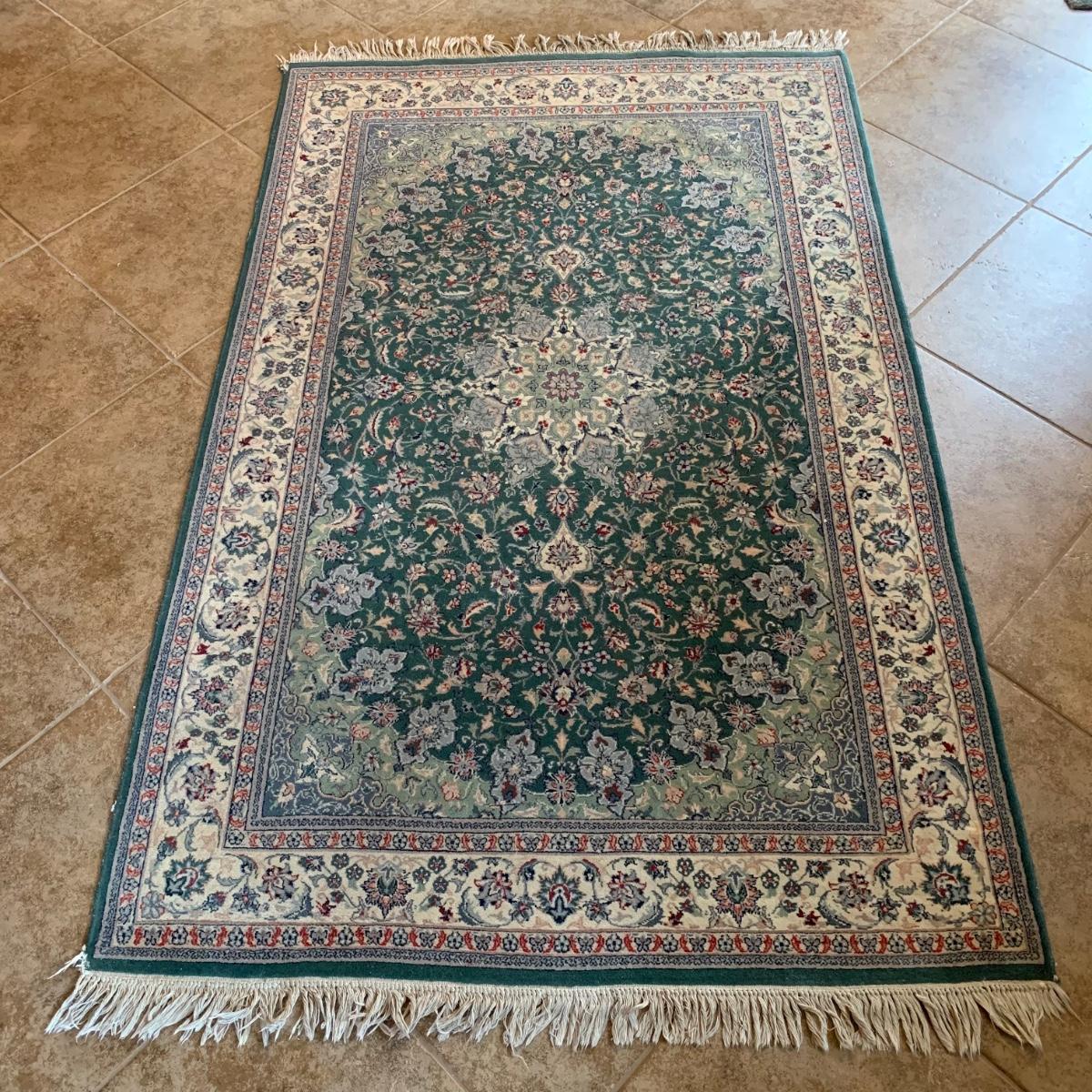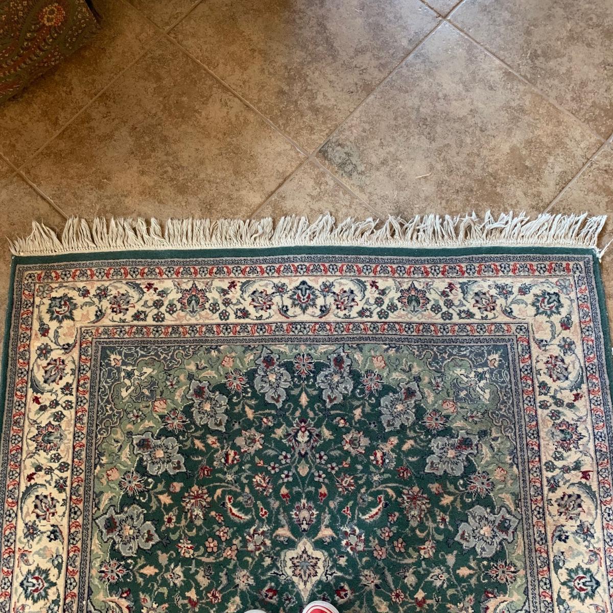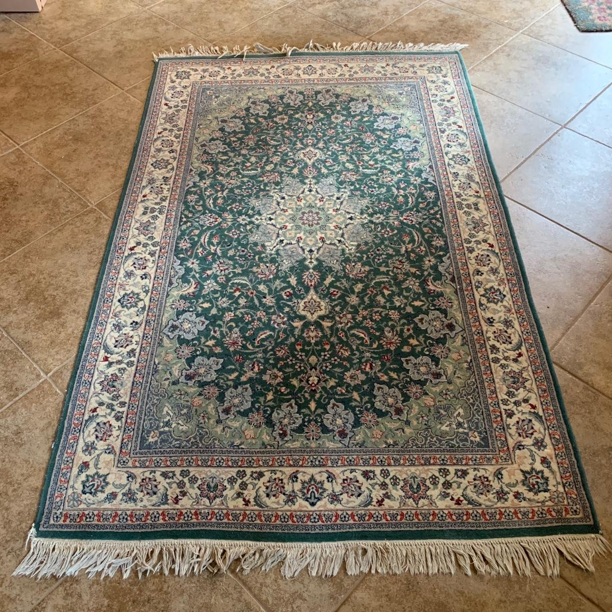 Small 6’5” x 4’1” area rug with non-slip mat. This rug features symmetrical multicolored flowers and a sage green center design, against a dark green background. There is a small rip in one corner of the rug, but this rug is otherwise in good condition. Please see photos for more details. Local pick-up only.