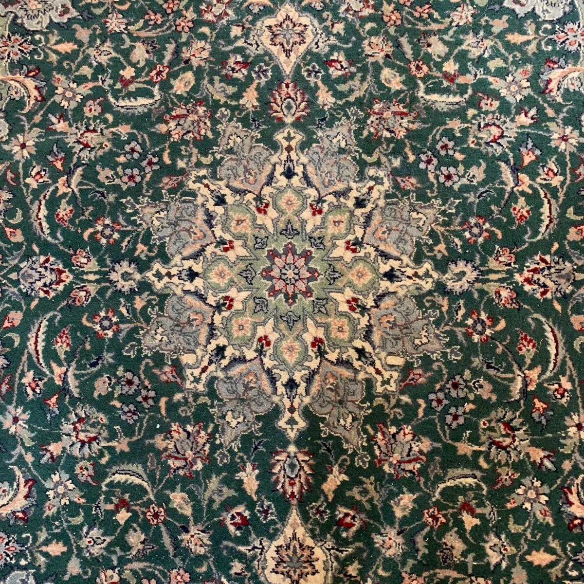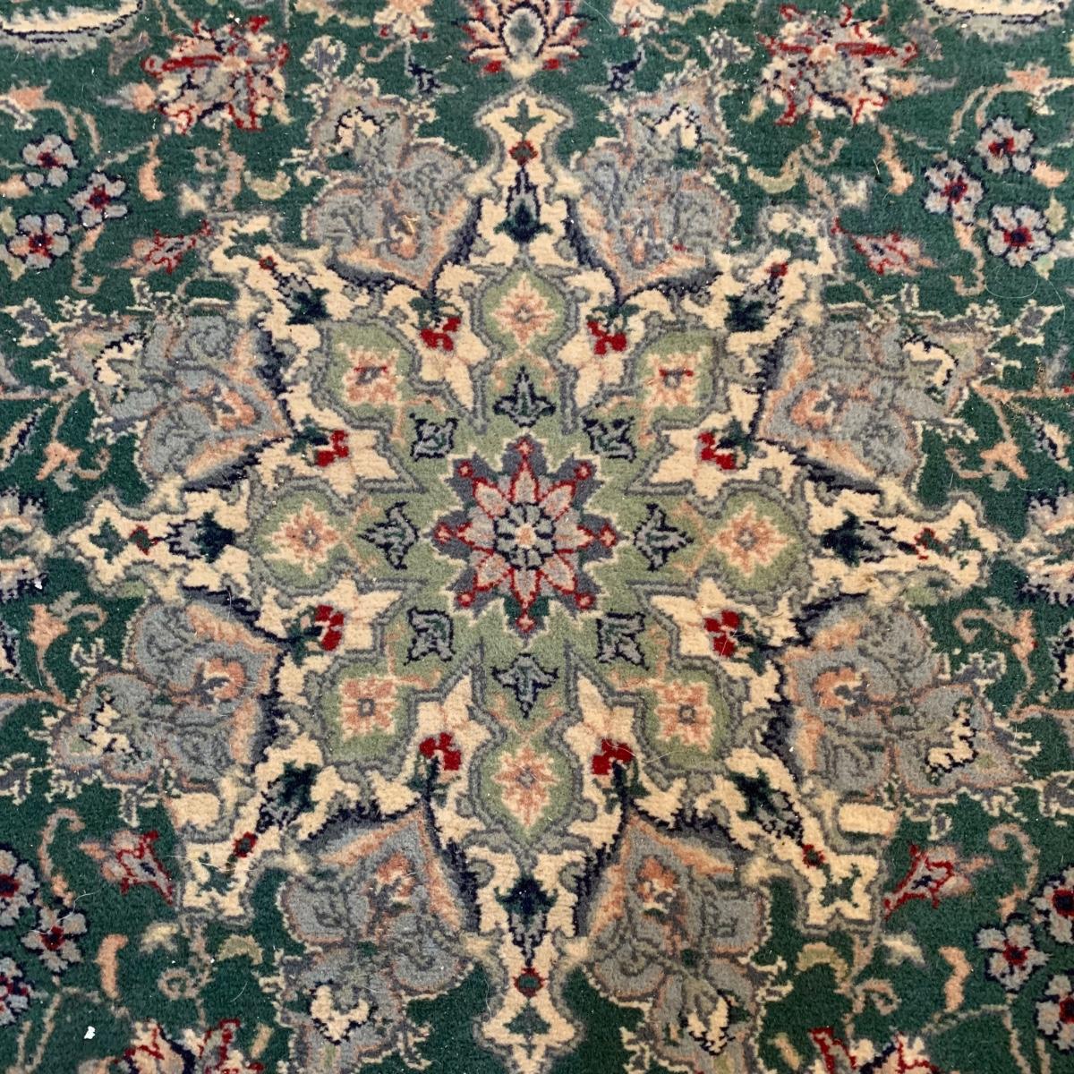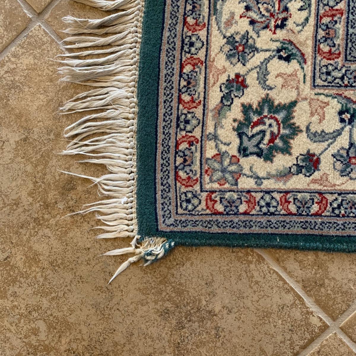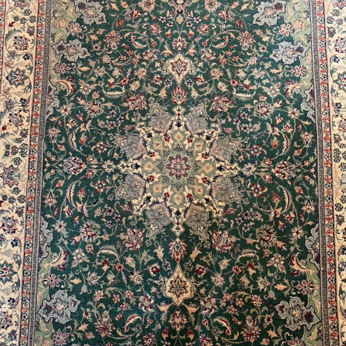 Small 6’5” x 4’1” area rug with non-slip mat. This rug features symmetrical multicolored flowers and a sage green center design, against a dark green background. There is a small rip in one corner of the rug, but this rug is otherwise in good condition. Please see photos for more details. Local pick-up only.