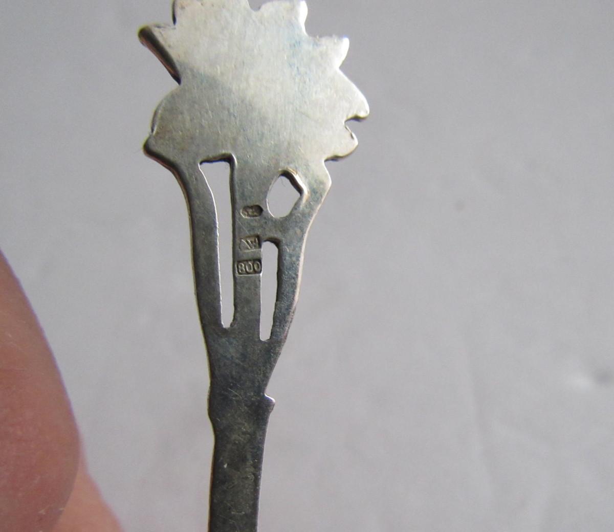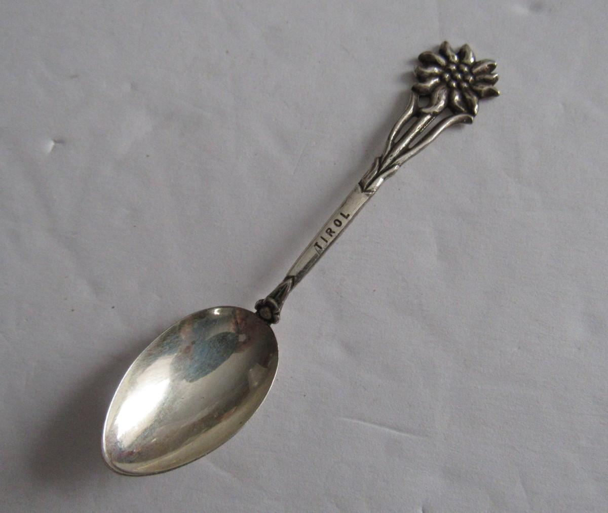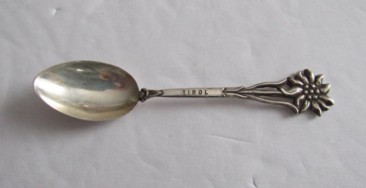 Vintage 800 silver spoon with Tirol and a Flower on the handle. It is small, 3 1/2" or so long, narrow. It is marked AW 800 on the back of the handle. It is nice quality and is in very nice shape with very little use wear. Shipping is available at actual shipping cost plus $5.00 handling fee per box for supplies/labor. See our terms for details. All sales are final. Condition notes may not be all inclusive, we may miss some issues as most vintage items are not in mint condition and have some degree of wear, paint loss, etc, but we always try to note obvious damage.