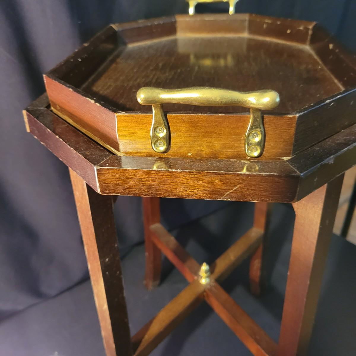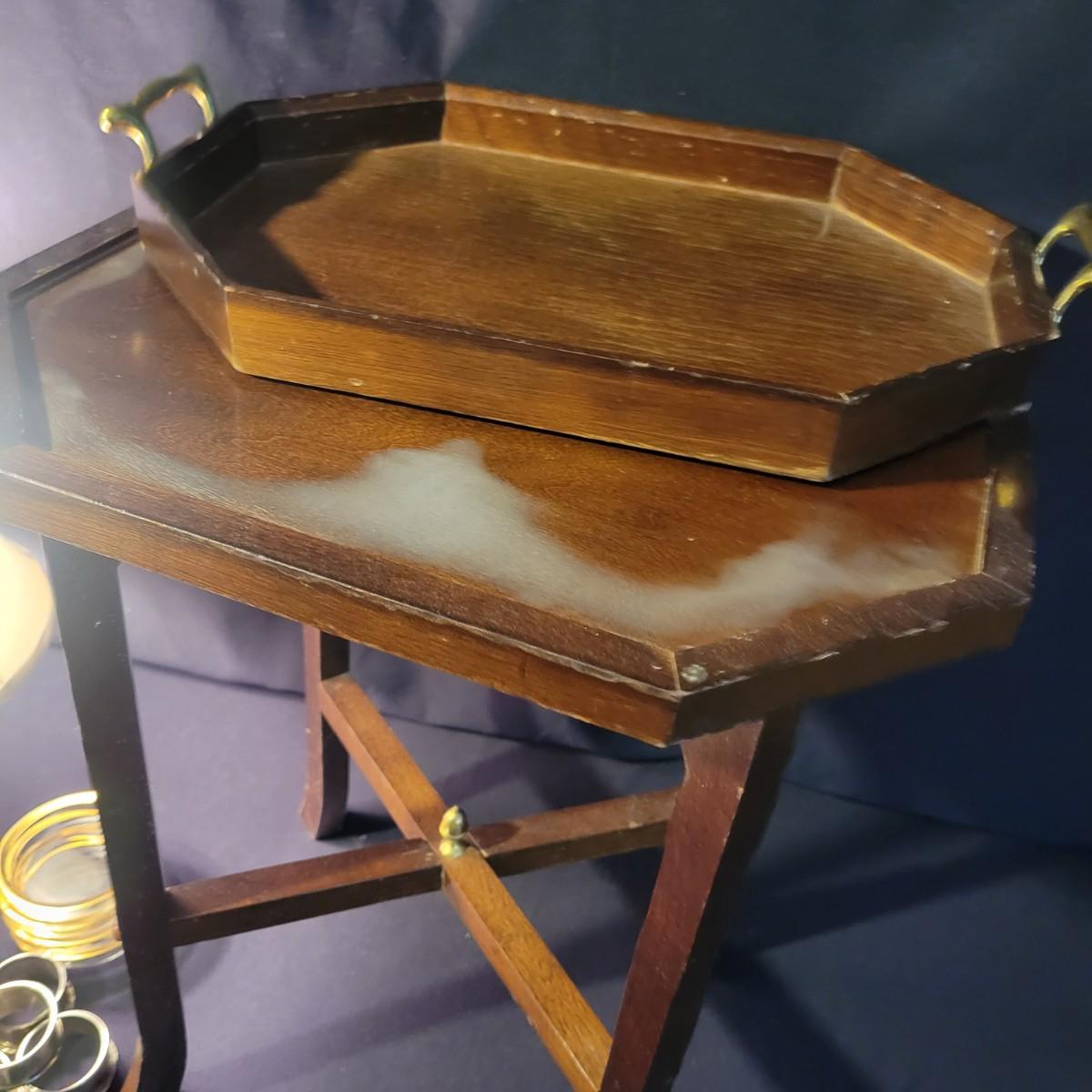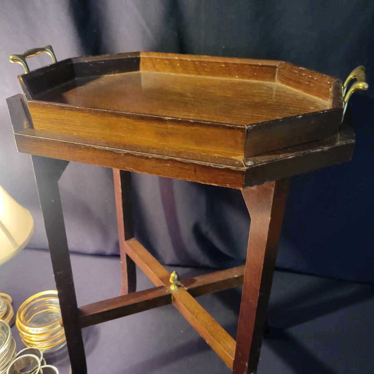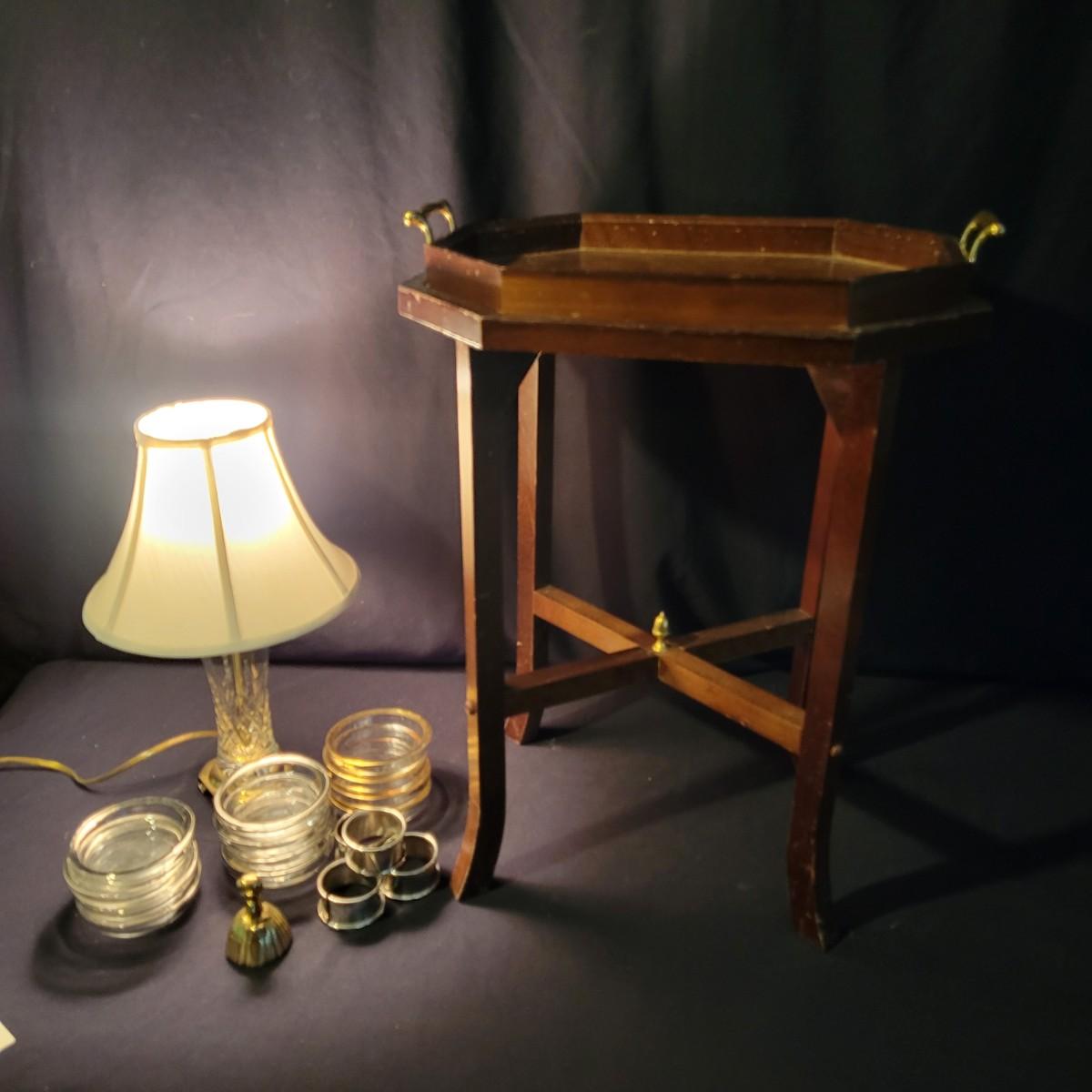 A small accent table with a removable tray in good condition with some scuffs and scratches. Wood surface under the tray is a little cloudy. See attached pictures for more detail. Also included is a small glass and metal table lamp in good condition, 8 glass coasters with silver edging, 4 glass coasters with golden edging, 4 silver plated napkin rings, and a small brass bell in the shape of a Victorian woman. Small accent table measures approximately 16" x 12" x 20.5". Shipping available