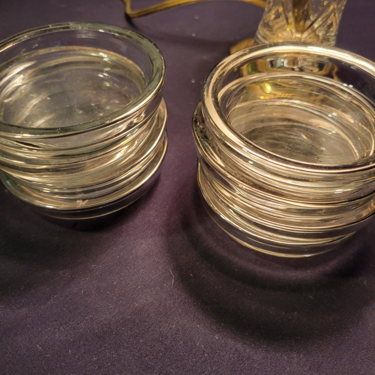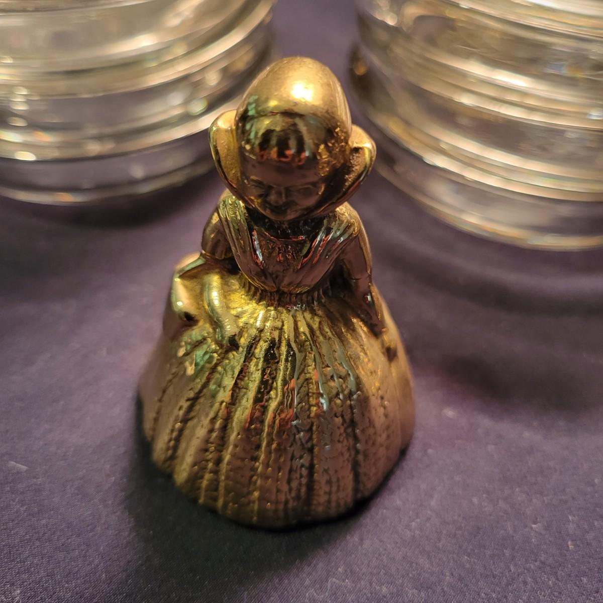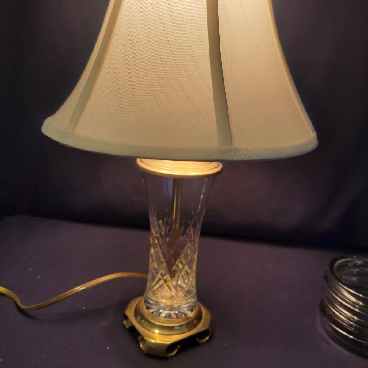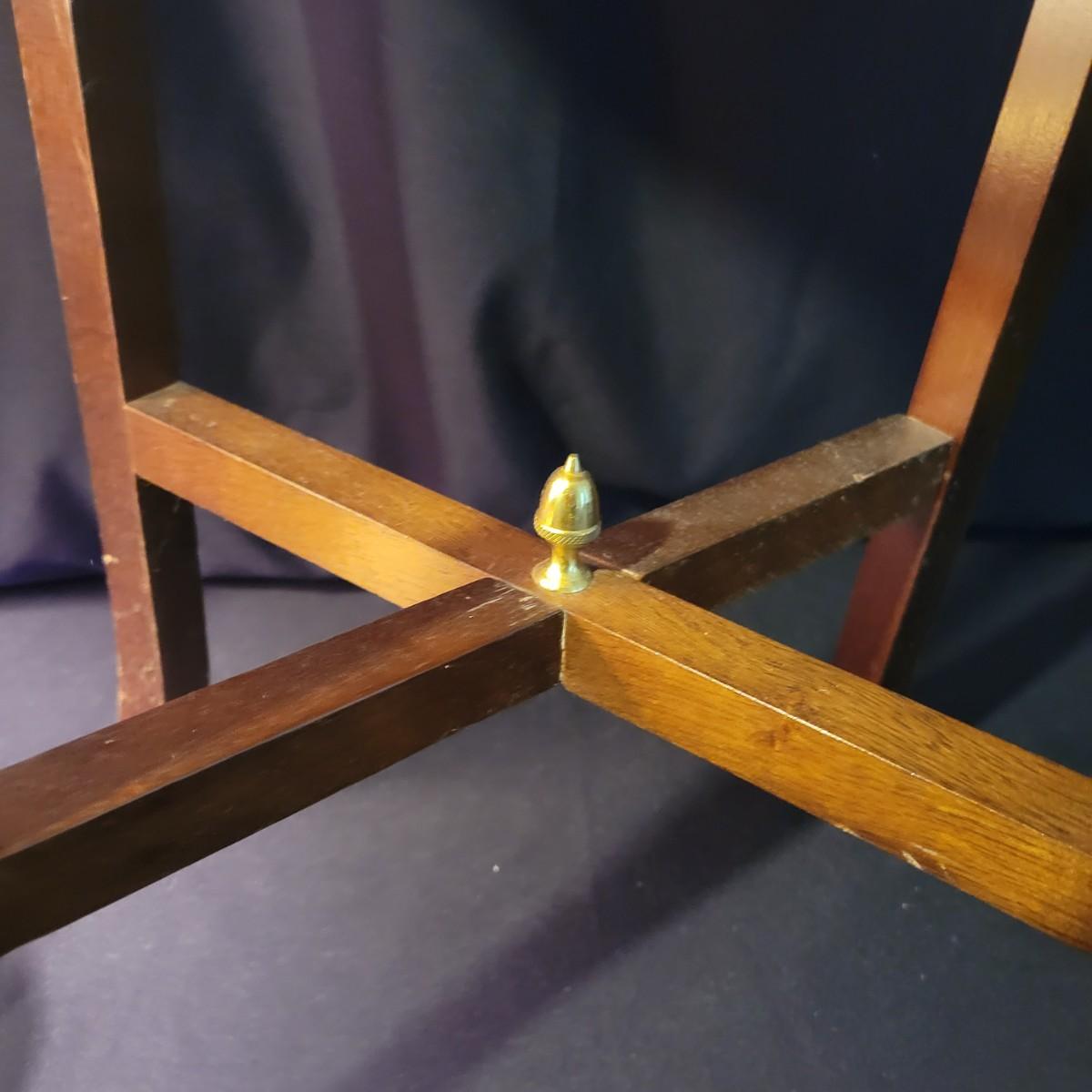 A small accent table with a removable tray in good condition with some scuffs and scratches. Wood surface under the tray is a little cloudy. See attached pictures for more detail. Also included is a small glass and metal table lamp in good condition, 8 glass coasters with silver edging, 4 glass coasters with golden edging, 4 silver plated napkin rings, and a small brass bell in the shape of a Victorian woman. Small accent table measures approximately 16" x 12" x 20.5". Shipping available