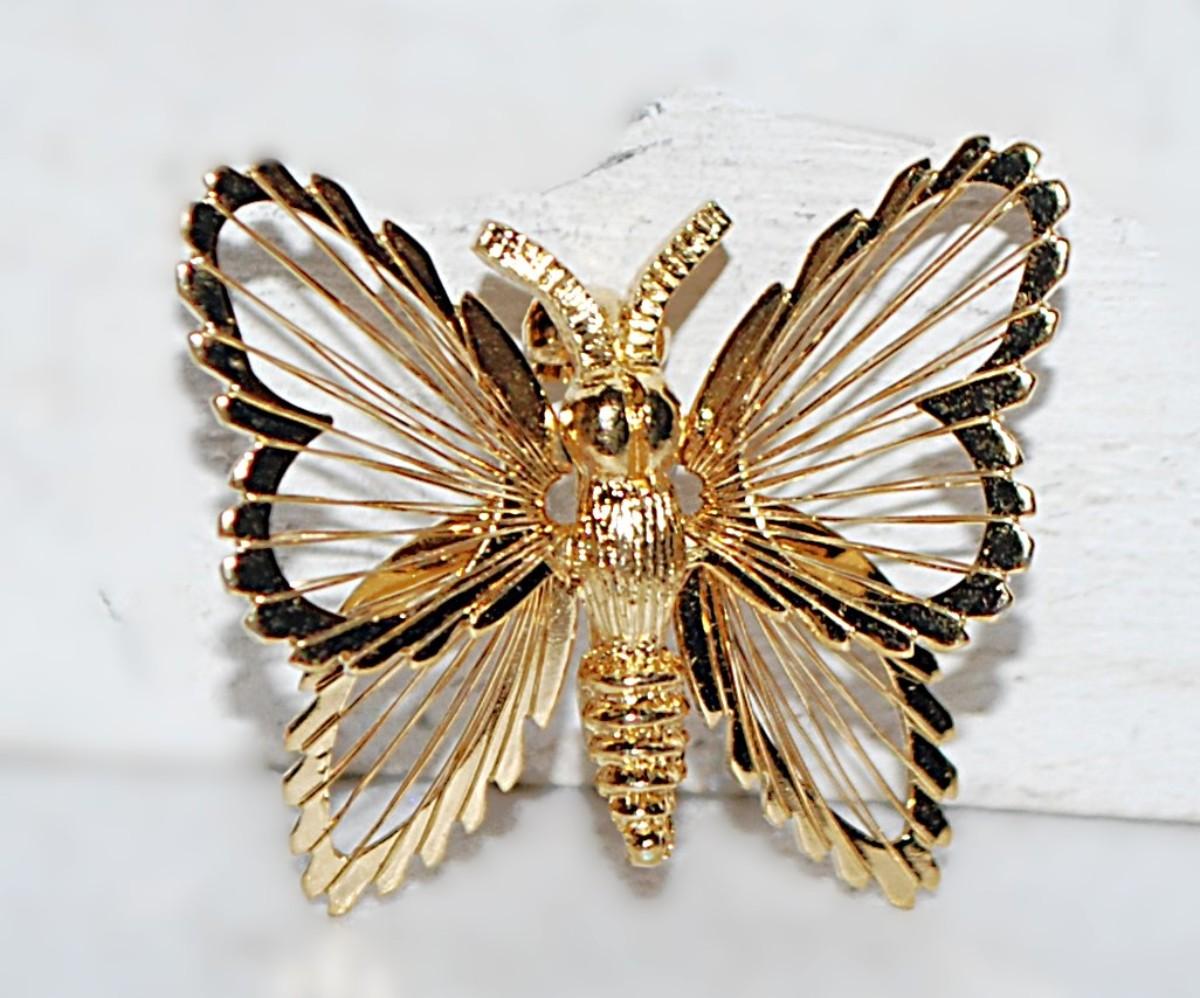 Small ALL GOLD Colored BUTTERFLY BROOCH (¾" x ¾") with Wire Art Leme' Wings on a Gold Tone Setting