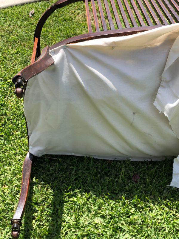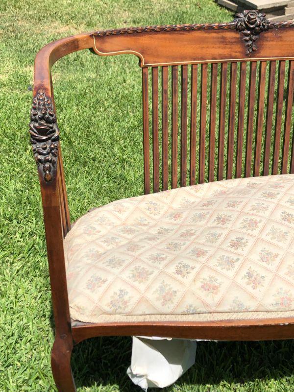 Antique wood love seat bench. Spindel wood back and sides. Needs a little work, especially the seat. Has a repair spot along the top back curve on the right. Beautiful carved flower accents.