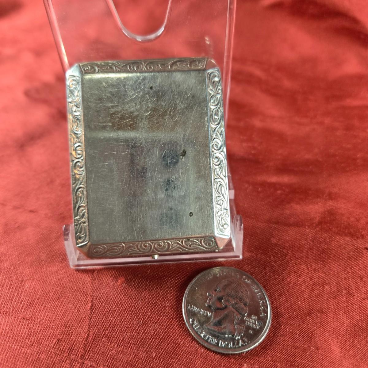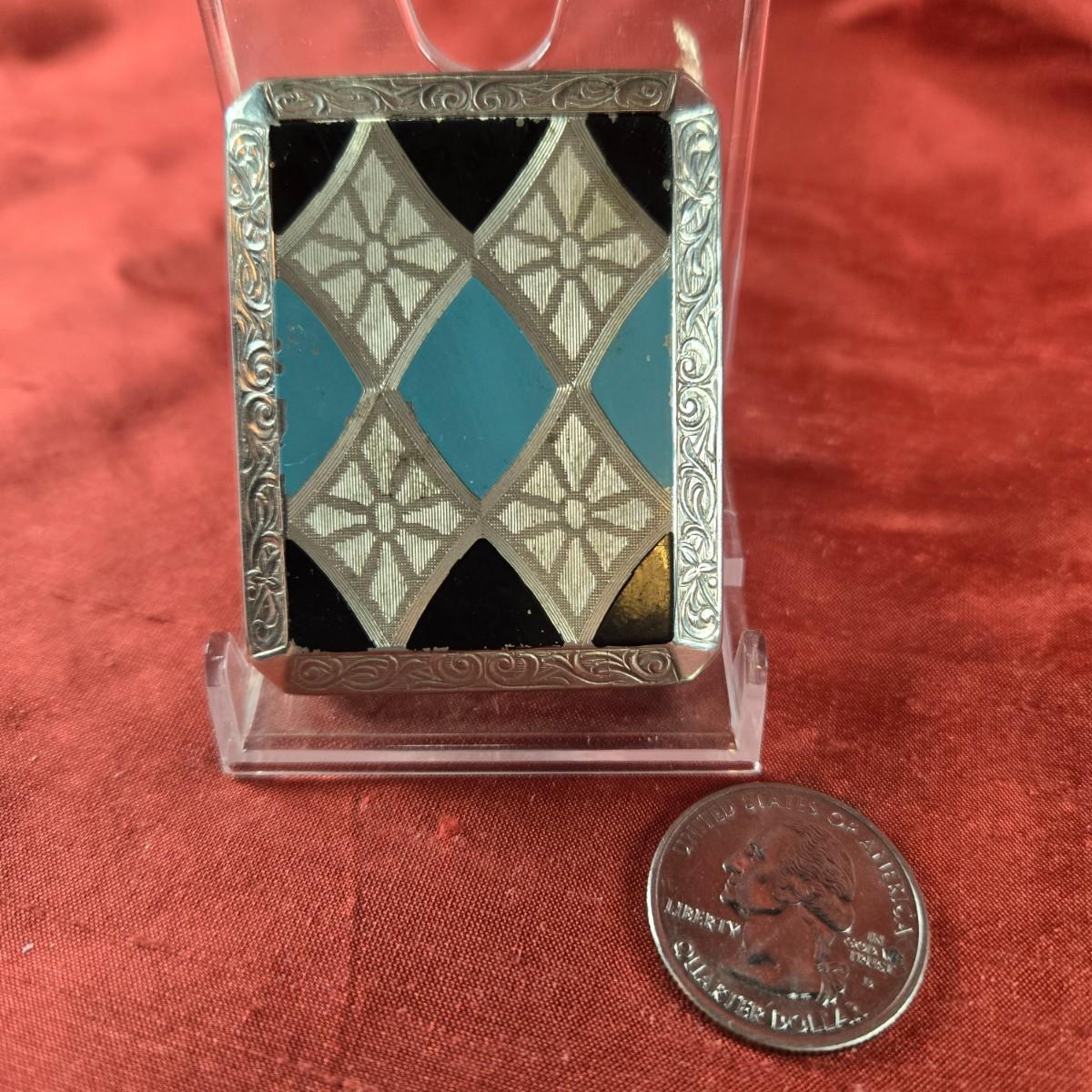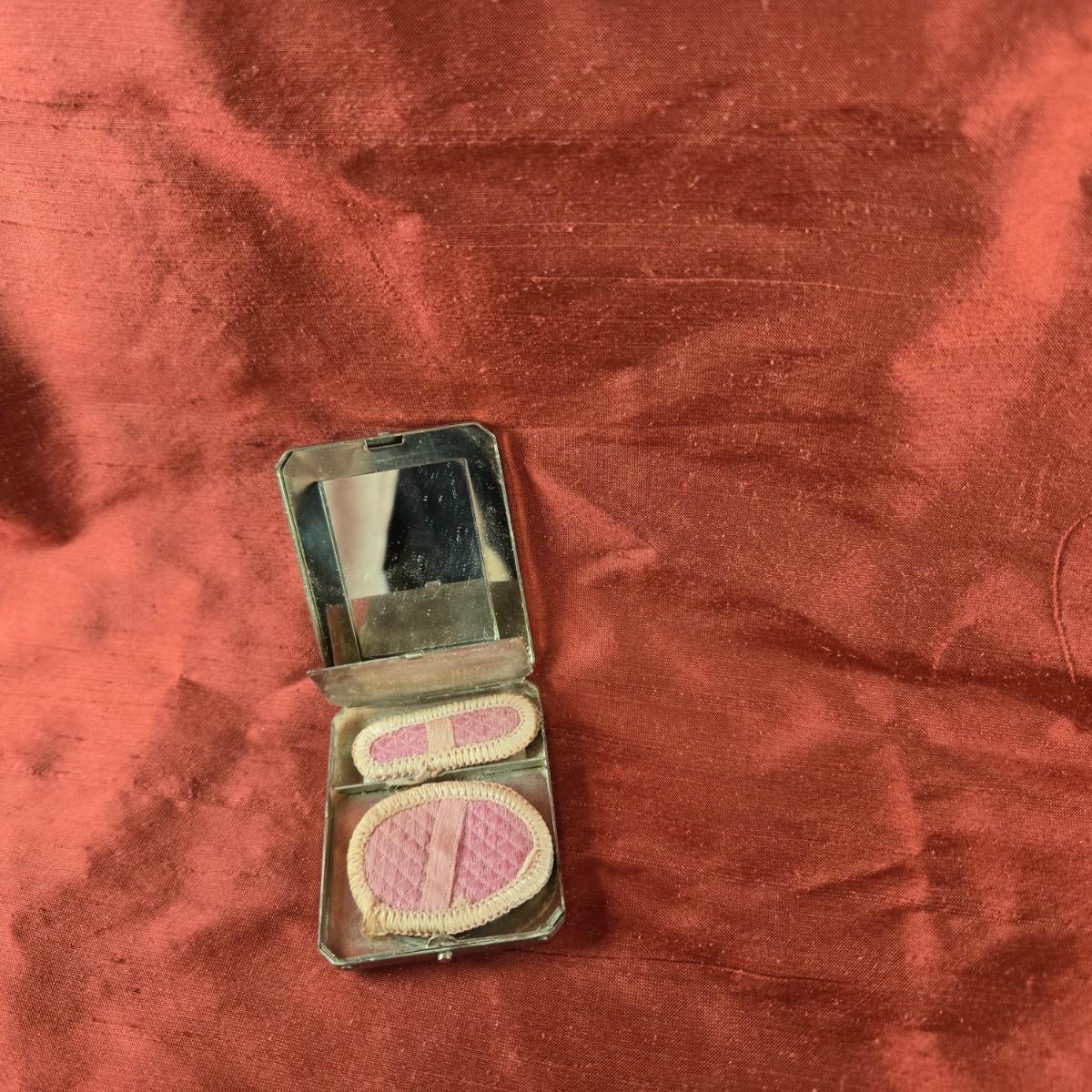 This auction lot is for a very nice Small Art Deco Ladies Compact made in the USA by EBM Co. It contains no powder. Inside has two compartments with pads, mirror is good. It is about 1.75-inches wide by 2.25-inches long. Very stylish, great design.