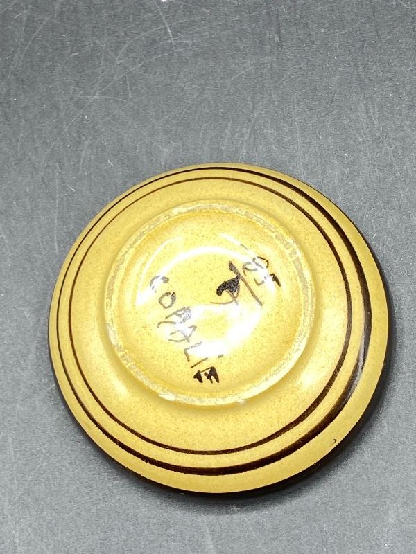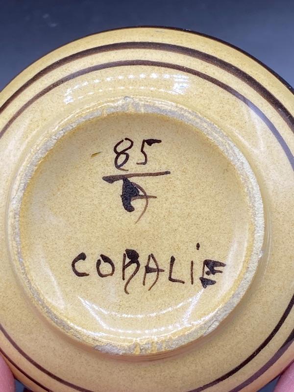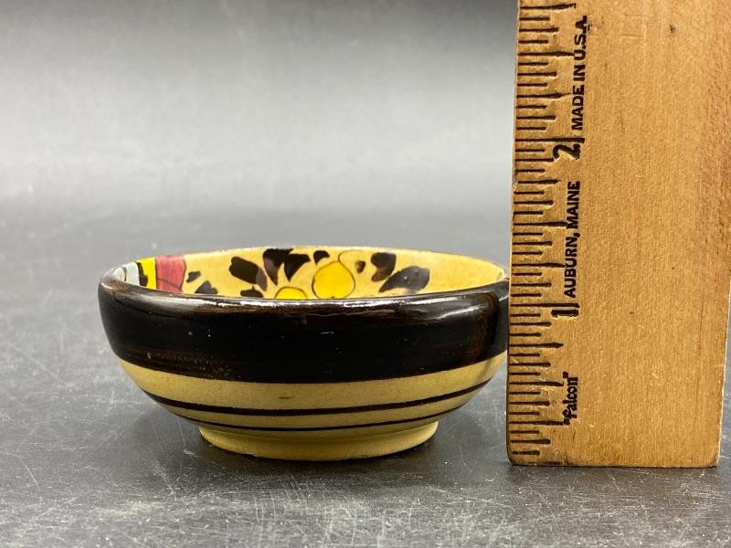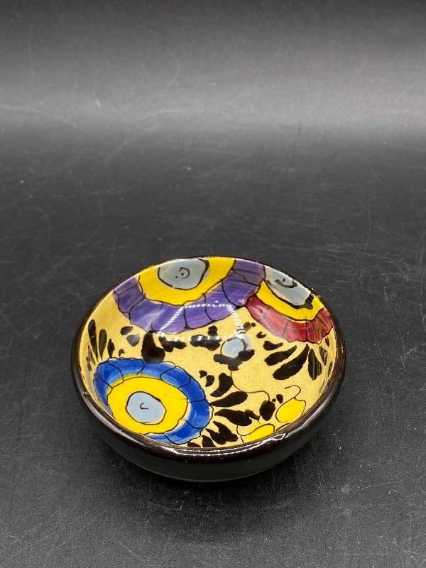 Small artist signed pottery bowl. Almost 3" diameter. Has flowers painted inside. Bottom is signed "85/A Coralie" it looks like. Good condition.