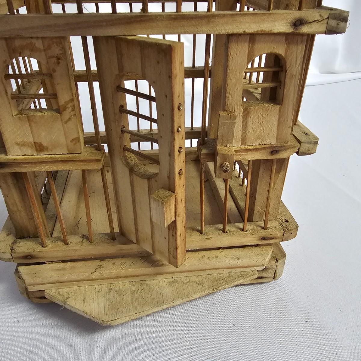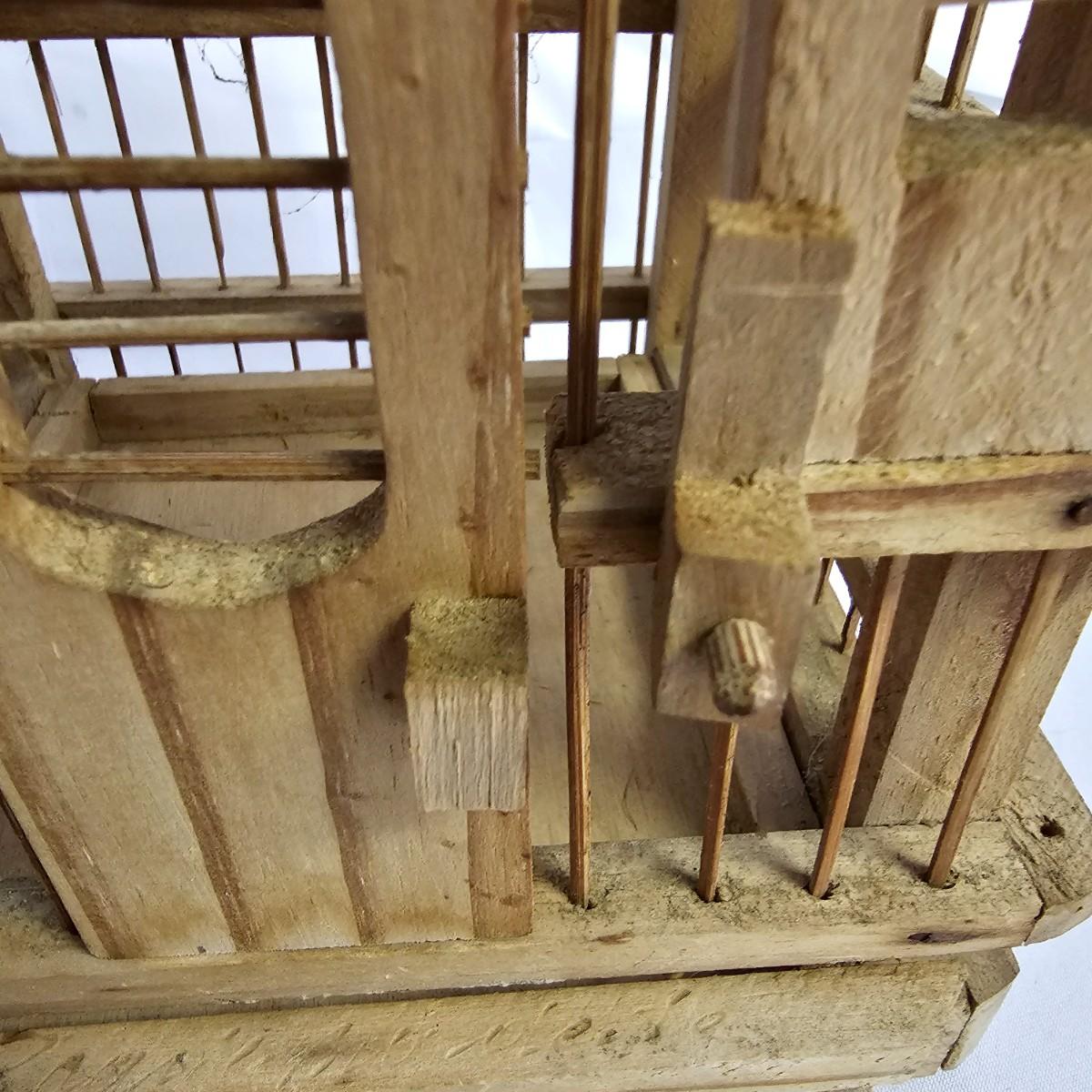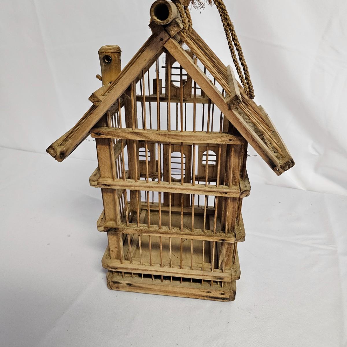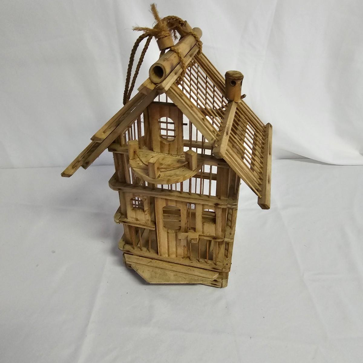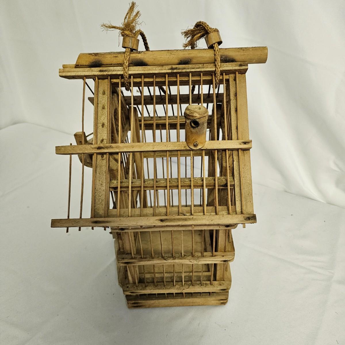 Handmade bamboo bird cage with braided hanging rope. Opening door, pull out base tray for cleaning. Cage measures 11.5" x 10" x 16"H. Latch on door missing a piece. See photos for details. Shipping available. Shipping can be costly. We suggest contacting our preferred local shipping provider, Postage Express, with dimensions and getting an estimate before bidding: (828) 670-5501 or postageexpress@yahoo.com.