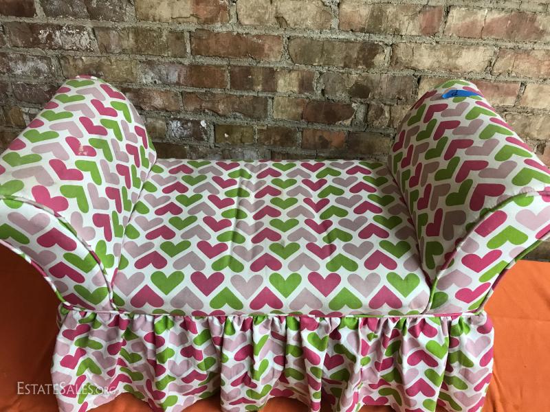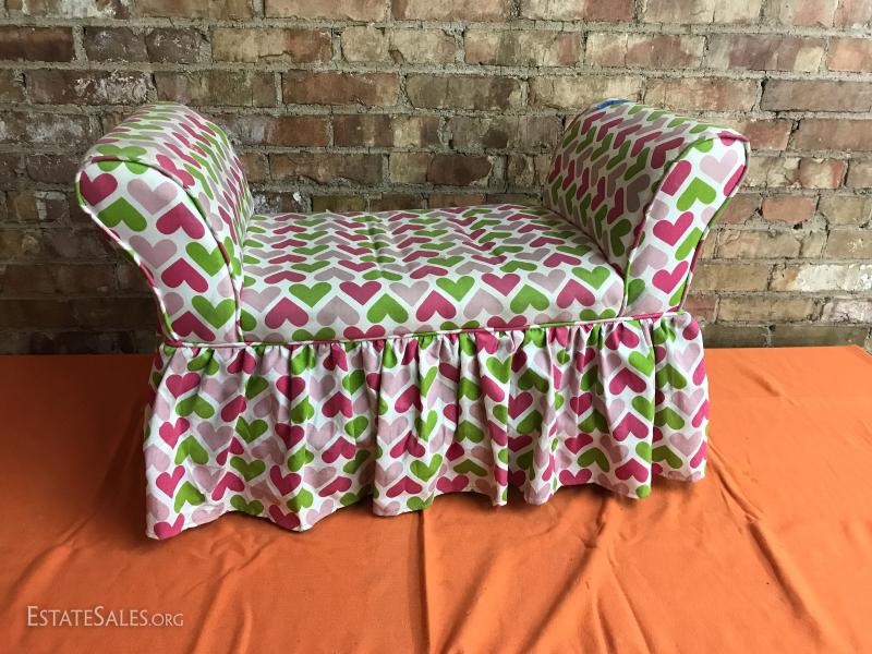 Upholstered bench heart fabric, 15" by 30", 19" tall at the arm. Good condition, light wear from use.