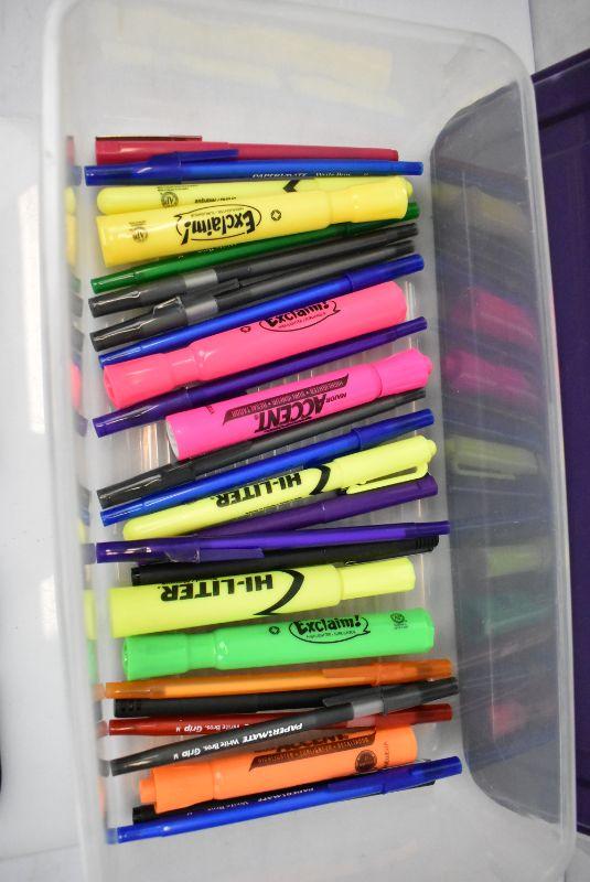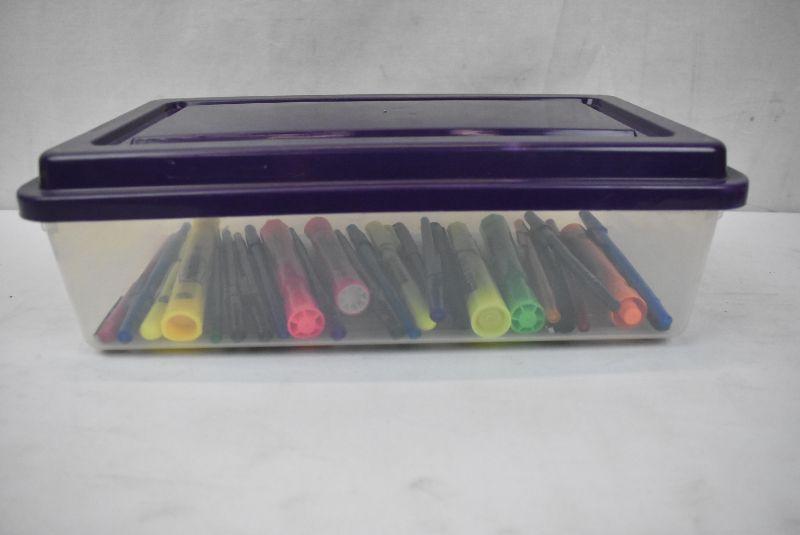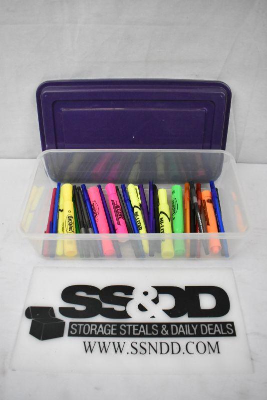 Small Bin (shoe box size, clear w/ purple lid) with 26 Pens & Highlighters