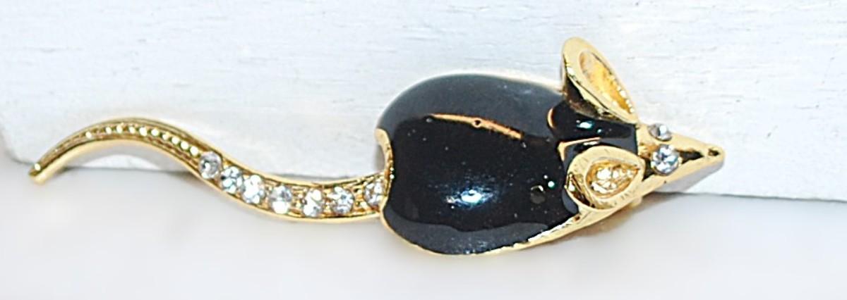 Small BLACK MOUSE BROOCH (2" x ½") with MOVEABLE Bejeweled TAIL & Gold Colored Ears and Face on a Gold Tone Setting
