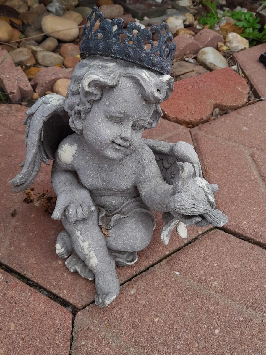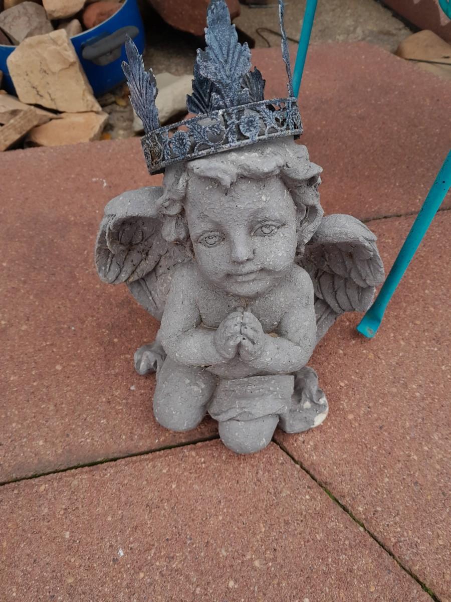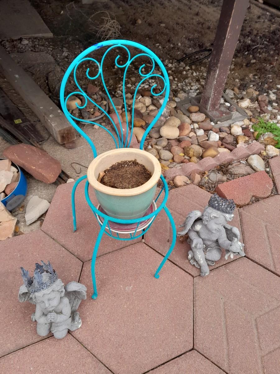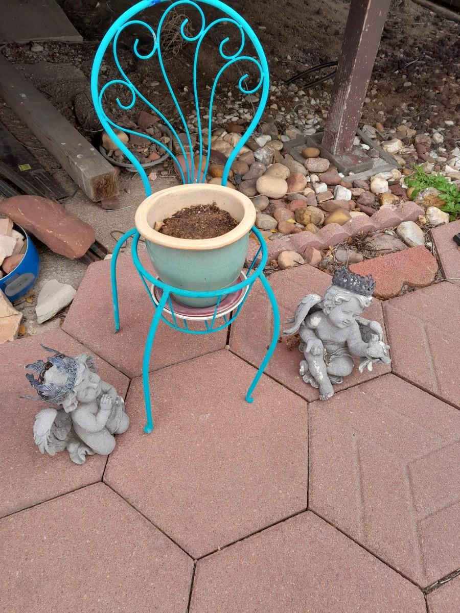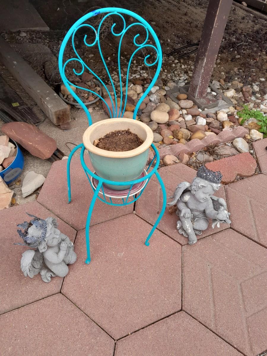 SMALL BLUE CHAIR PLANTER WITH FLOWERPOT AND TWO GARDEN ANGELS