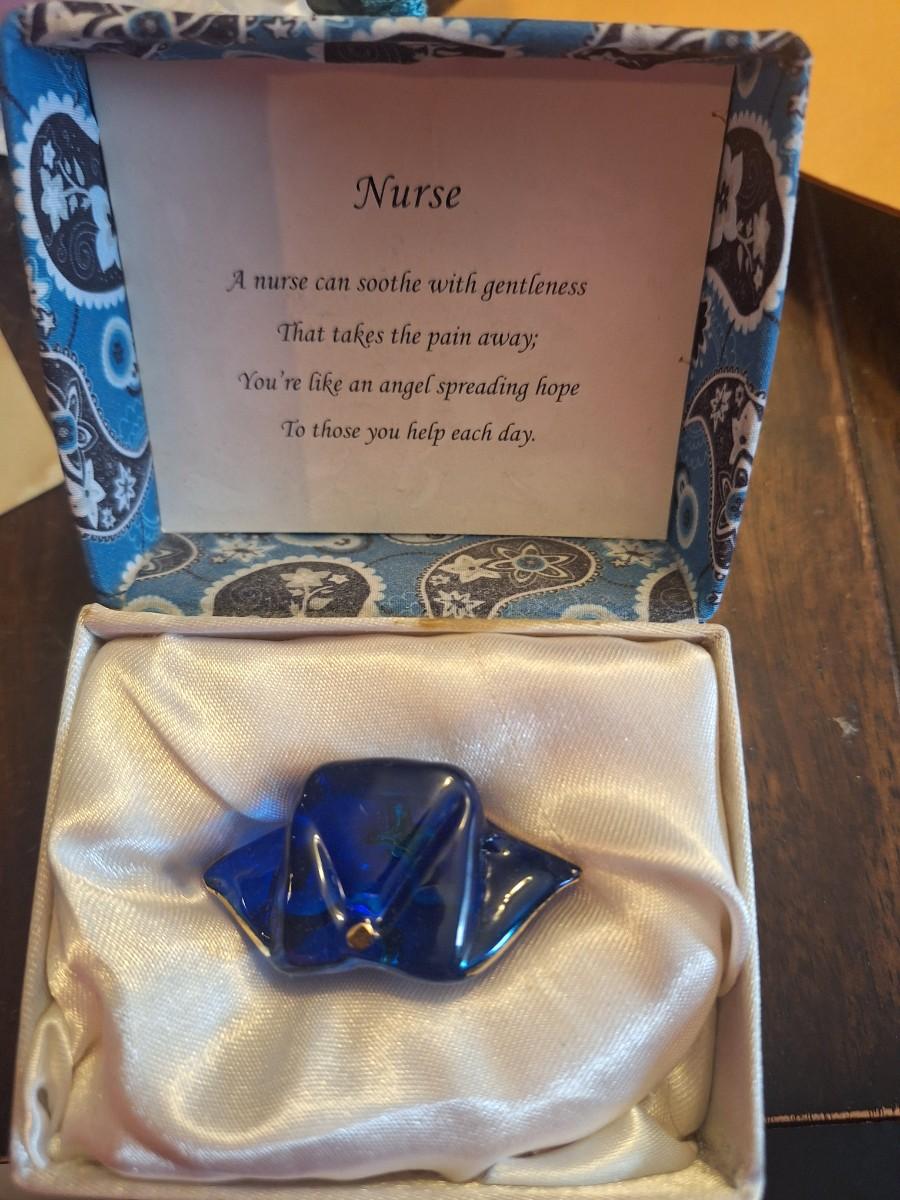 small blue glass keepsake nurses hat and gift box.