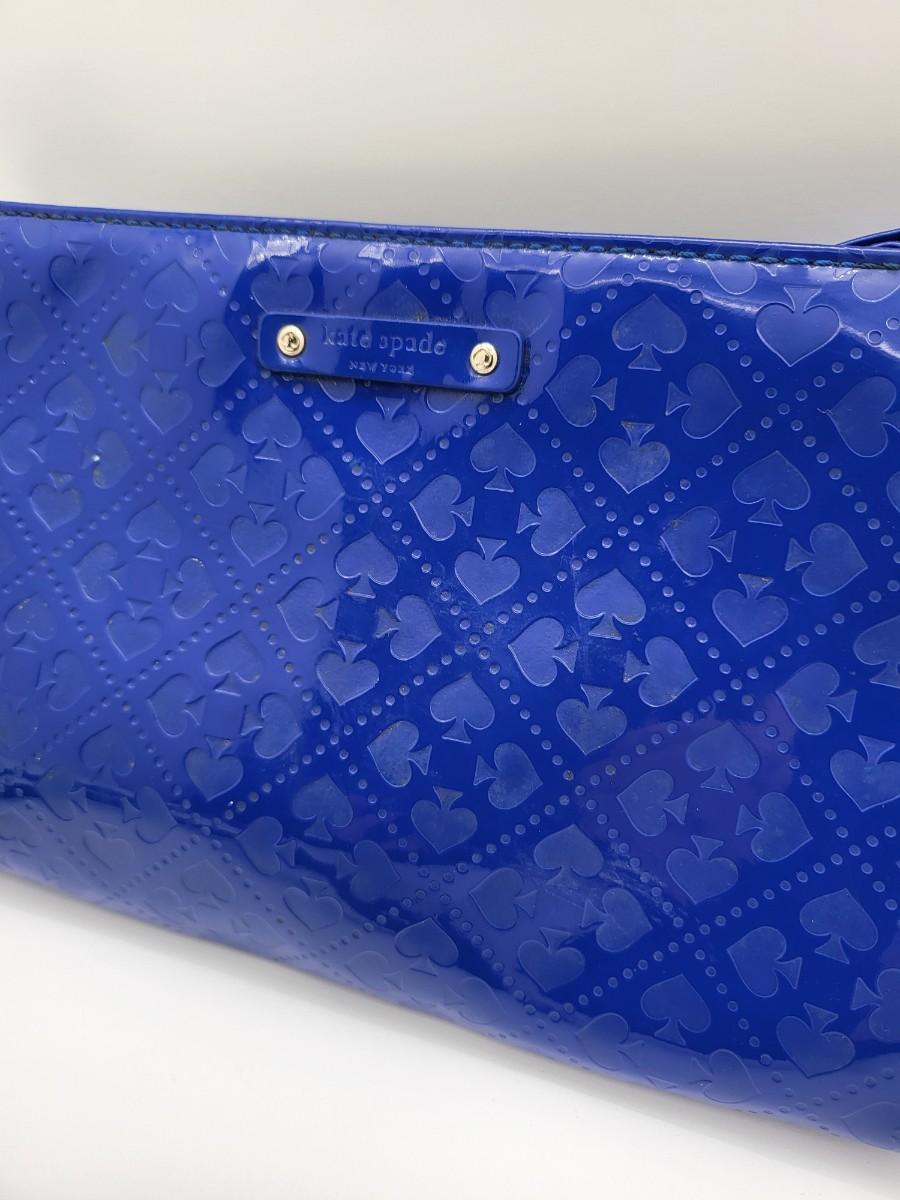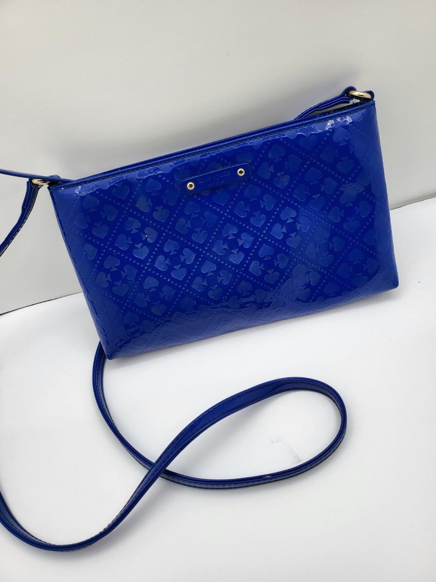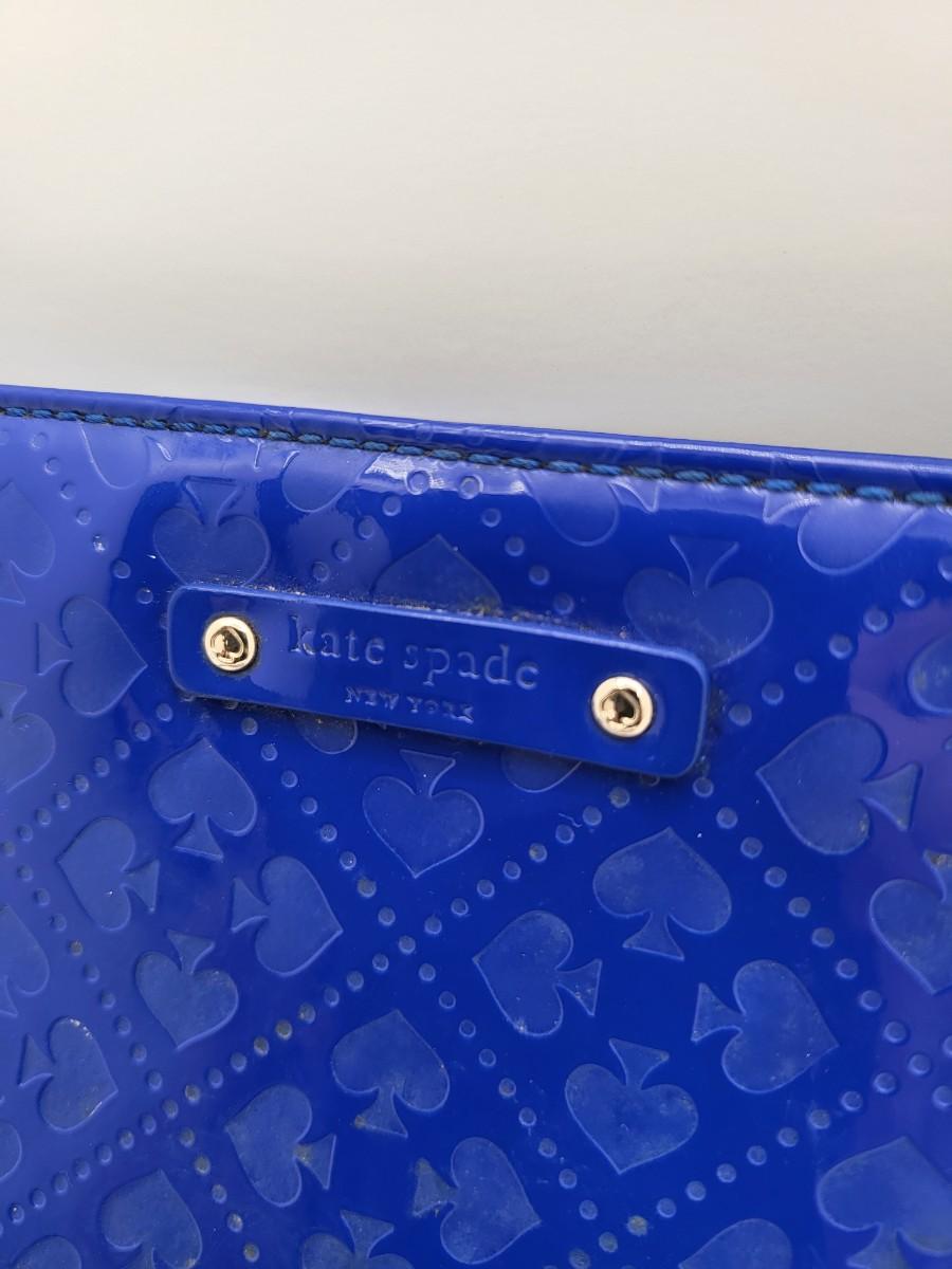 Small blue patent/vinyl spades motif. This authentic Kate Spade bag measures 9" long x 6" tall. Zipper top closure, and a crossbody length strap.