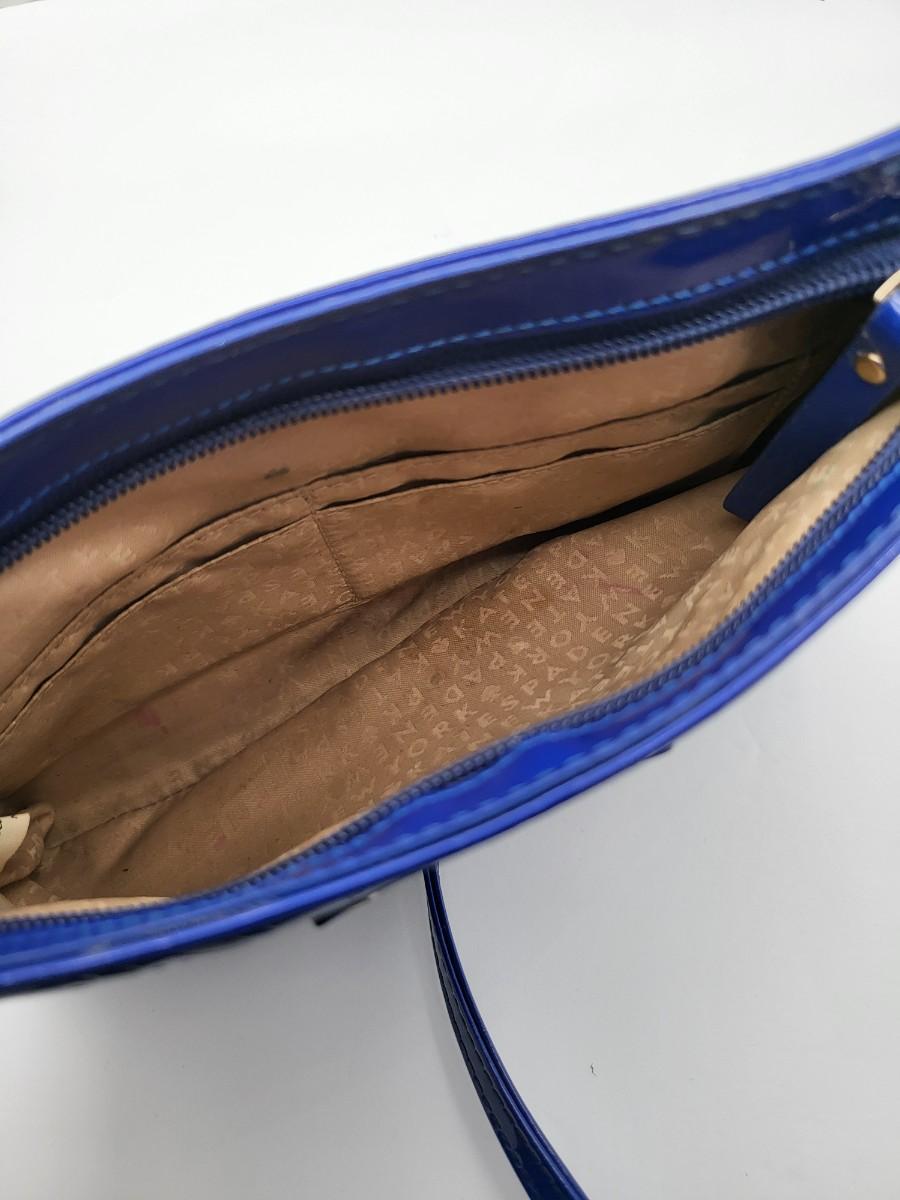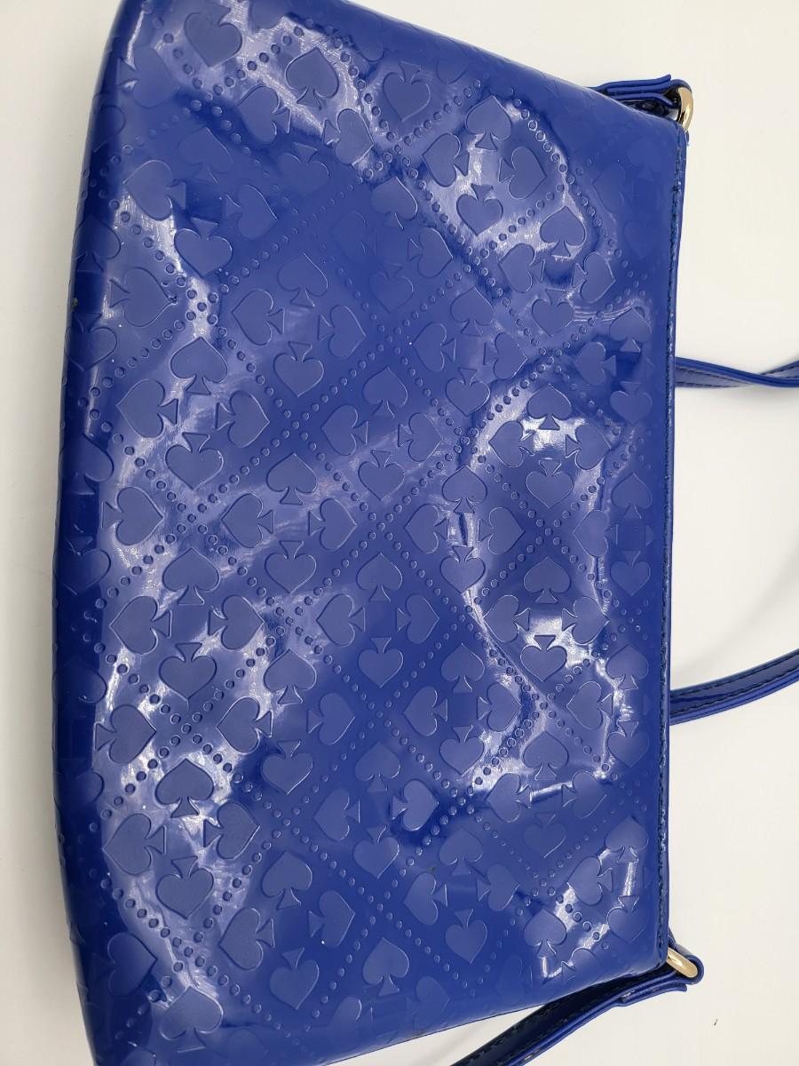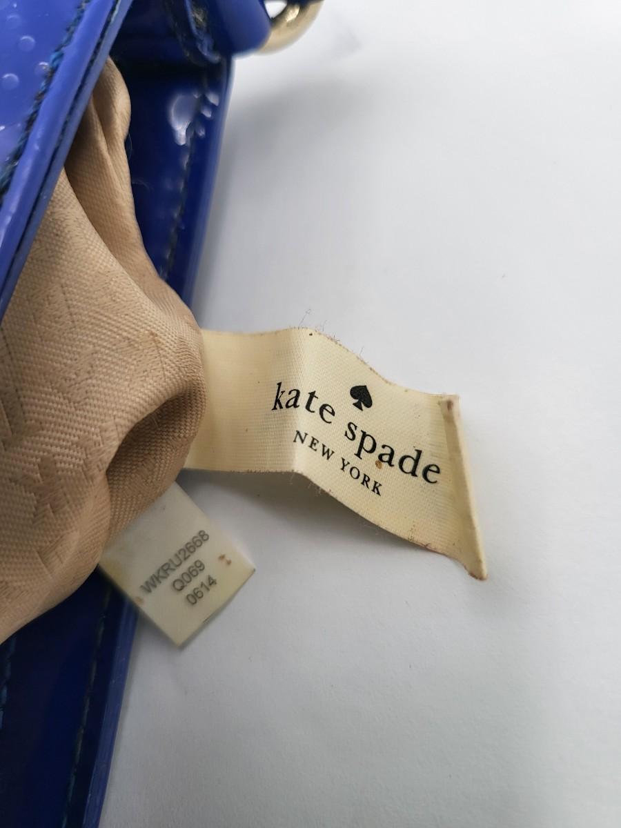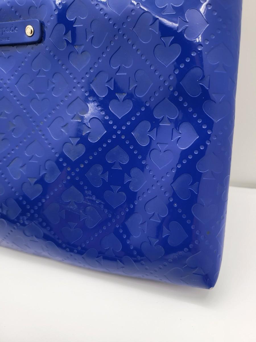 Small blue patent/vinyl spades motif. This authentic Kate Spade bag measures 9" long x 6" tall. Zipper top closure, and a crossbody length strap.