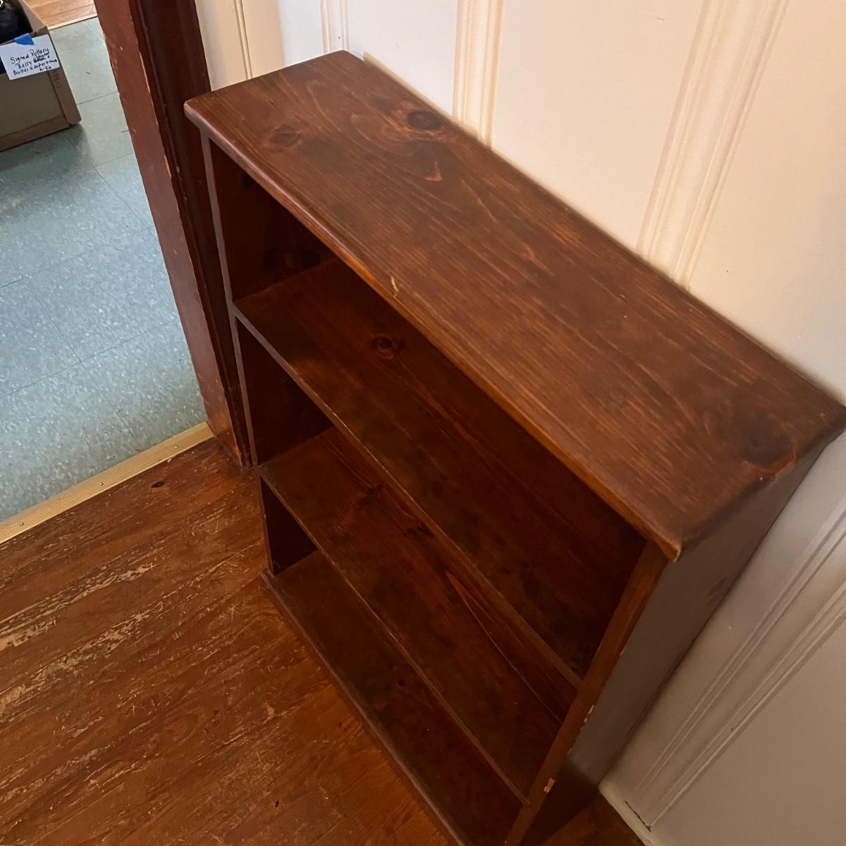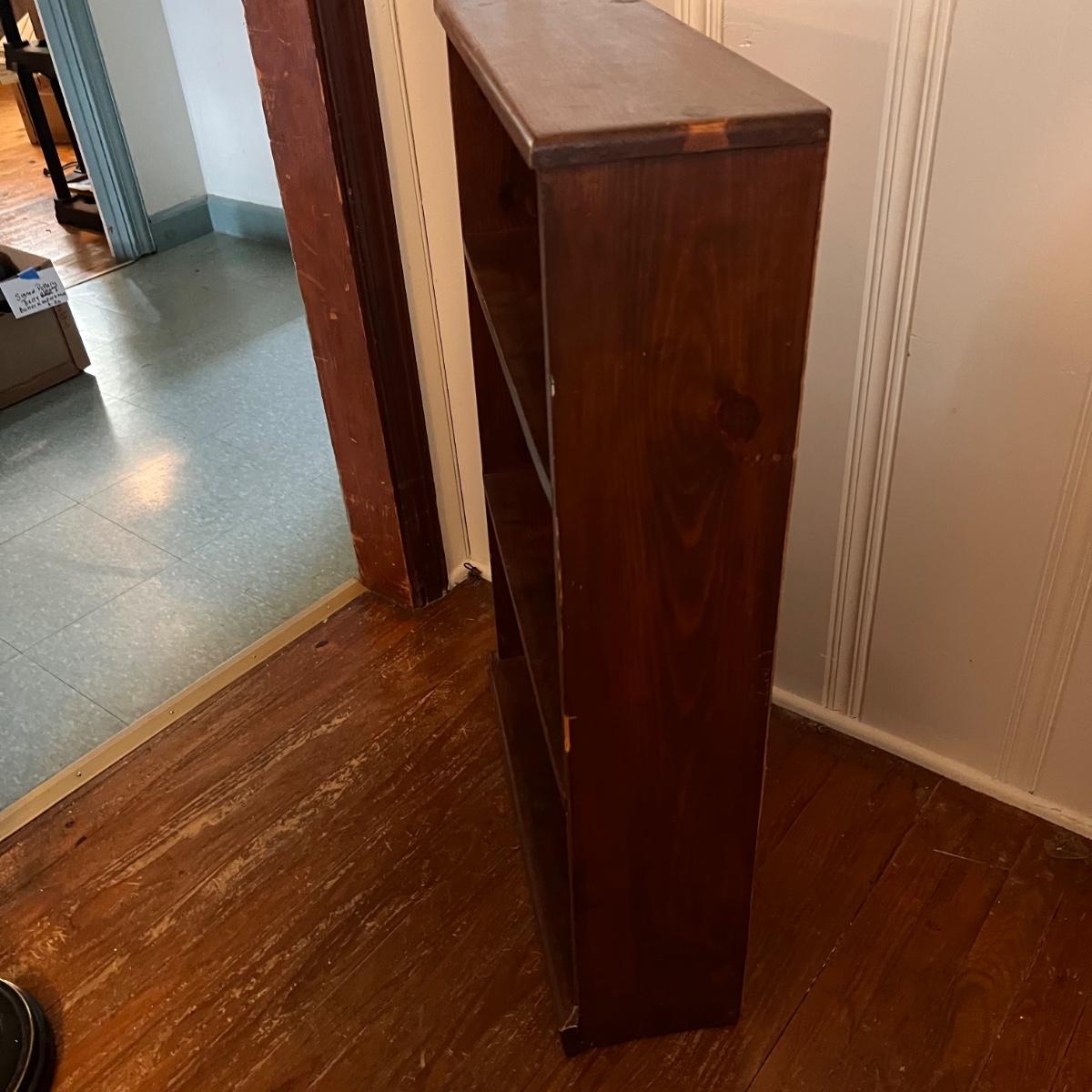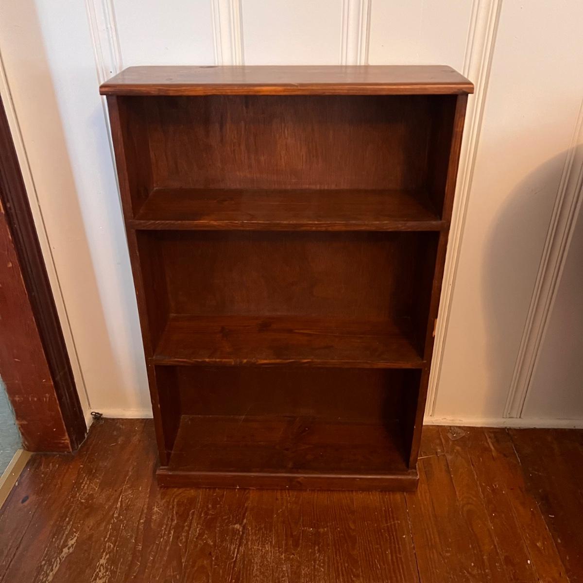This handy sized bookcase measures 24” x 7” x 36”H. Made from a manufactured lightweight wood, this bookcase can stand on its own or be placed on a piece of furniture. Note there are a few nicks.