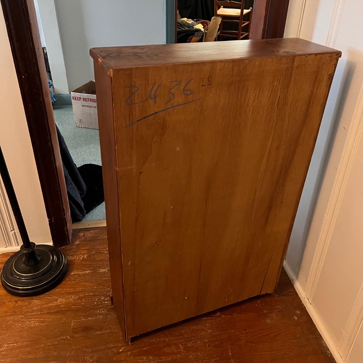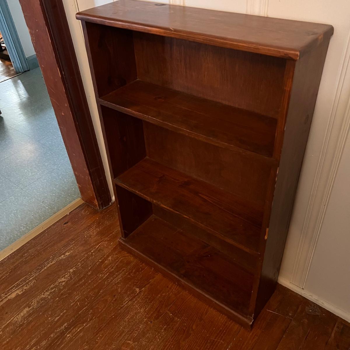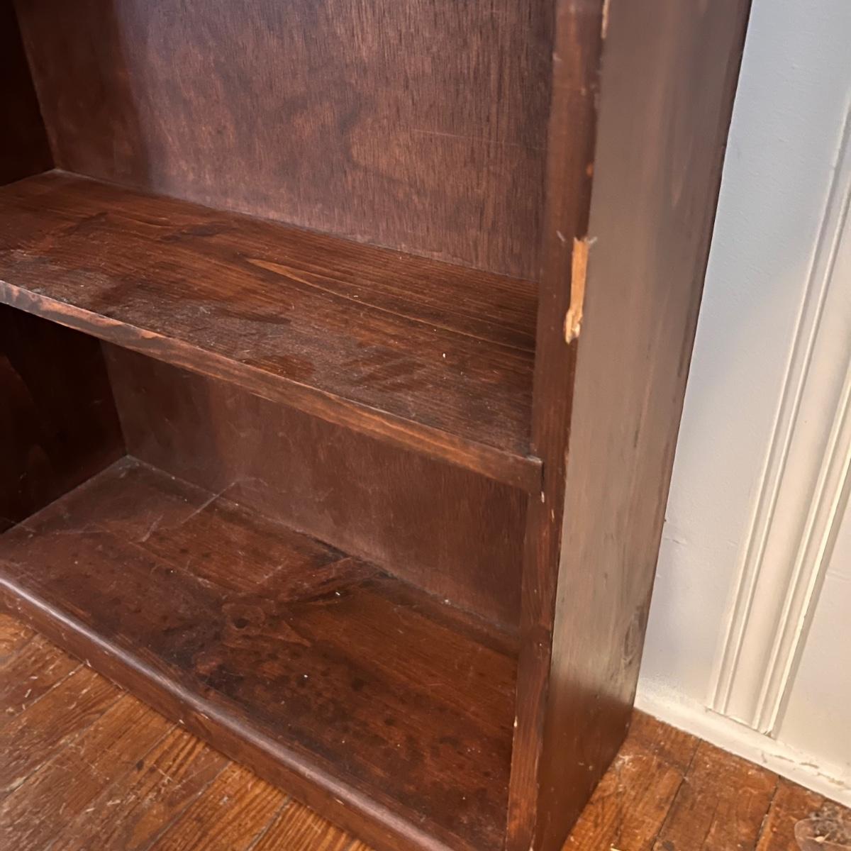 This handy sized bookcase measures 24” x 7” x 36”H. Made from a manufactured lightweight wood, this bookcase can stand on its own or be placed on a piece of furniture. Note there are a few nicks.