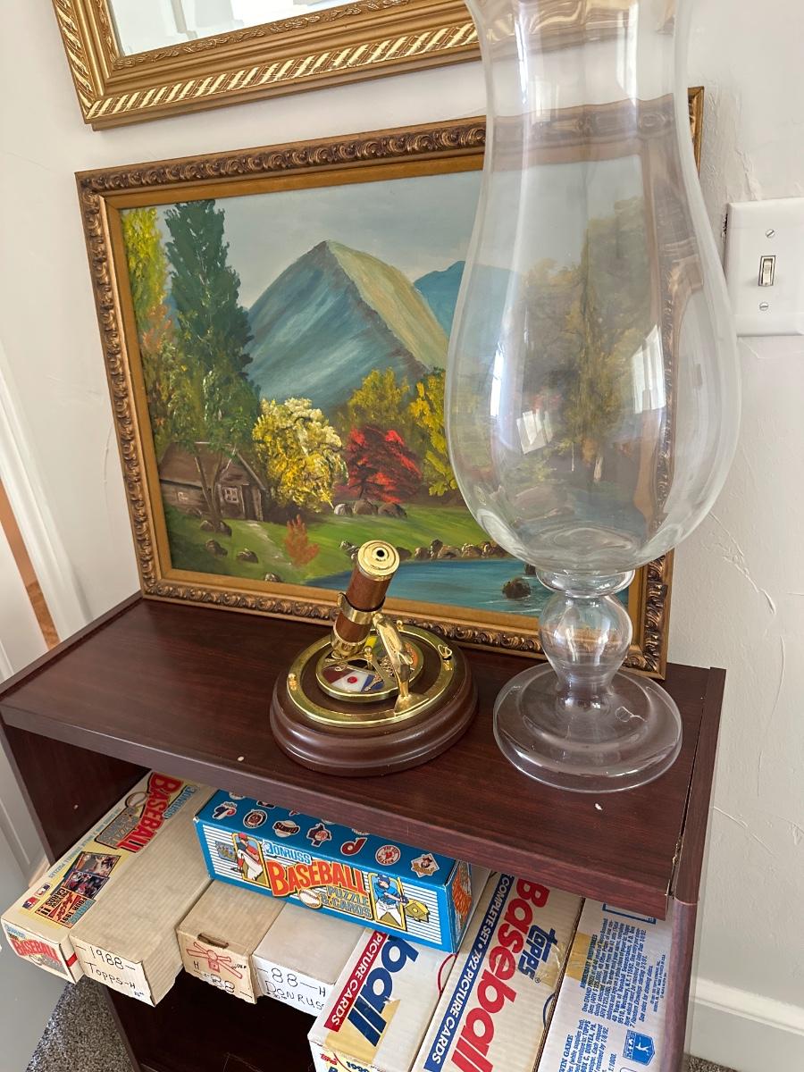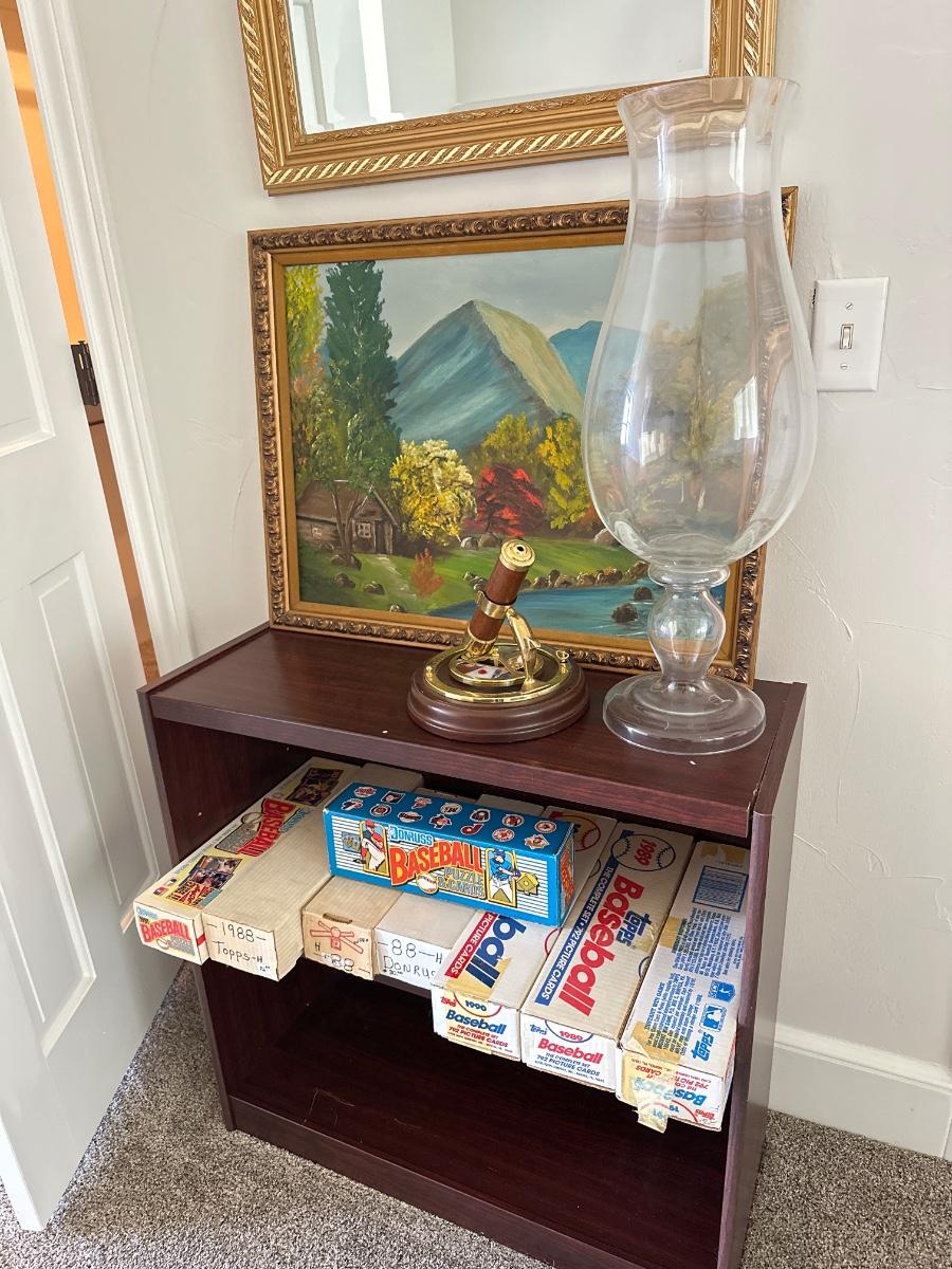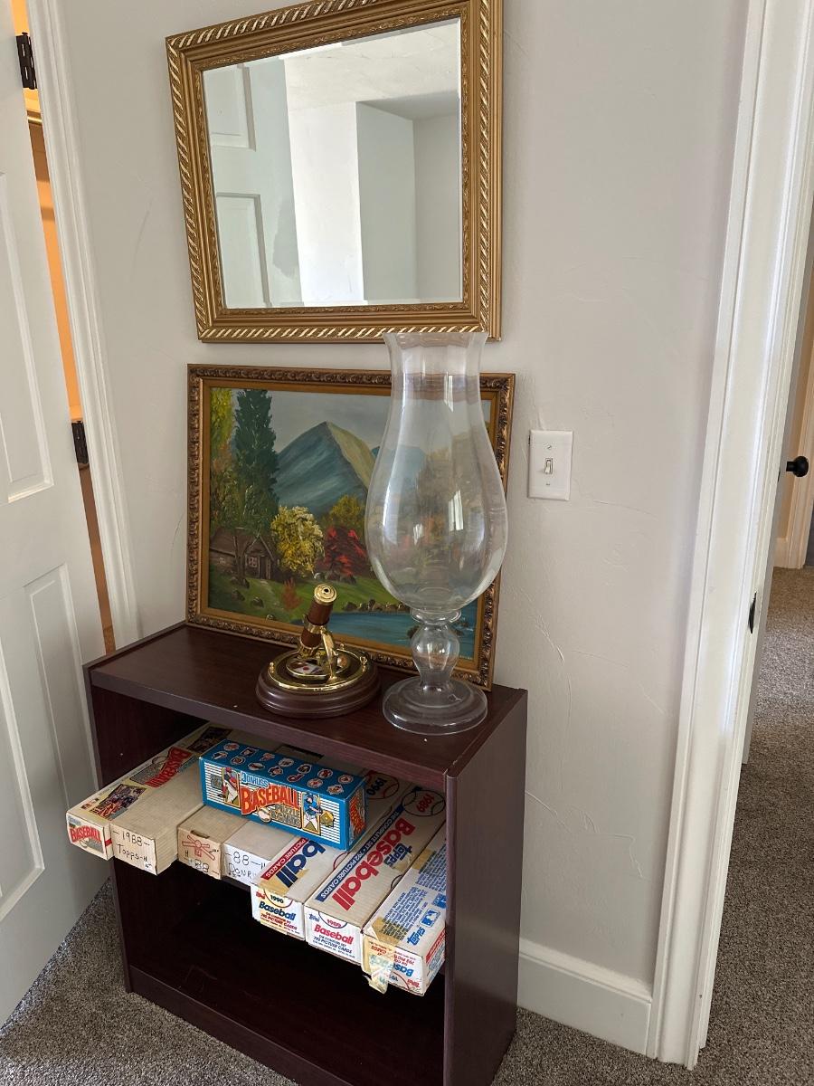 Small bookcase, Oil painting, baseball cards, , Kaleidoscope, and mirror . Everything pictured is included