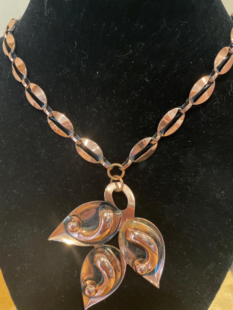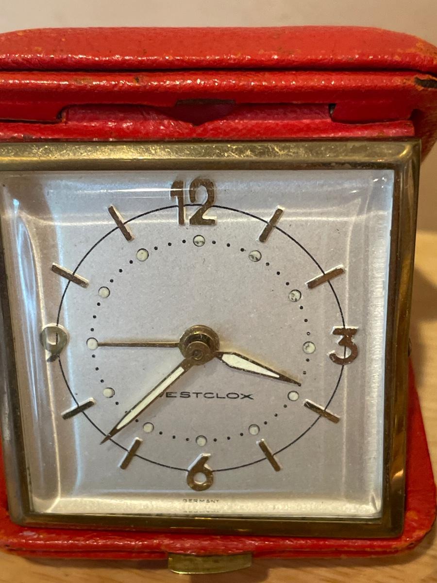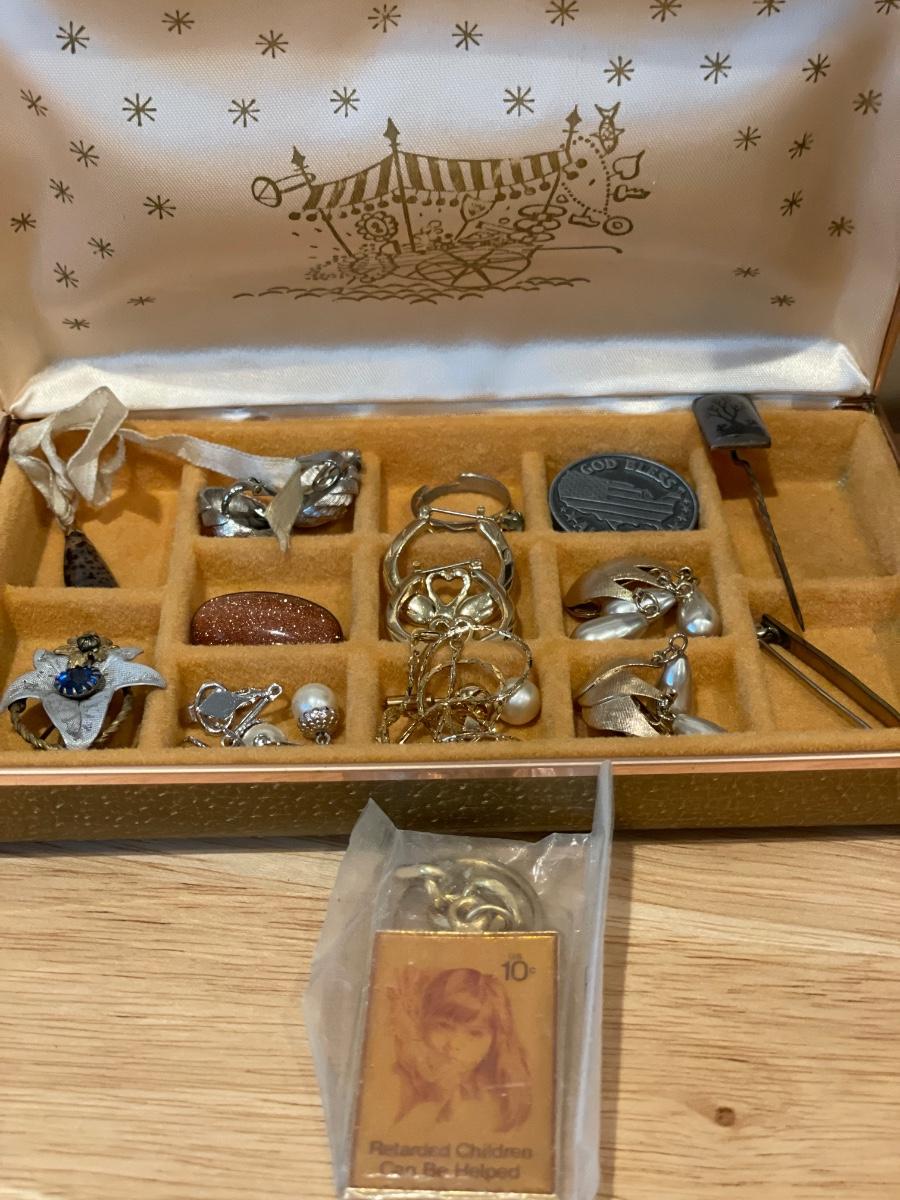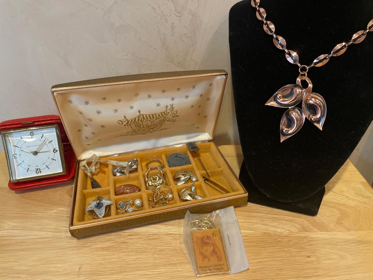 Miscellaneous jewelry in small vintage box with copper tone necklace, and traveling clock