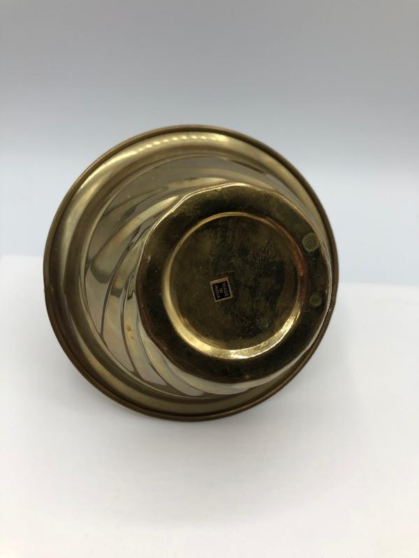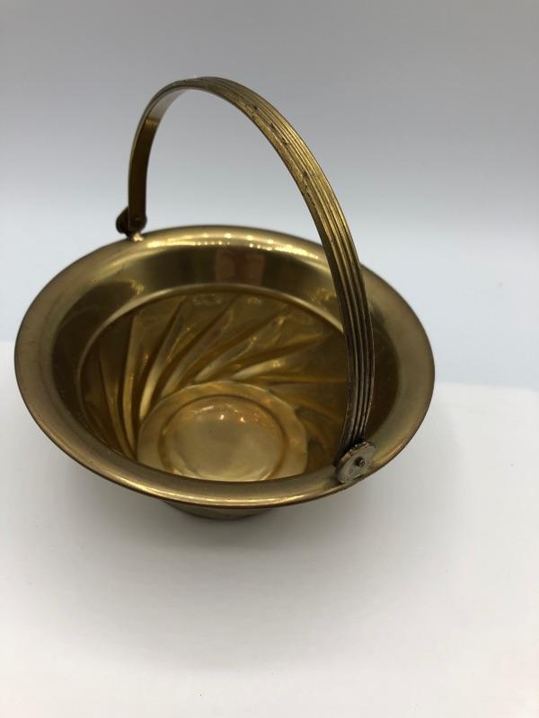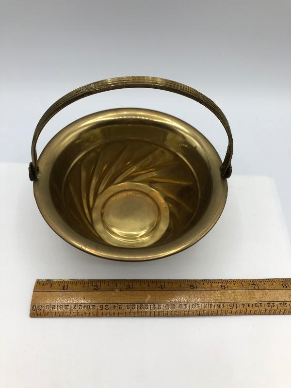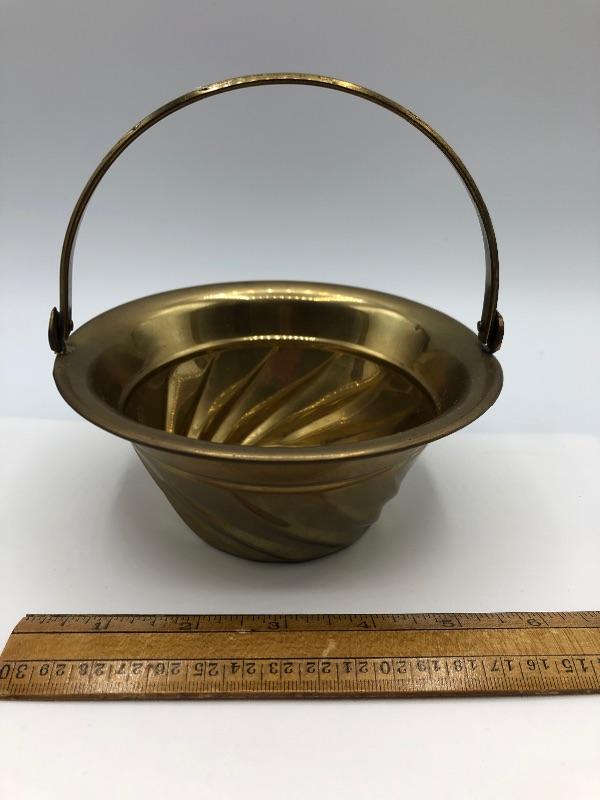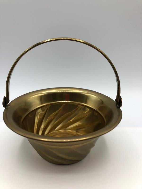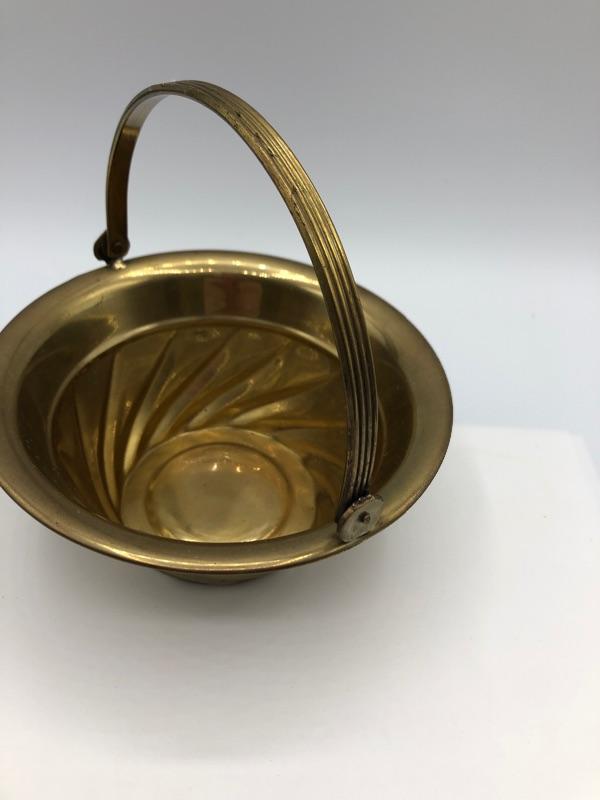 Small brass basket. Has a swirl design to the basket part. Moveable handle. About 6" wide. Made in India.