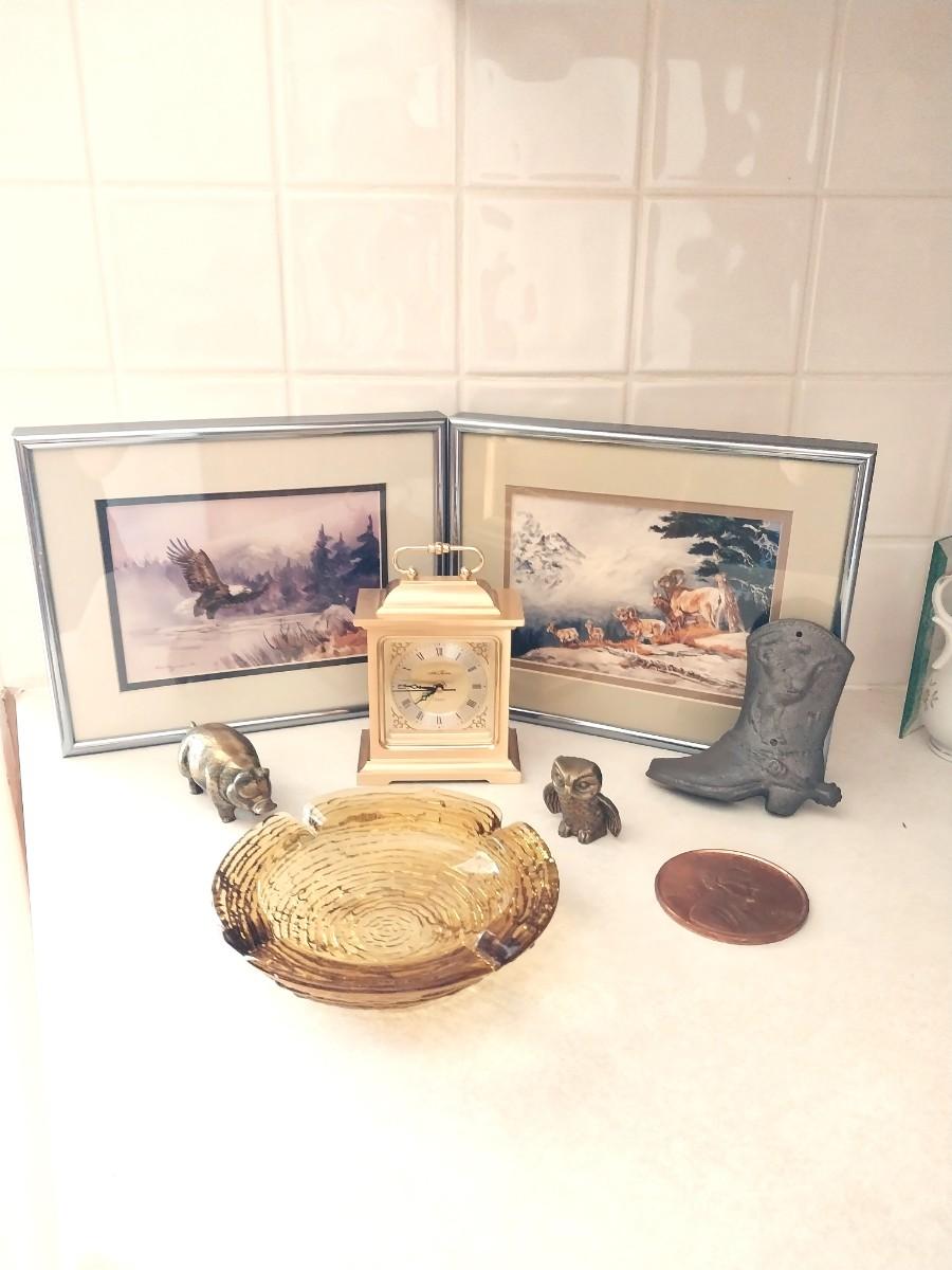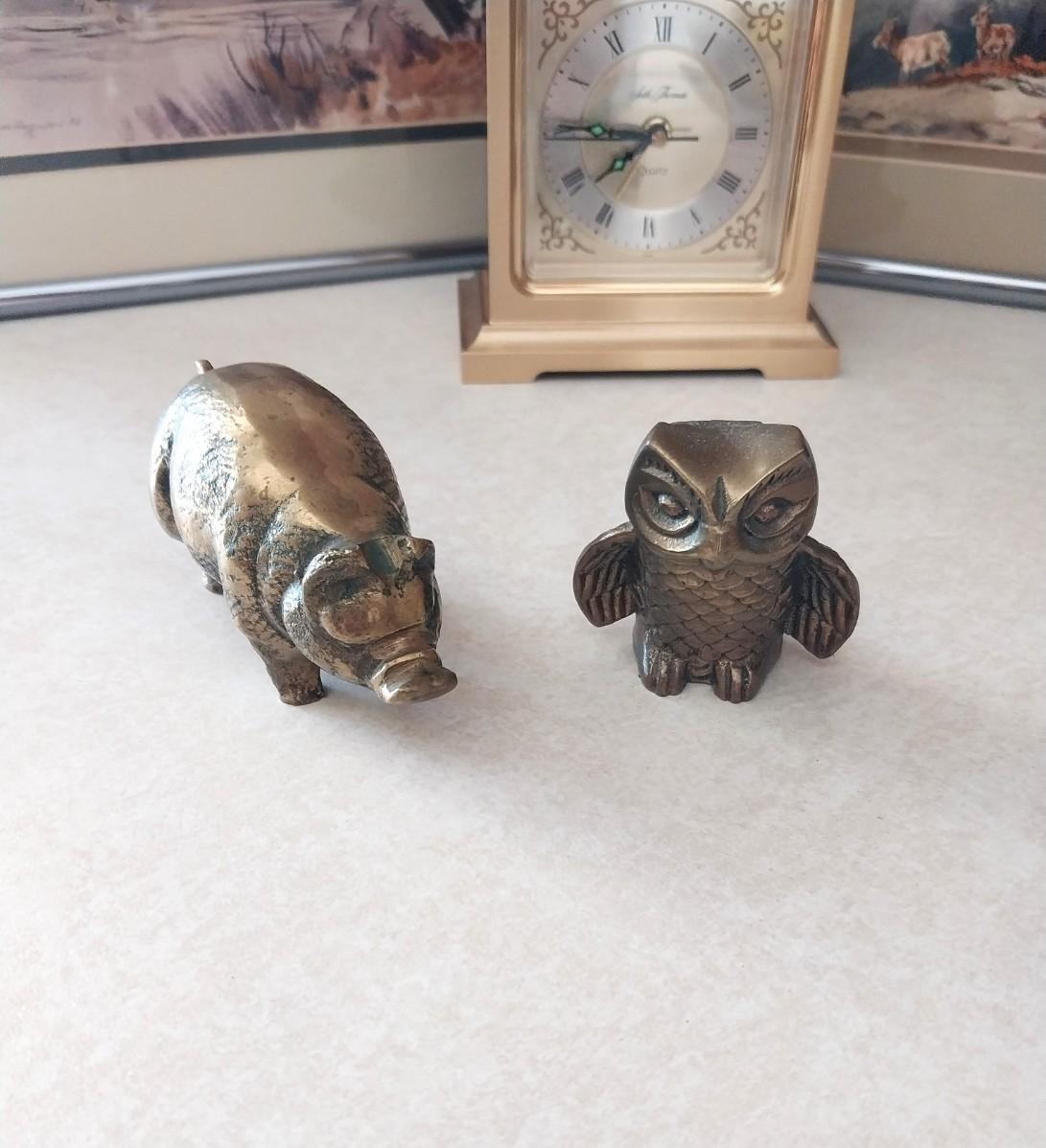 SMALL BRASS PIG AND OWL-LARGE CENT-VINTAGE GLASS ASHTRAY-MORE
