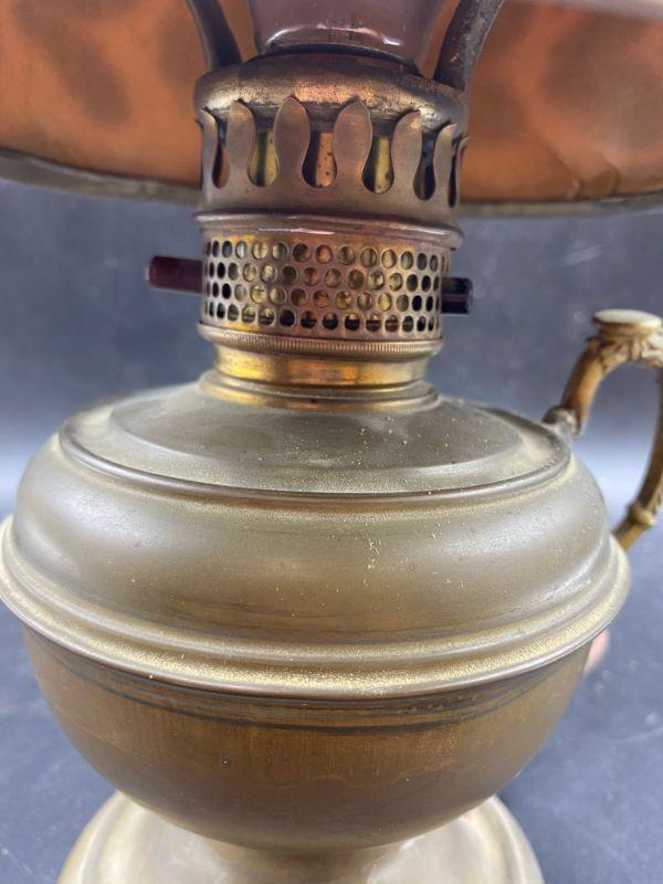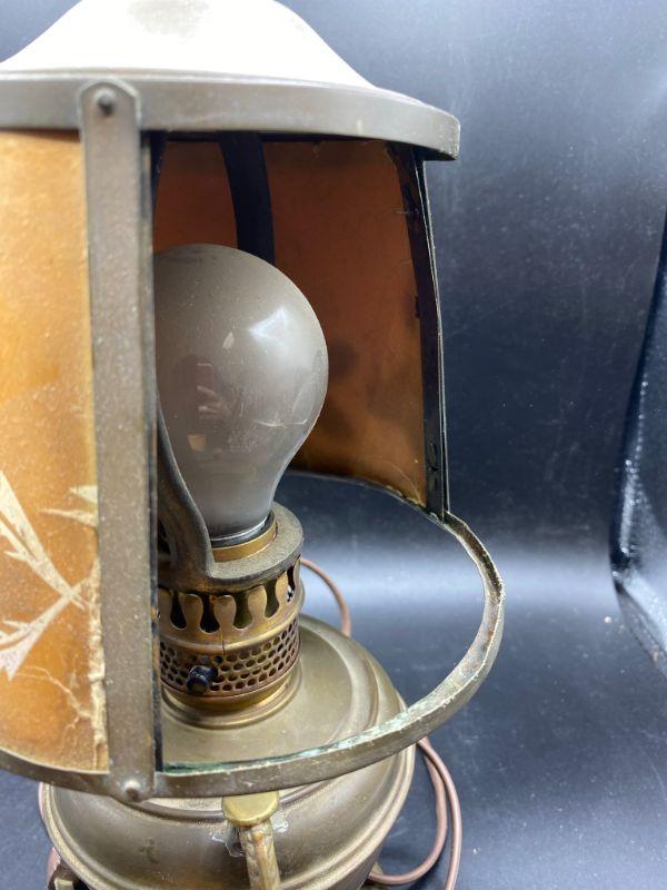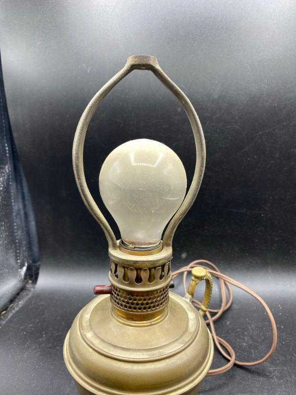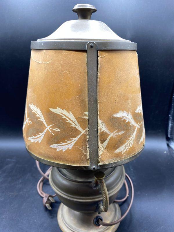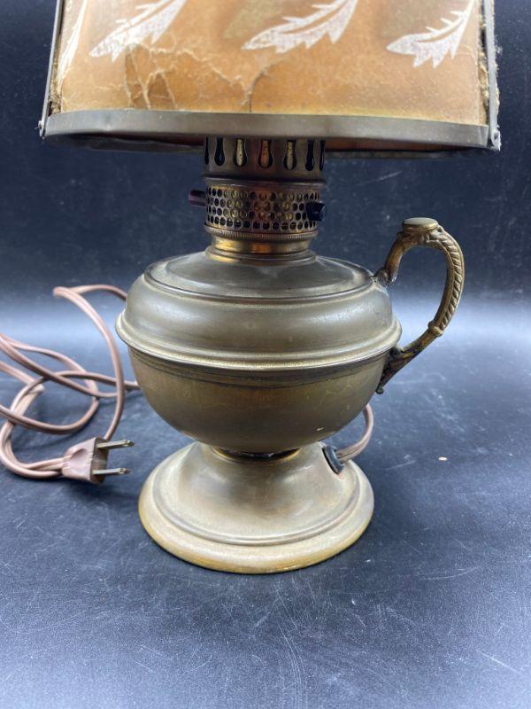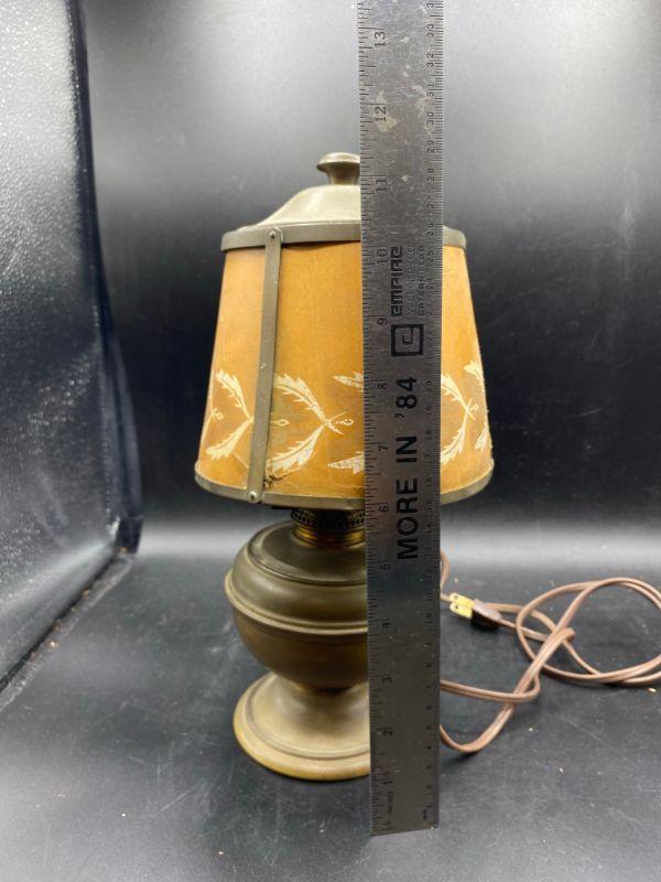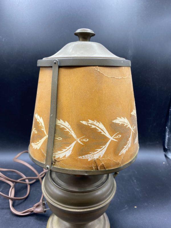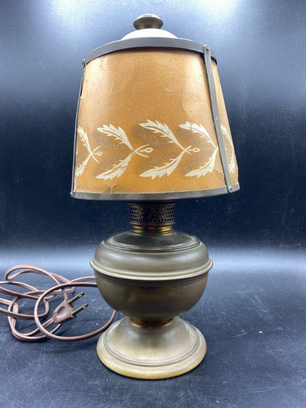 Small vintage brass table lamp. Shade has cardboard inserts that could easily be changed. Push button on/off. Untested.