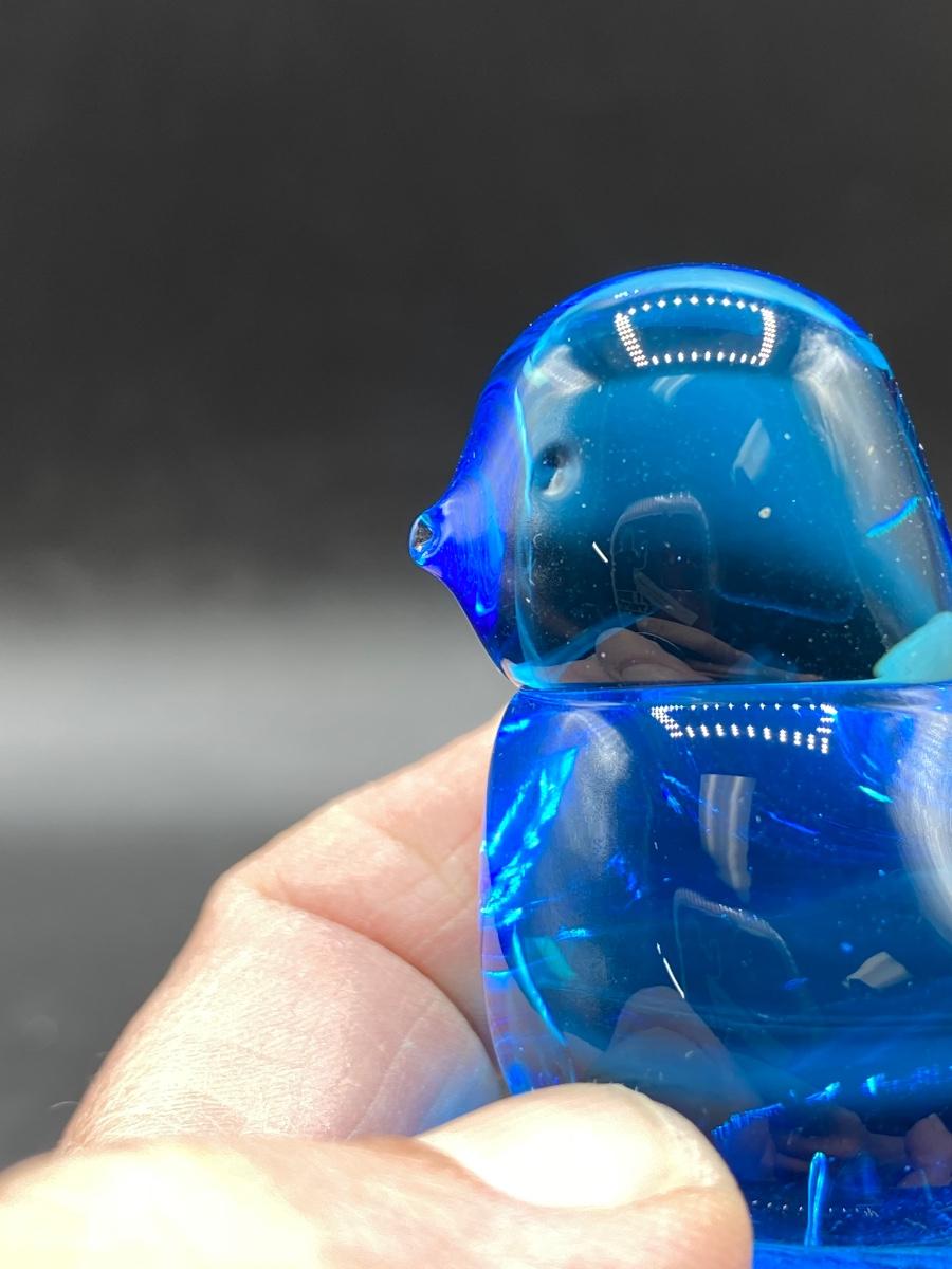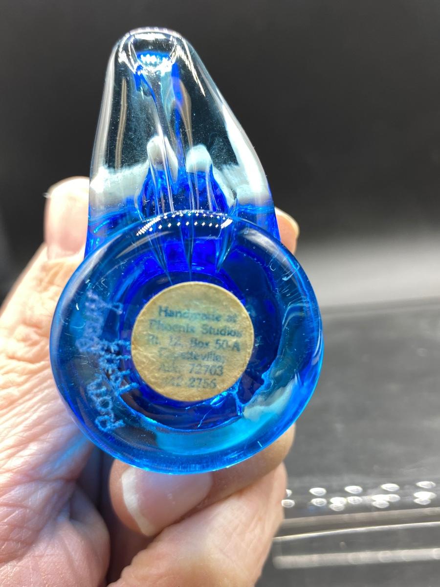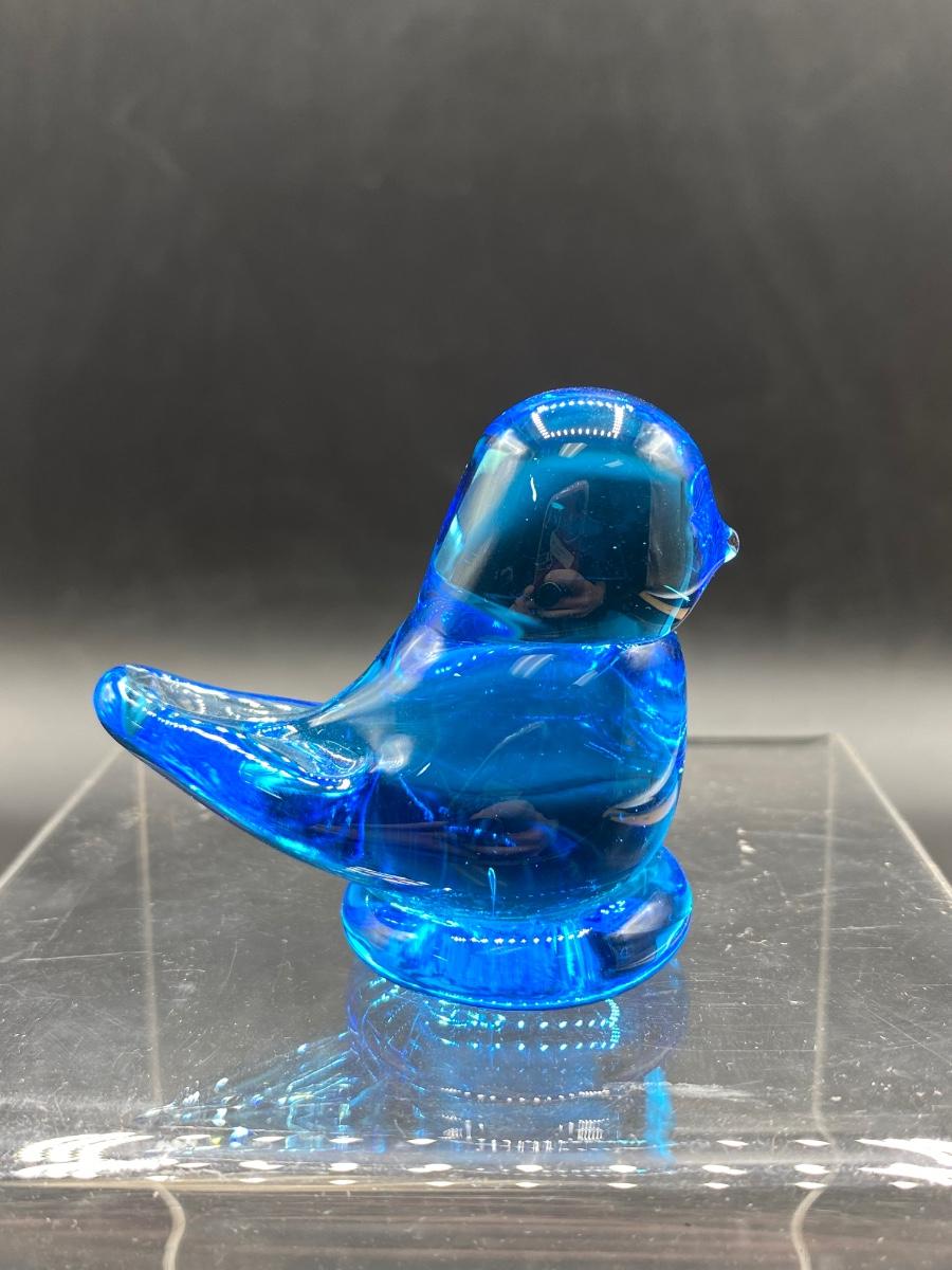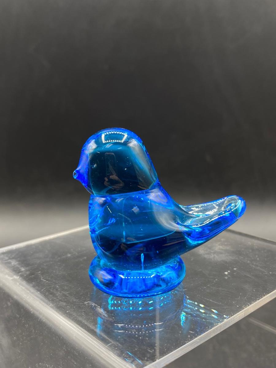 Small blown glass bird figurine. Bright blue glass. About 2" size. Has original sticker still on the bottom, a bit hard to read and is signed and dated as well. The point of the beak looks to be chipped.