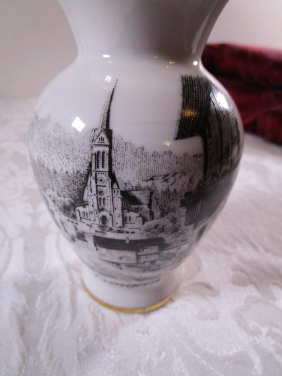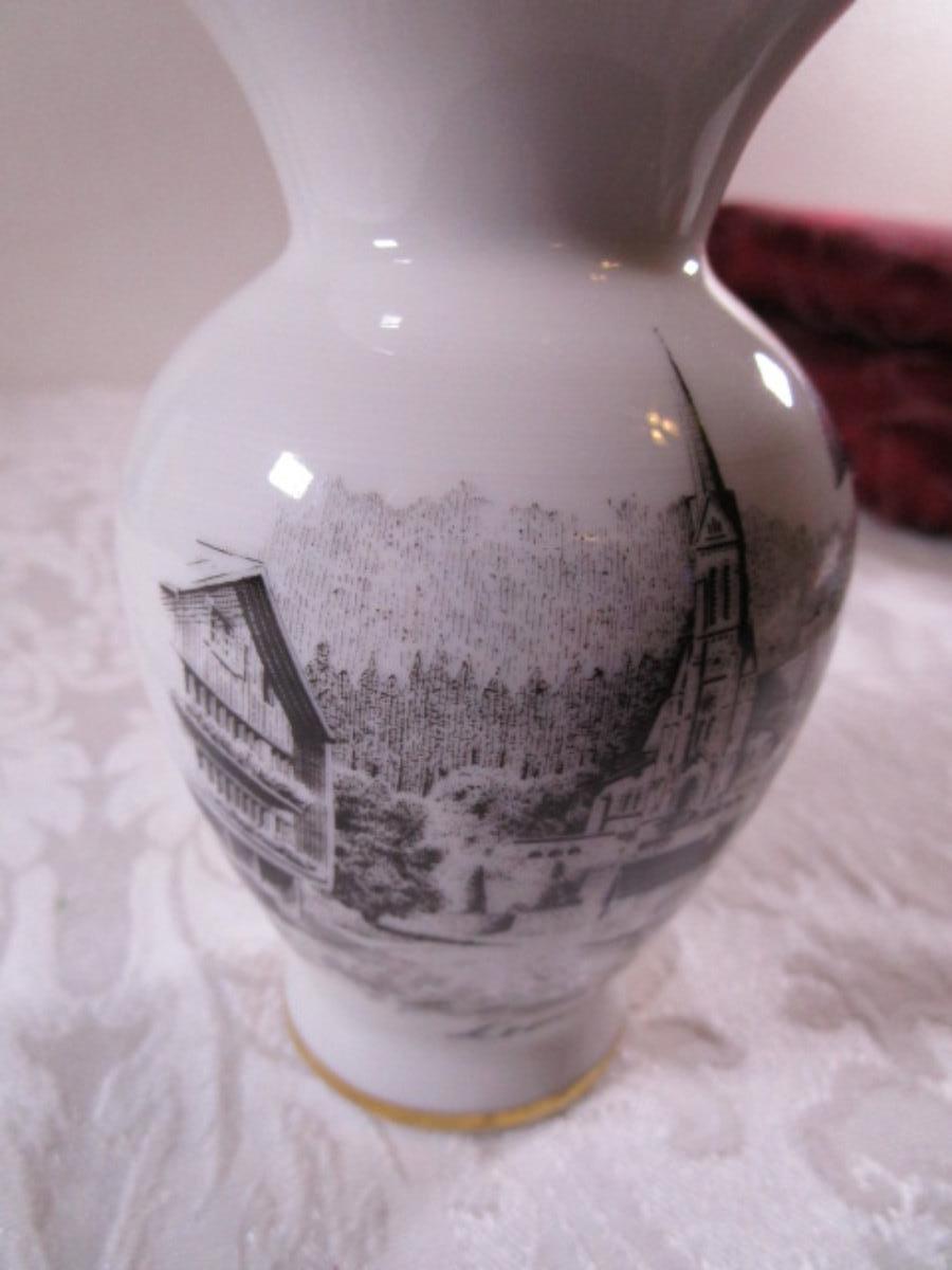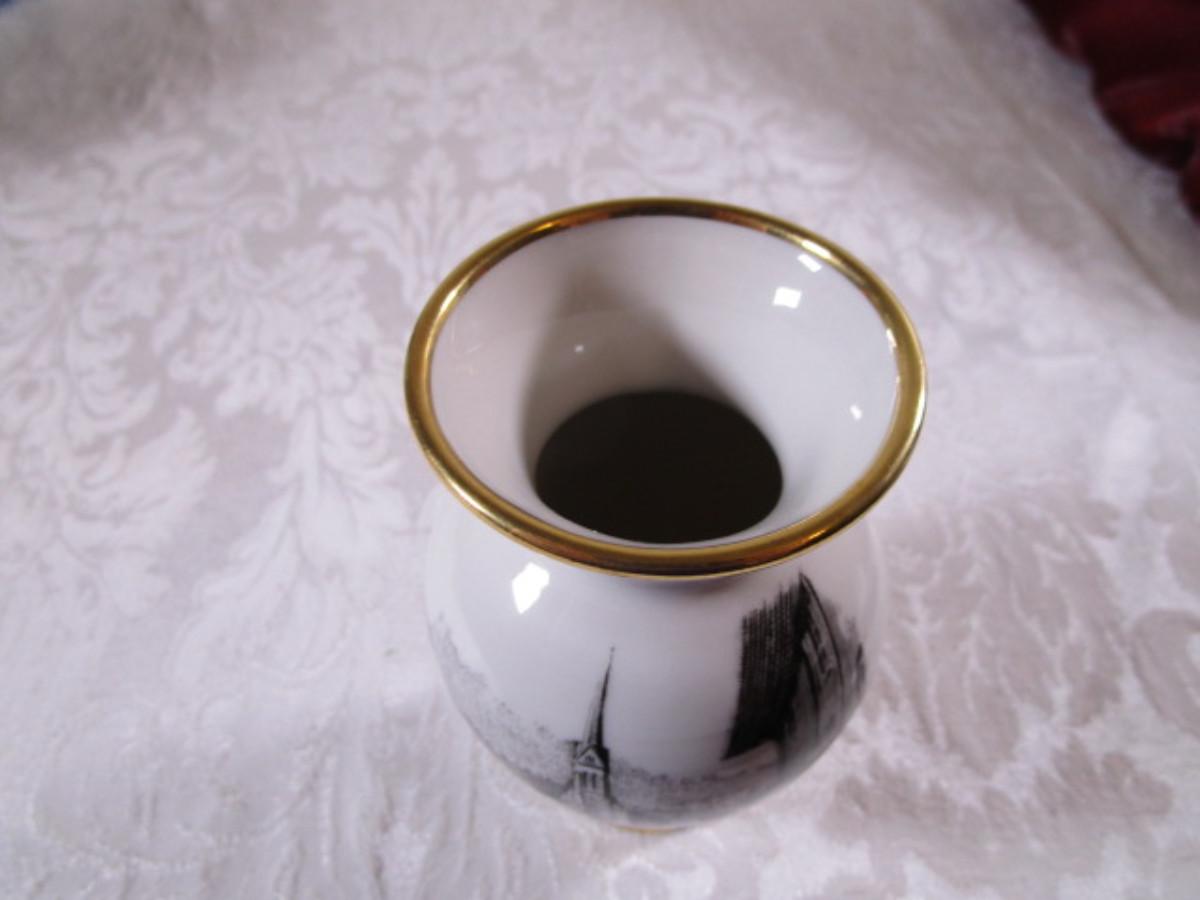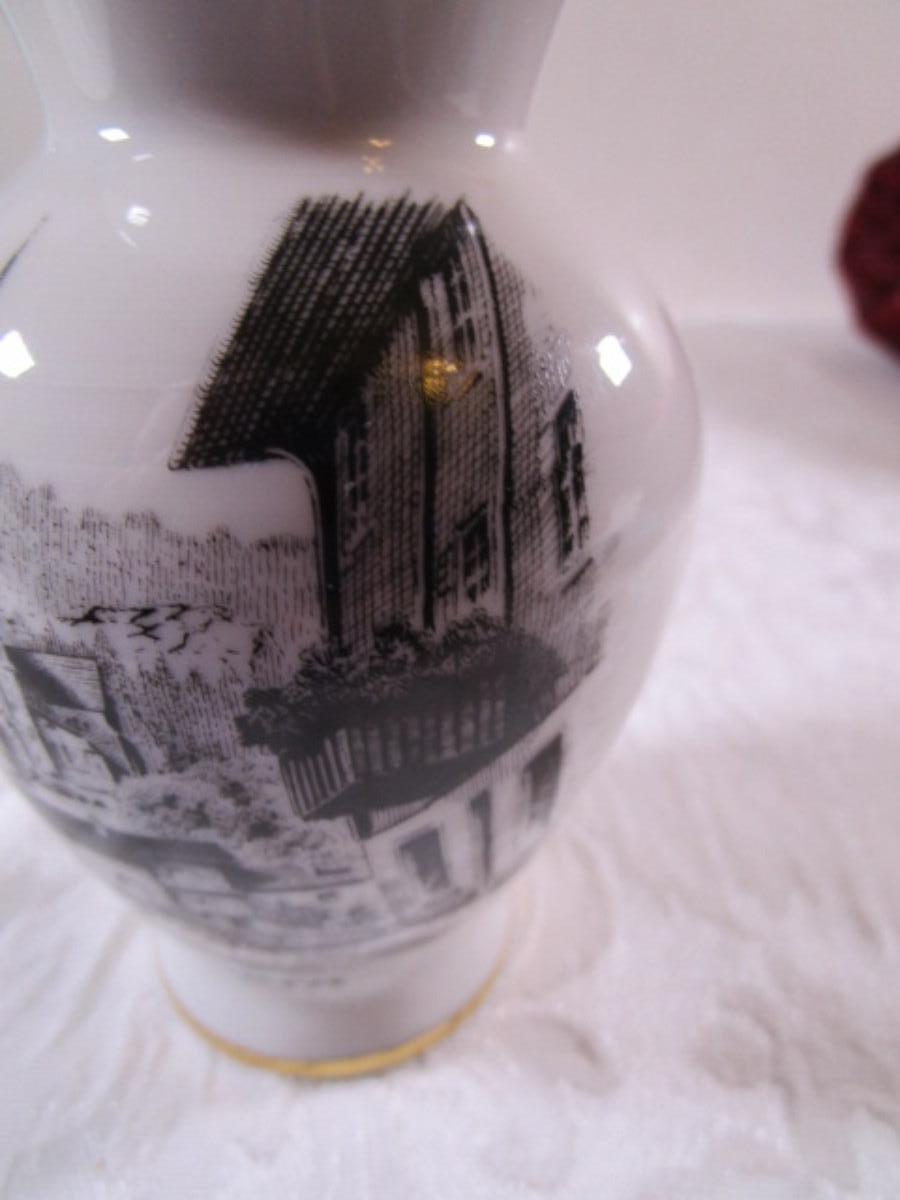 Small bud vase with cityscape on it
