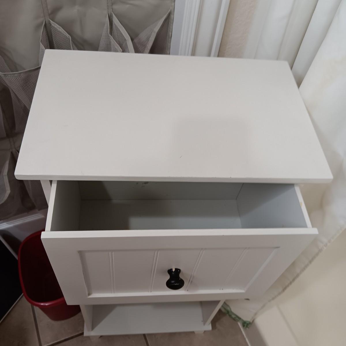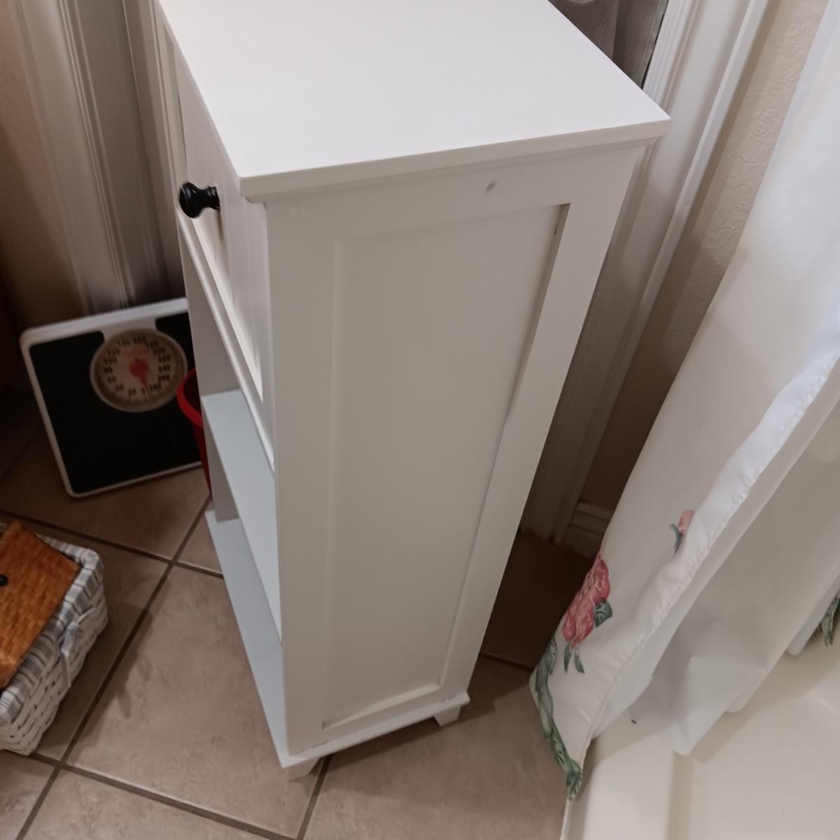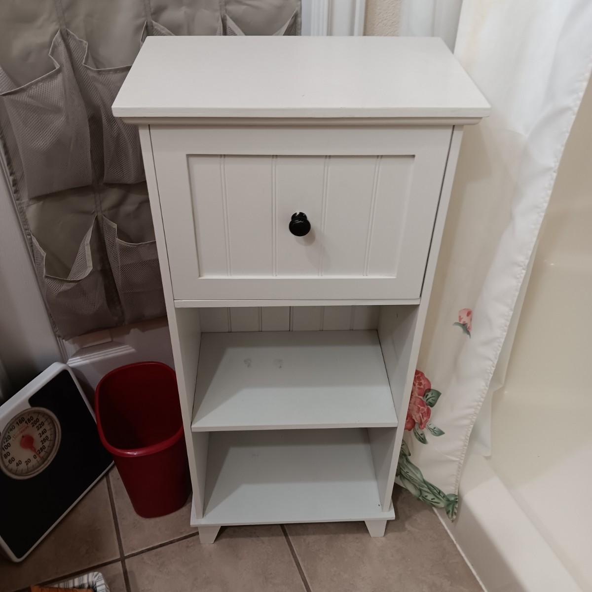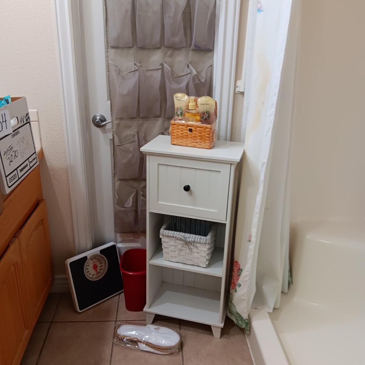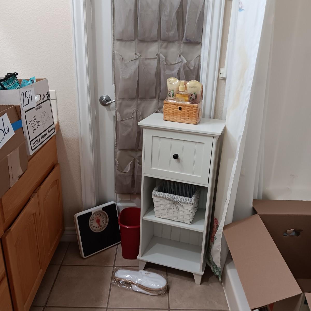 SMALL CABINET WITH DRAWER, SCALE, SLIPPERS OVER THE DOOR SHOE ORGANIZER AND MORE