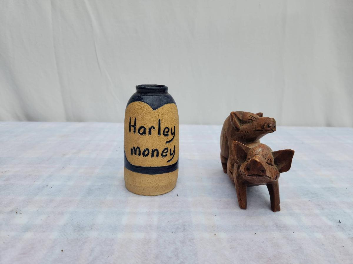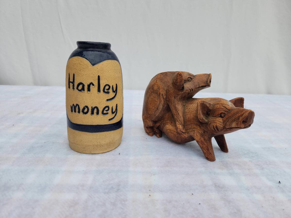 A small ceramic jar labeled 'Harley money,' featuring a yellow body with a blue heart and band accent, alongside a wooden figurine of two pigs in a playful pose. The jar serves as a coin holder or decoration, while the wooden carving showcases detailed craftsmanship. Condition is used with minor wear visible.