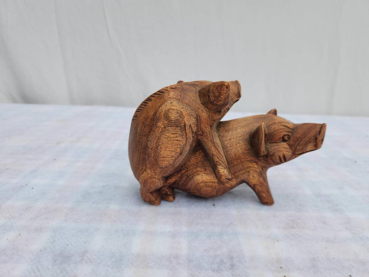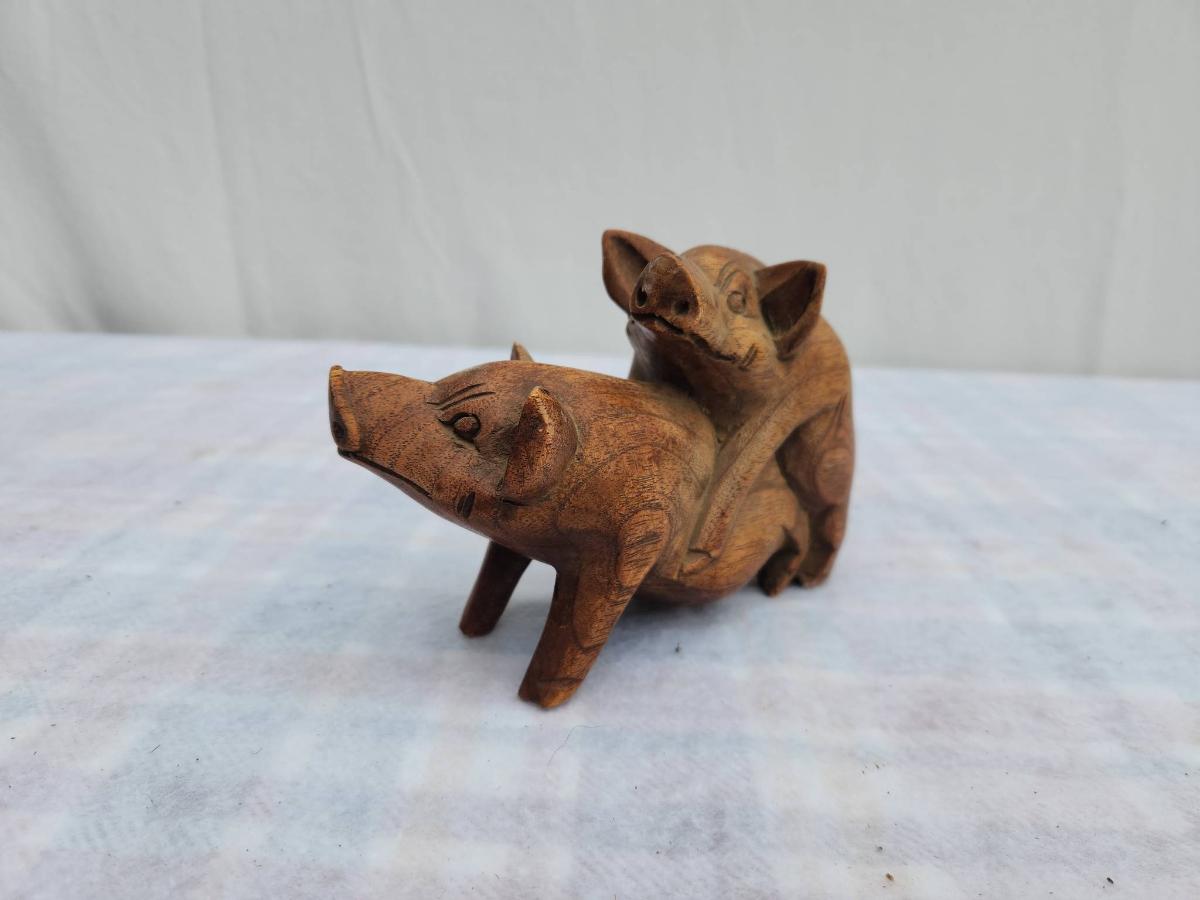 Small Ceramic Money Jar and Wooden Carved Pig Figurine Pair